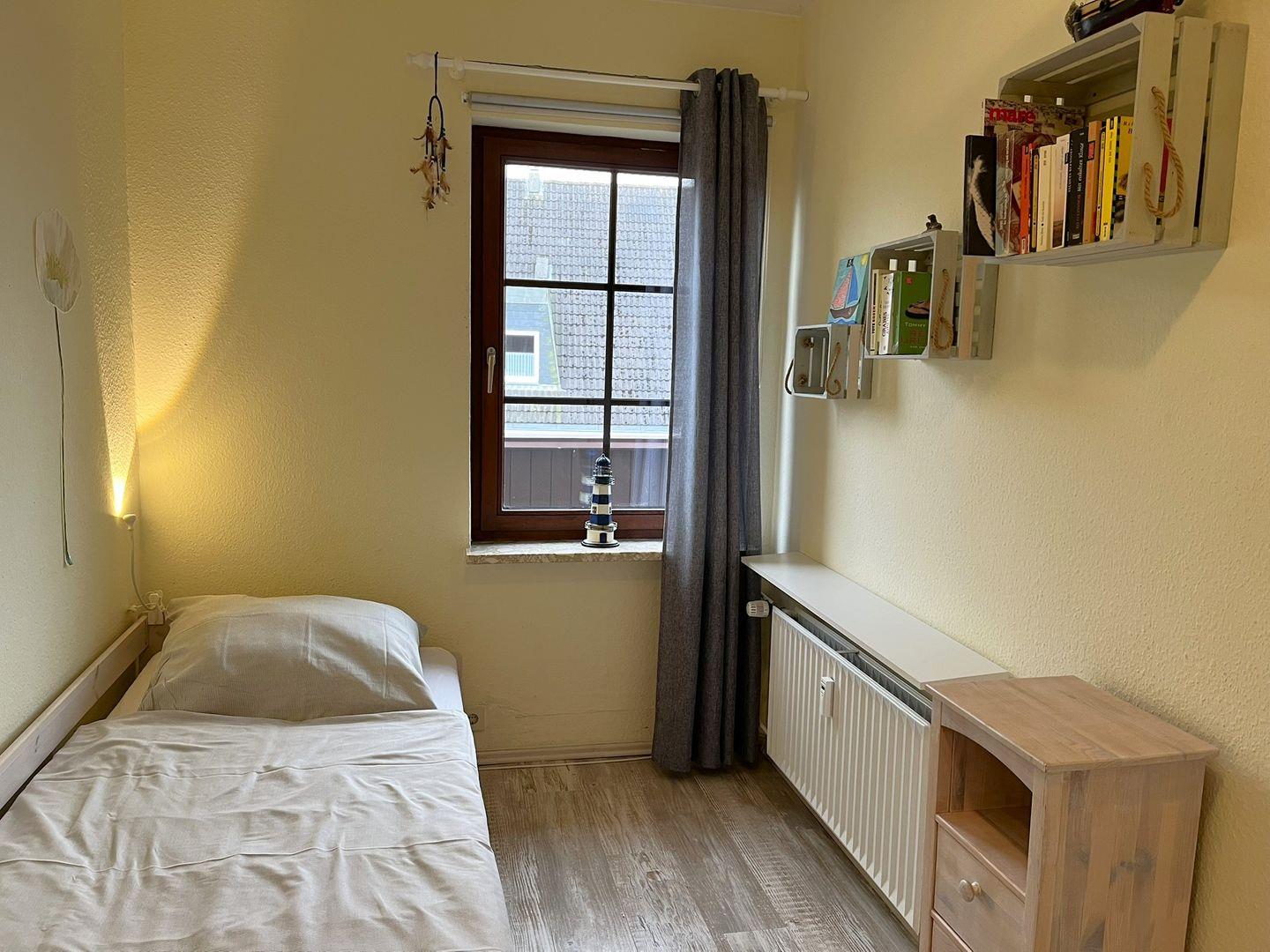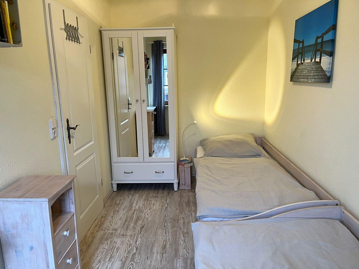 In dem separaten Schlafzimmer stehen zwei Einzelbetten und ein Kleiderschrank für Sie bereit. Bei einem der Einzelbetten kann man noch ein zusätzliches Bett herausziehen.