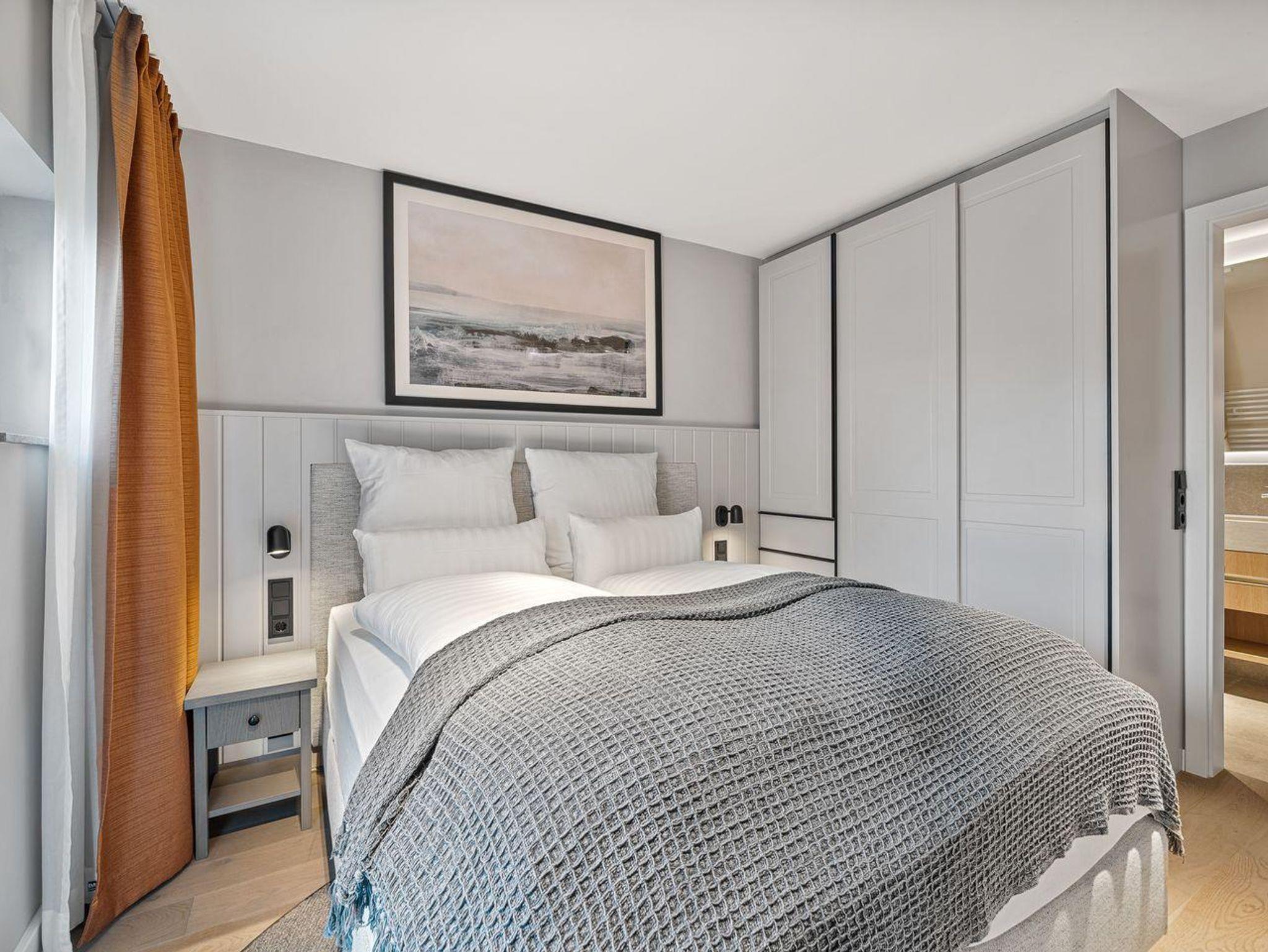 Ein ruhiges Schlafzimmer mit erstklassigem Boxspinrgbett (1,80 x 2,00) bietet Rückzugsmöglichkeiten für erholsame Nächte. Die Fußbodenheizung sorgt in der kalten Jahreszeit für wohlige Wärme, während der Sichtschutz an allen Fenstern für Privatsphäre während Ihres Aufenthalts sorgt. Vom Schlafzimmer aus steht Ihnen außerdem ein eigenes Bad mit Dusche zur Verfügung.