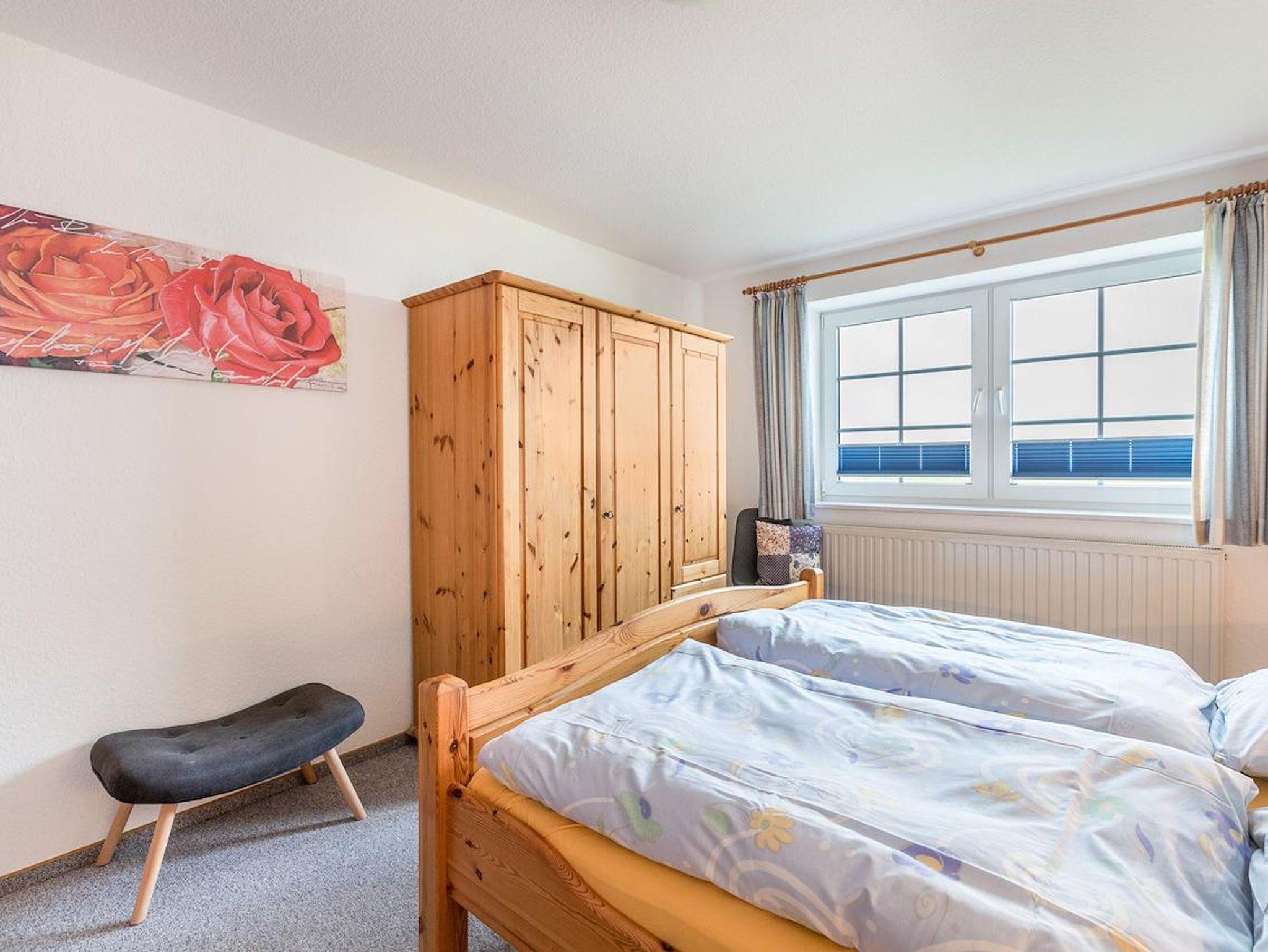Im Obergeschoss befindet sich ein Schlafzimmer mit einem Doppelbett und einem Einzelbett. Das grosszügige Badezimmer mit Dusche und WC hat ein Aussenfenster.