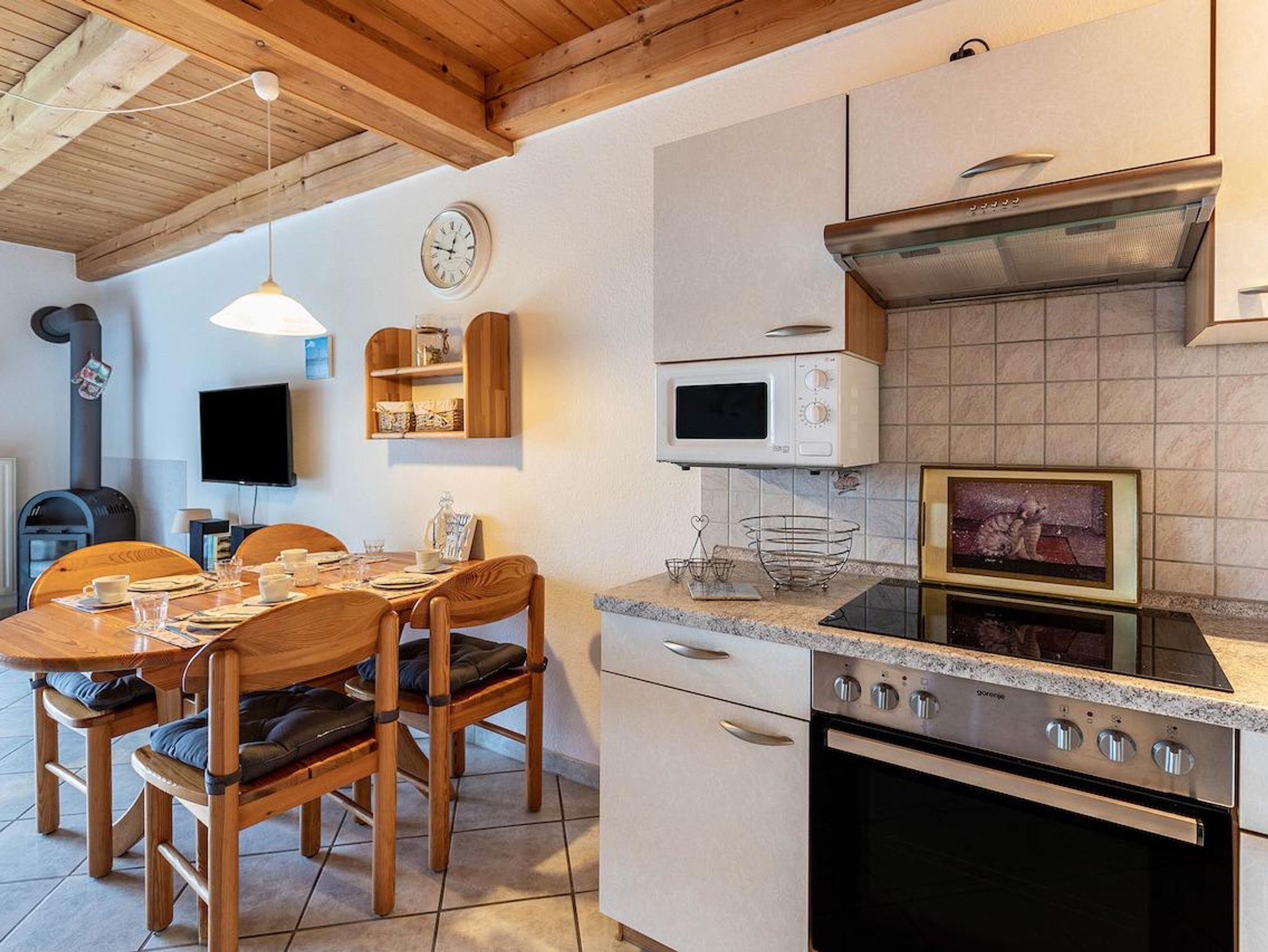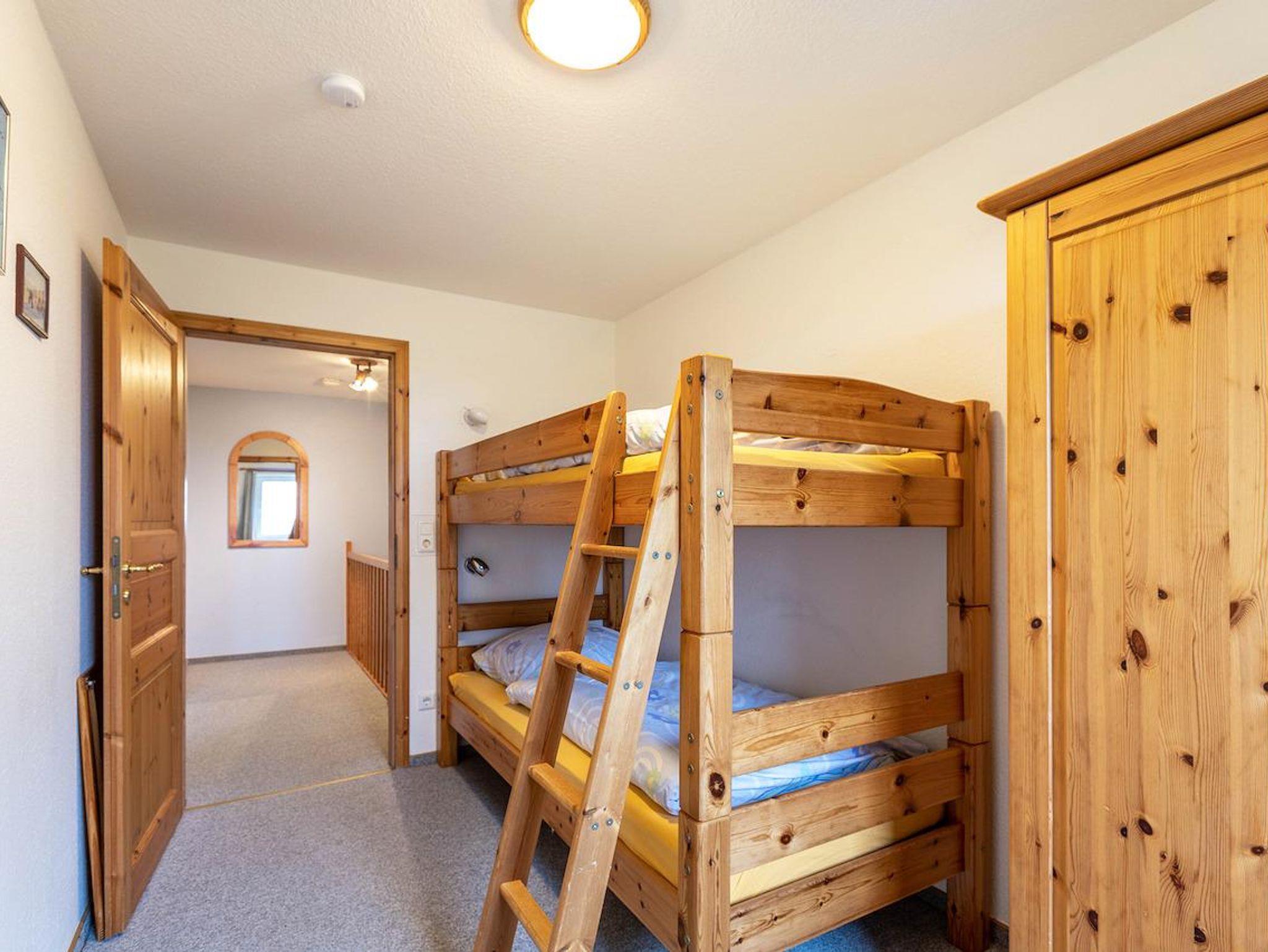 Im Obergeschoss befindet sich ein Schlafzimmer mit einem Doppelbett und ein Kinderzimmer mit einem Etagenbett. Auch befindet sich im Obergeschoss das grosszügige Badezimmer mit Dusche und WC. Diese Wohnung hat im Wohnbereich einen Kaminofen.