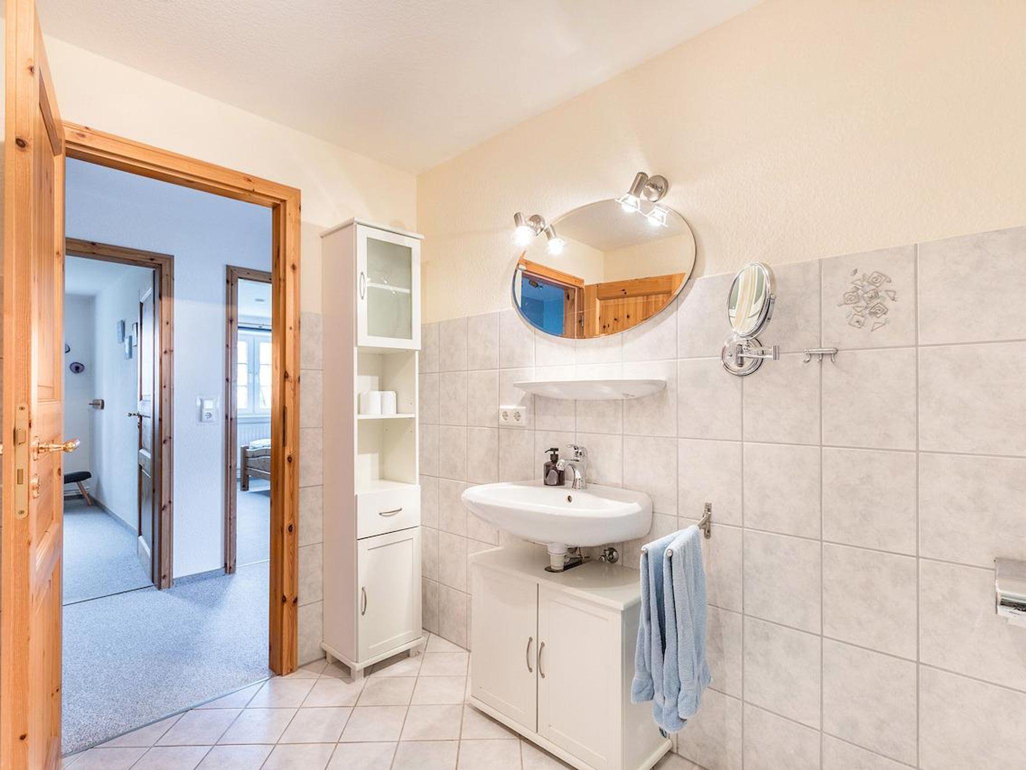 Im Obergeschoss befindet sich zwei Schlafzimmer mit je einem Doppelbett und ein Kinderzimmer mit einem Etagenbett. Auch befindet sich im Obergeschoss das grosszügige Badezimmer mit Dusche und WC. Diese Wohnung hat im Wohnbereich einen Kaminofen.