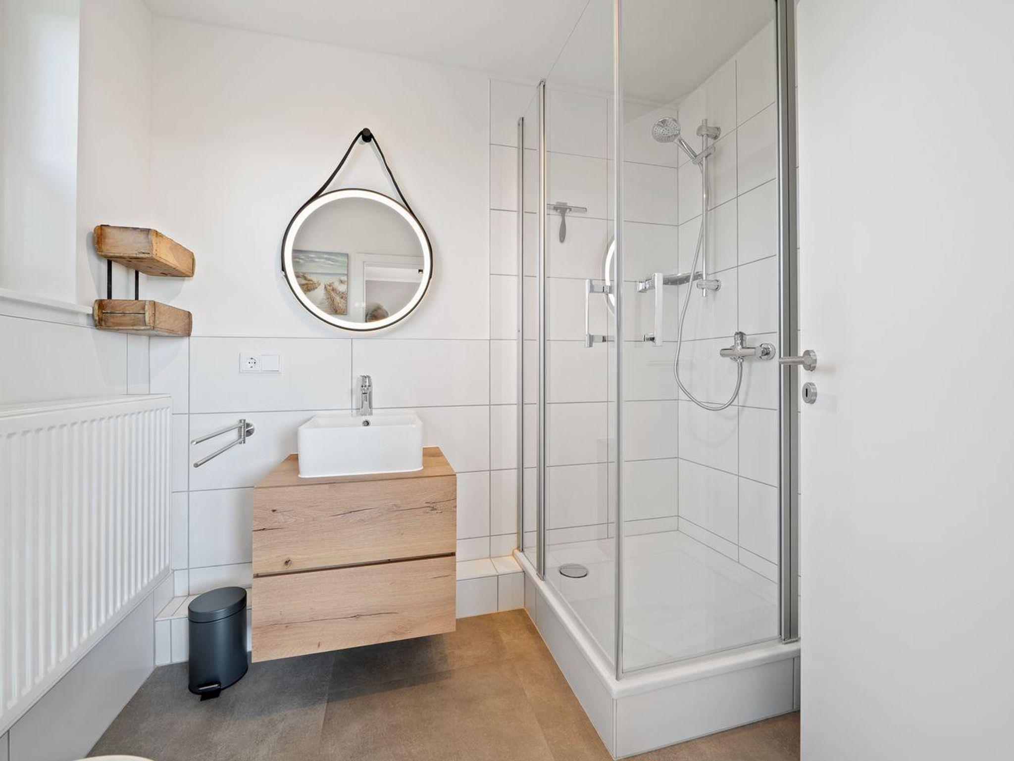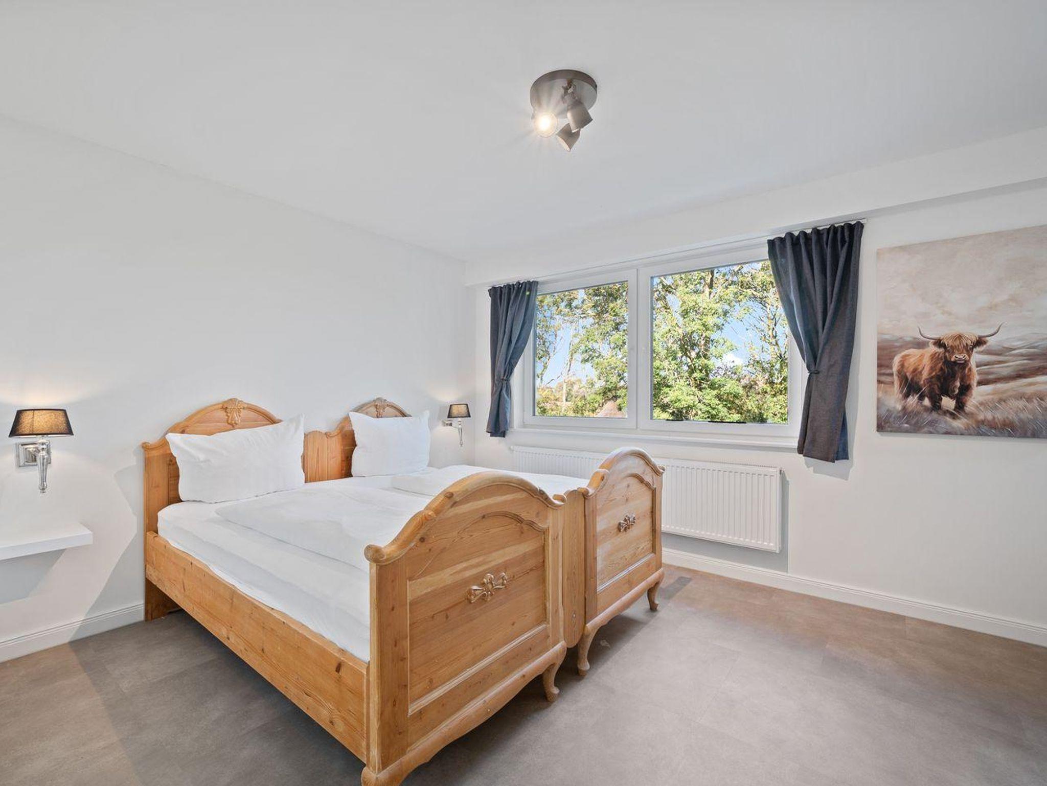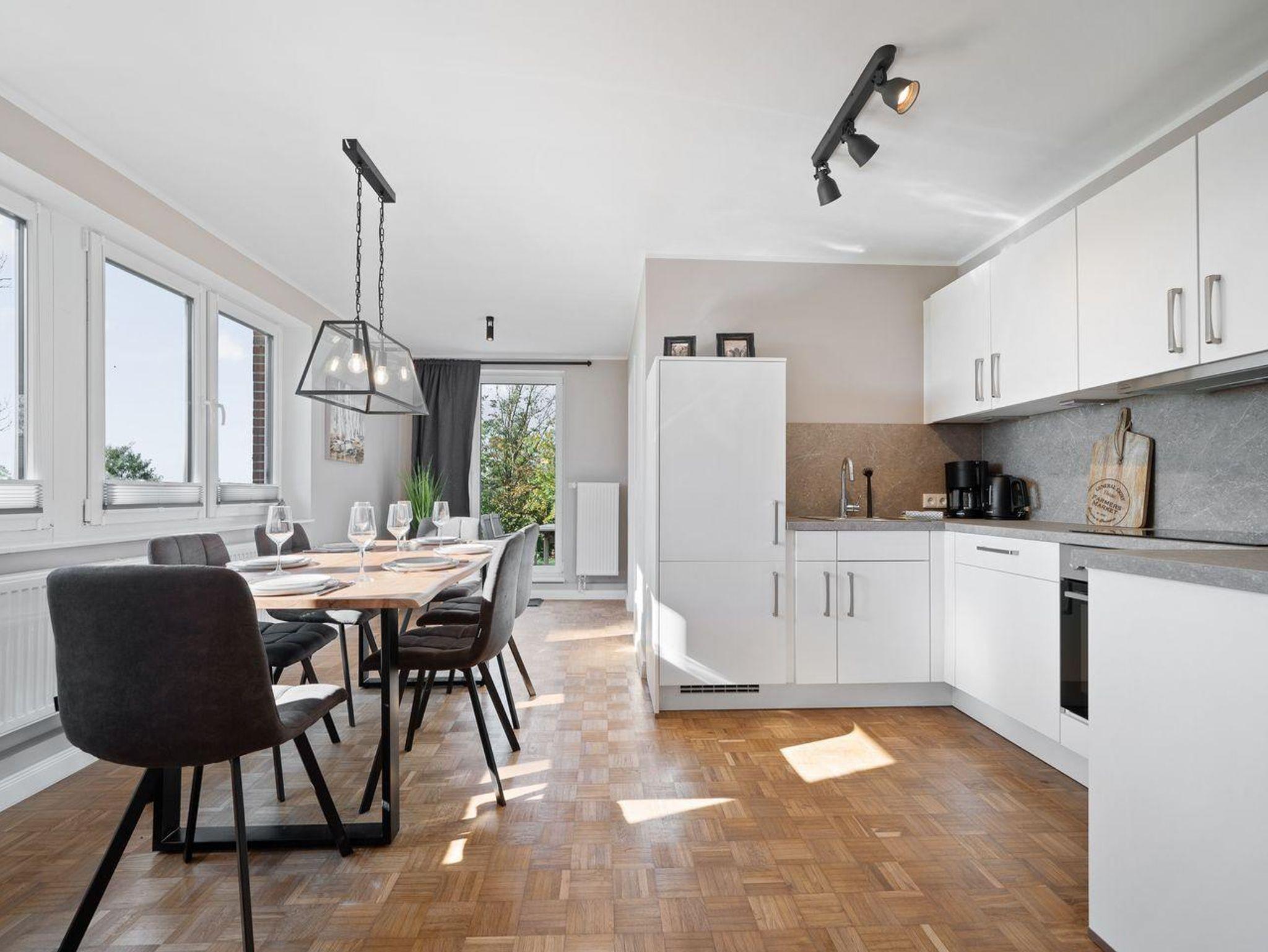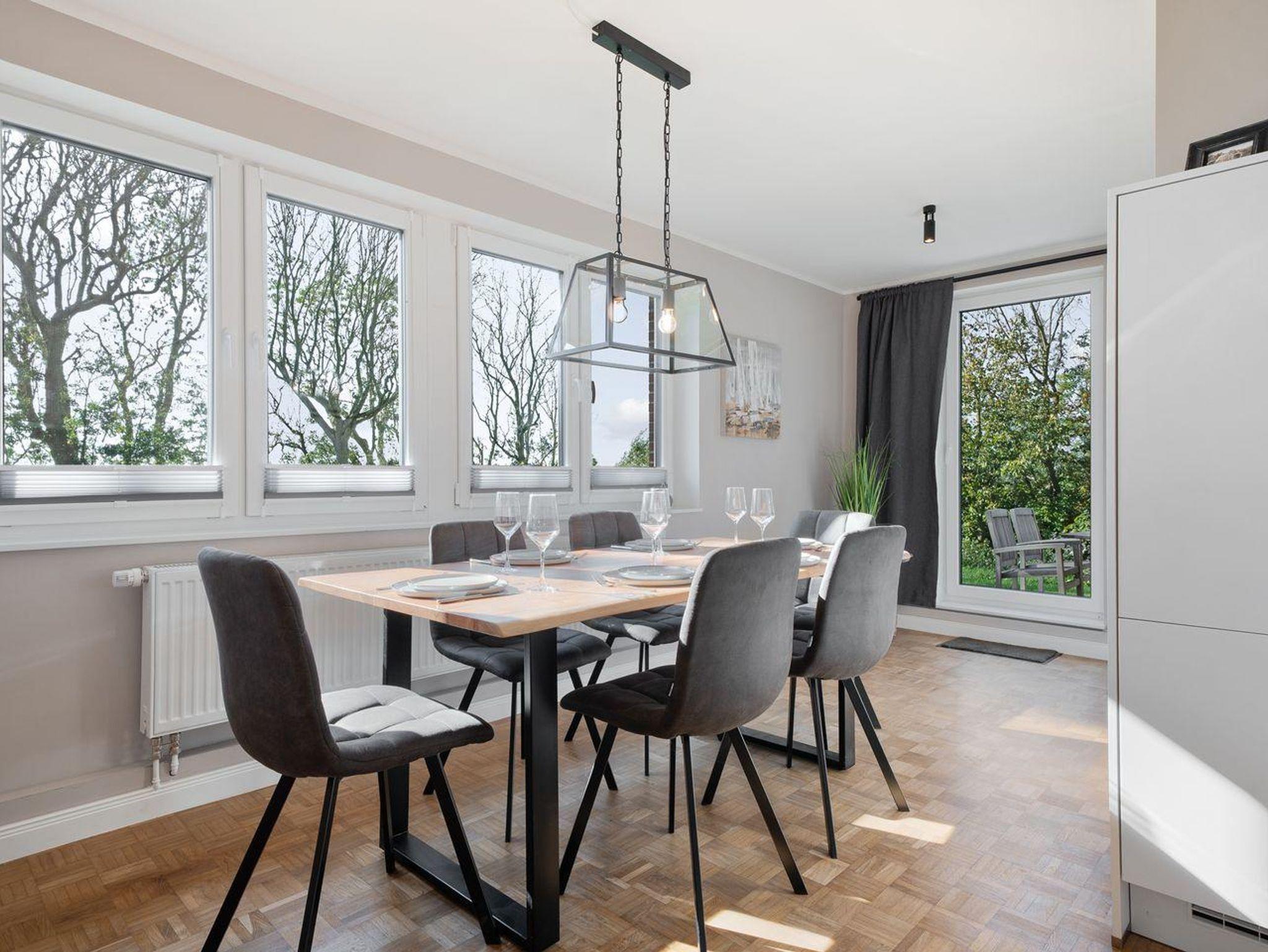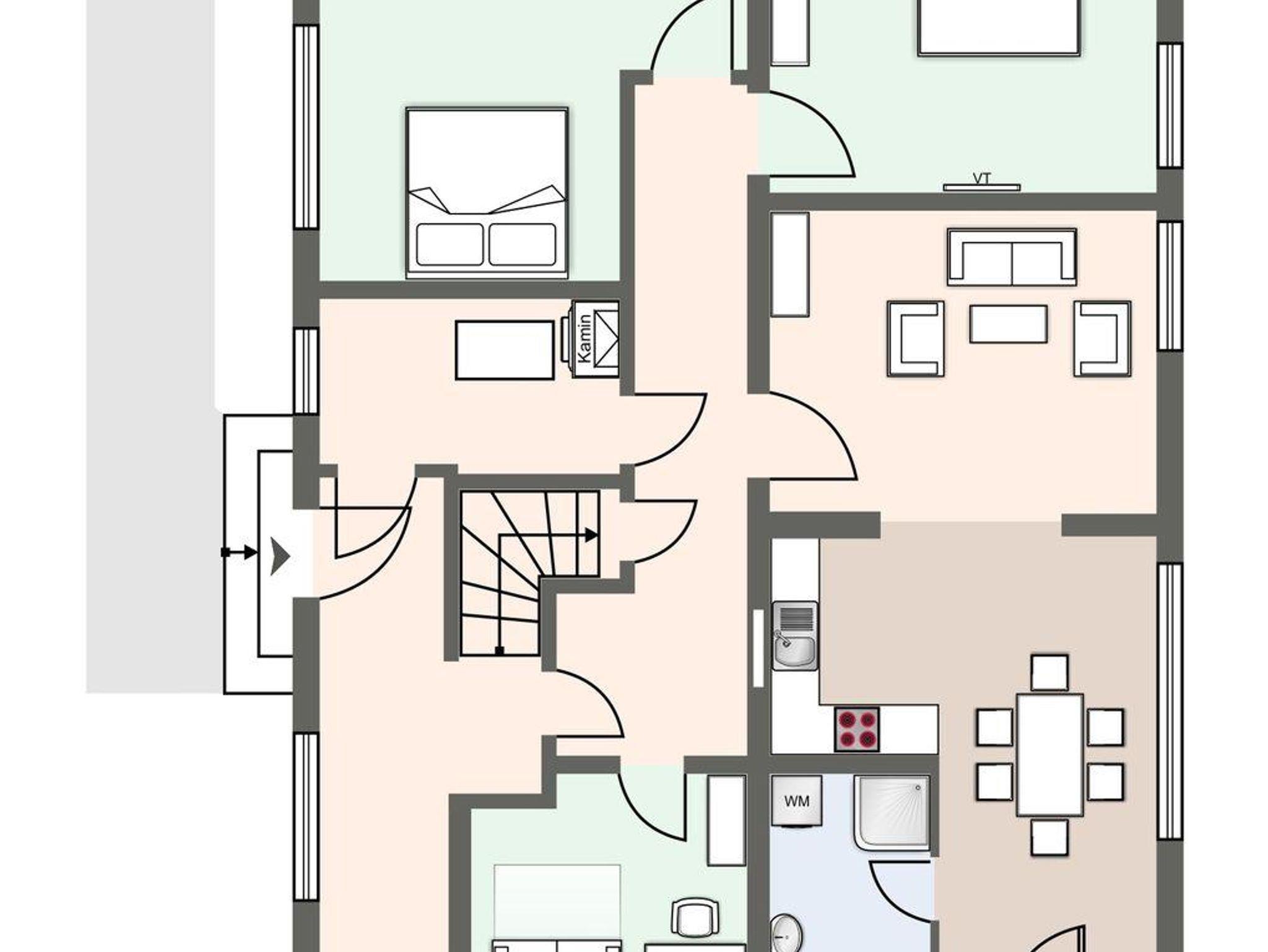 Die Ferienwohnung befindet sich im Erdgeschoss. Sie verfügt über ca. 70 m² Wohnfläche und ist wie folgt aufgeteilt: Im Erdgeschoss erwartet Sie ein geräumiger Wohnraum mit offener Küche und gemütlichem Essbereich. Die Küche ist voll ausgestattet. Ein Vollbad bietet allen Komfort. Vom Flur aus gelangen Sie in zwei großzügige Schlafzimmer eines mit einem Boxspringbett (1,8 x 2,0 m) und TV und eines mit einem Doppelbett (180x200). Ein weiteres Zimmer verfügt über eine Schlafcouch für die 5 Person.