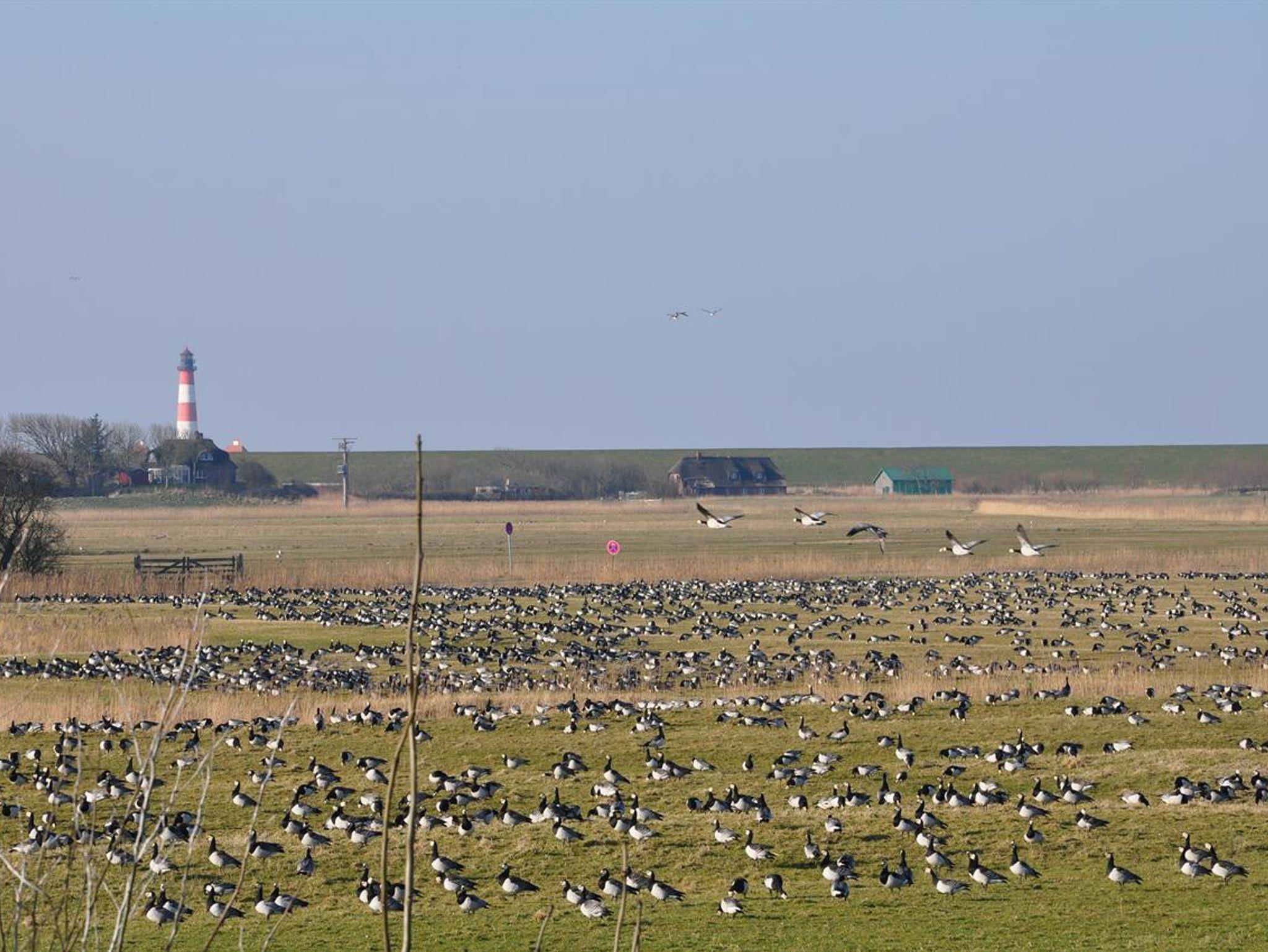 Schönen Urlaub - ganz nah am Meer! Das bietet unser Haus in Westerhever an Schleswig-Holsteins schöner Westküste, mit Blick zum Leuchtturm Westerheversand und großem Naturgarten. Verbringen Sie die kostbarste Zeit des Jahres an einem besonderen Ort, auf Eiderstedt, in unmittelbarer Nähe zur Nordsee, der Seedeich nur 1 km Luftlinie entfernt. Spätestens, wenn Sie zum ersten Mal vom Wohnzimmer aus den Leuchtturm Westerheversand erblicken, beginnt für Sie ein besonderer Urlaub! Das naturnahe über 1.000 qm große Gartengrundstück grenzt direkt am Vogelschutzgebiet an. Mit Blickachse zum Leuchtturm und mit Bäumen und Büschen eingerahmt, vor den Blicken der Nachbarn gut geschützt, können Sie hier eine schöne Auszeit nehmen. Dafür stehen auf der Rasenfläche zwei Strandkörbe, Sonnenliegen, eine Gartenbank und für jede Wohneinheit auch eine Sitzgruppe bereit. Tisch und Gartenstühle können Sie frei im Garten plazieren, ob in der Sonne oder im Schatten und windgeschützt unter den Bäumen, je nach Wetterlage. Dazu ideale Spielmöglichkeiten für Kinder: Schaukelanlage, Sandkasten, Fußballtor und Trampolin stehen bereit, der Langeweile keine Chance!