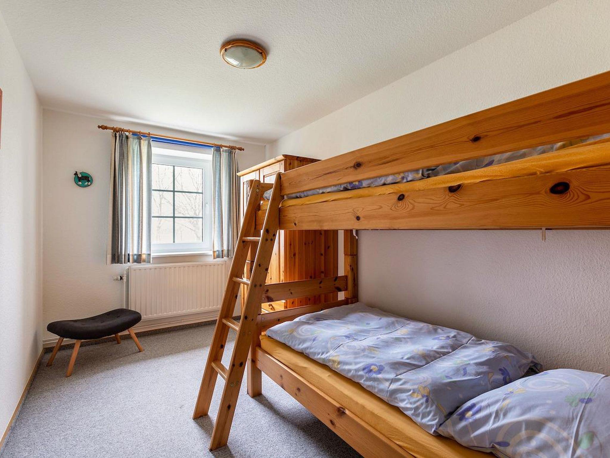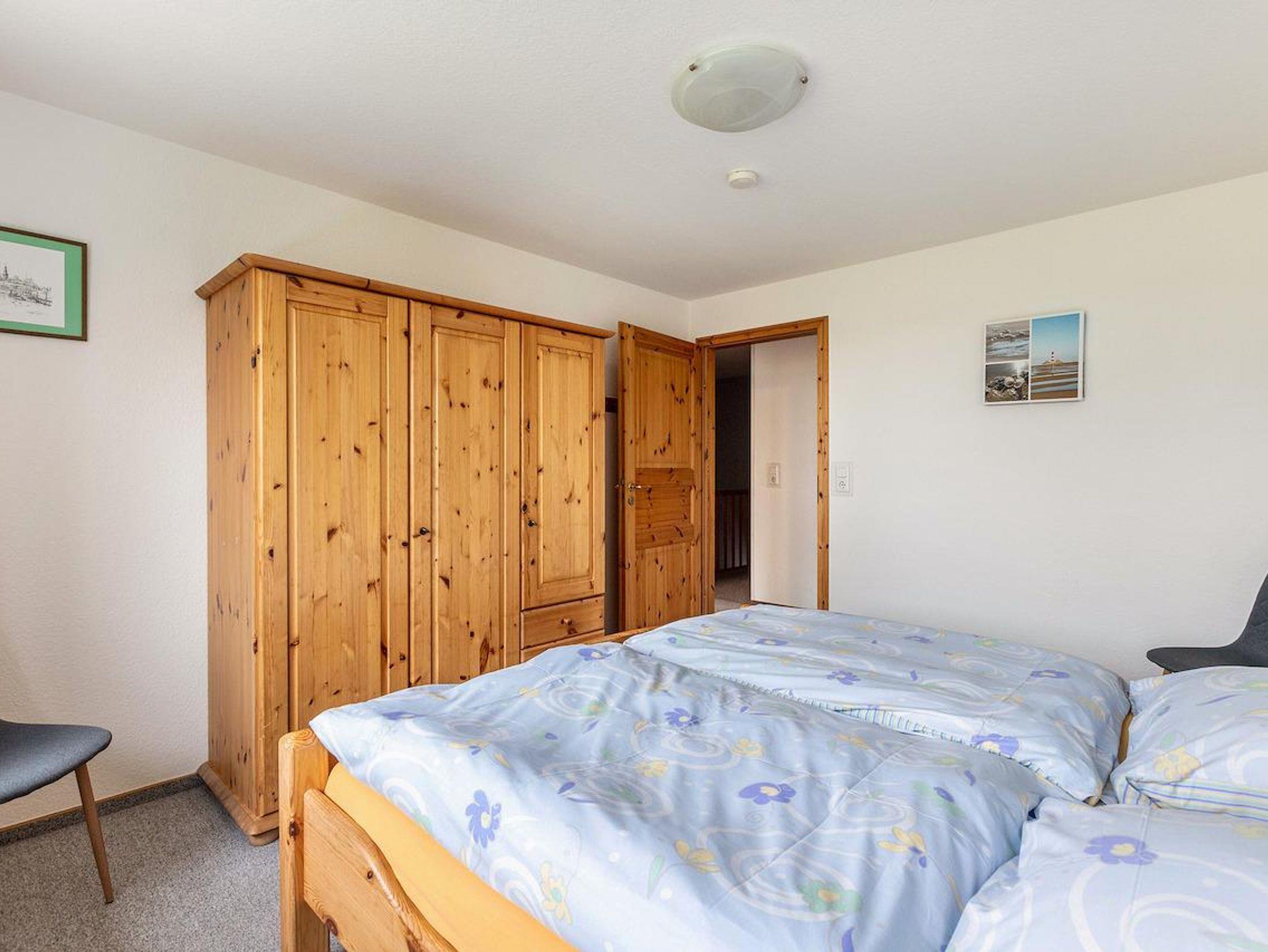Im Obergeschoss befindet sich ein Schlafzimmer mit einem Doppelbett und ein Kinderzimmer mit einem Etagenbett. Das grosszügige Badezimmer mit Dusche und WC hat ein Aussenfenster.