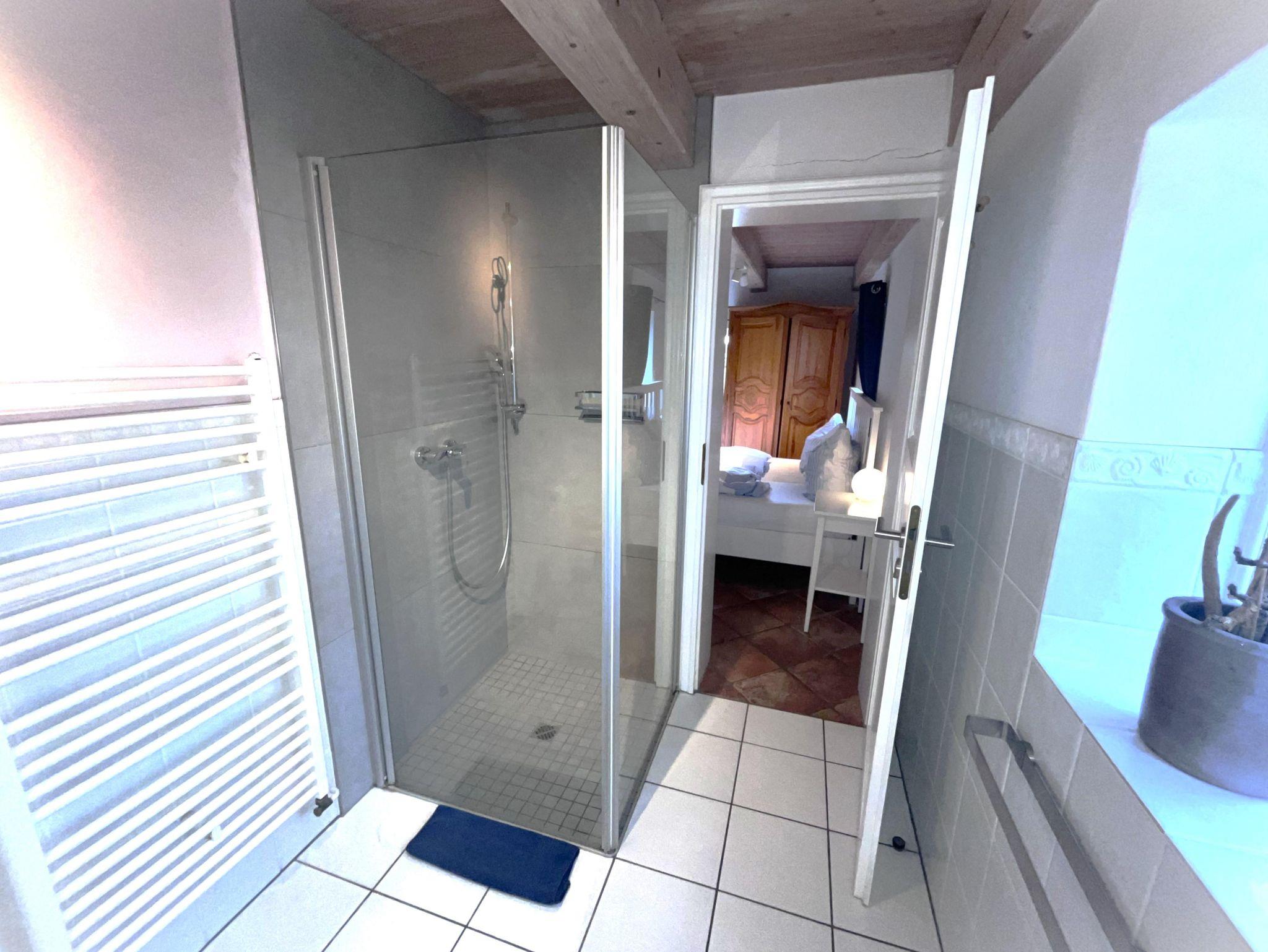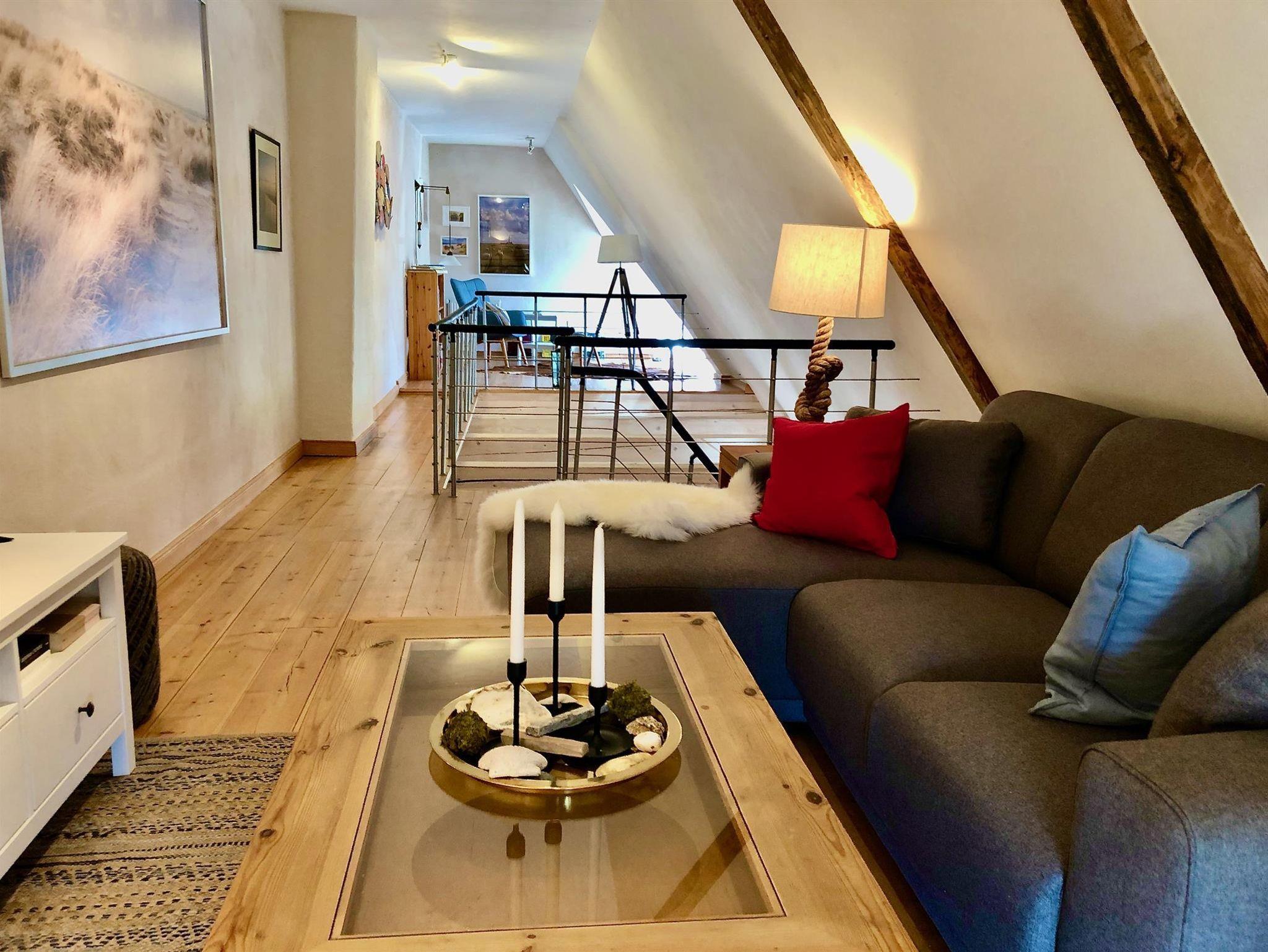 Im Obergeschoss stehen Ihnen neben einem separaten, stilvollen Wohnzimmer mit TV und XXL-Sofa mit der Bibliothek ein weiterer Rückzugsort zur Verfügung. Dieser ist über eine Galerie sehr hell und offen gestaltet, verbreitet mit Bildern & Einrichtung sehr viel Nordsee-Flair und bietet durch eine tolle Dachgabue einen Blick Richtung Leuchtterm. Die Ausstattung haben wir auch hier bspw. mit einer bequemen Recamiere modern-maritim gehalten.