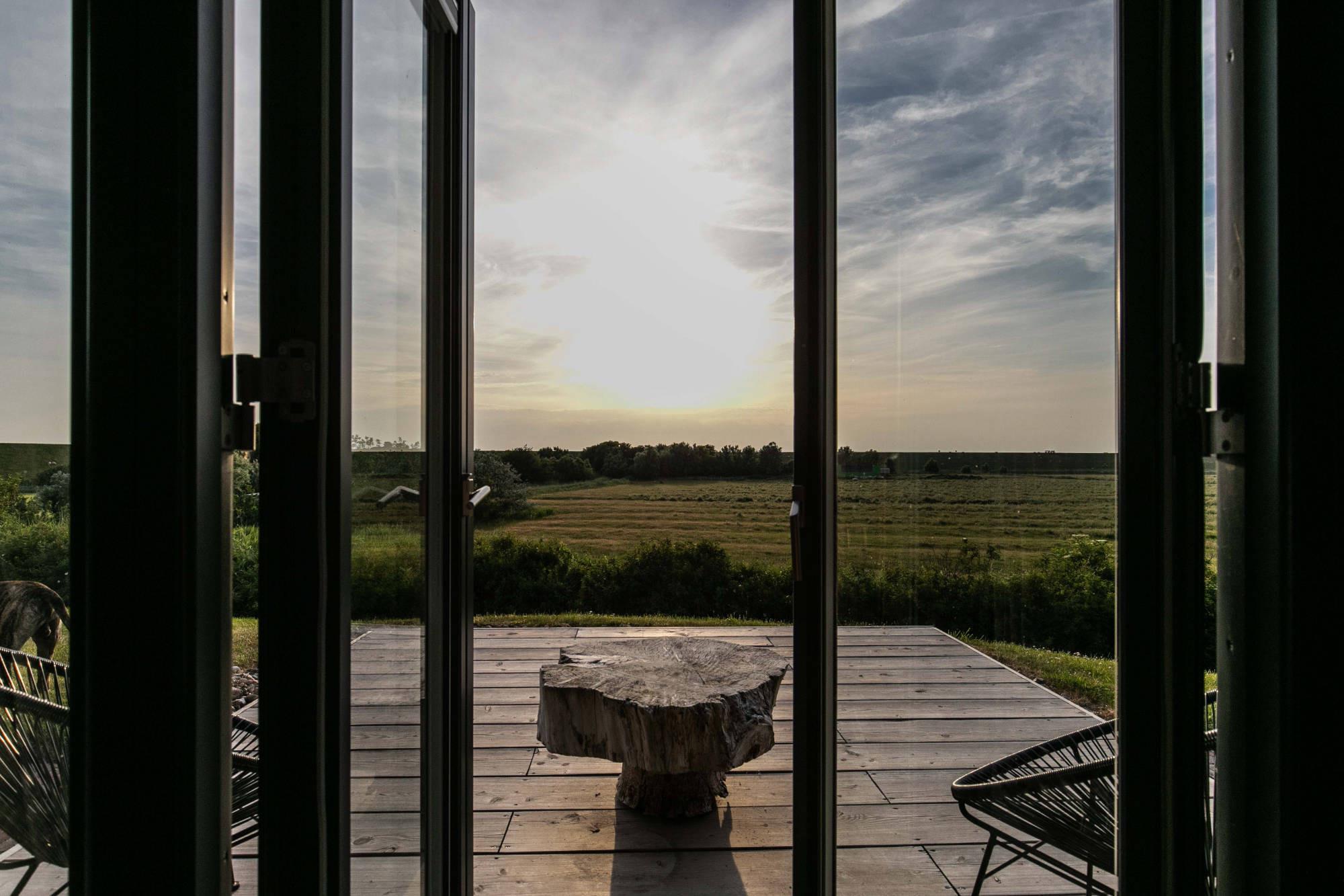 Die großzügige Sauna ist mitten im Garten mit Blick auf die Wiesen.