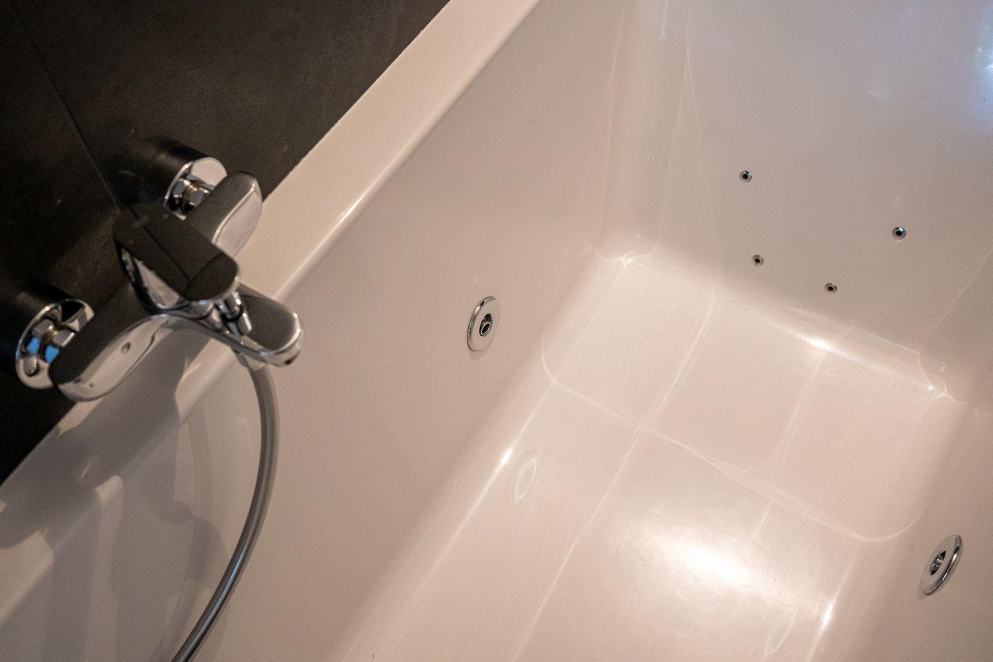 Ein weiteres Highlight des Ferienhauses ist zweifellos die Sauna, die sich im hinteren Teil des Hauses befindet. Hier können Sie in aller Ruhe entspannen und den Alltag hinter sich lassen. Auch das große Badezimmer mit ebenerdiger Dusche und Whirlwanne lädt zum Verweilen ein. Ein kleiner Abstellraum mit Waschmaschine rundet das Angebot ab. Über eine Treppe gelangen Sie in den ersten Stock, wo sich ein weiteres Schlafzimmer mit zwei gemütlichen Einzelbetten sowie ein praktisches Duschbad befinden.
