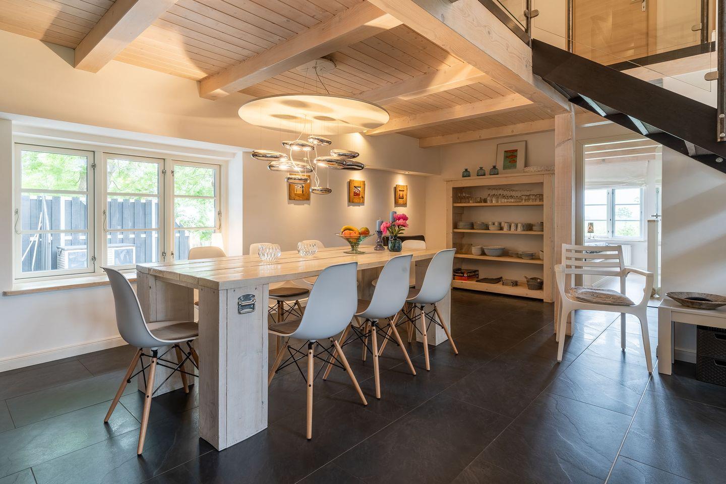 Die liebevoll sanierte Immobilie besticht durch ihre besondere Architektur und den modernen Charme. Nach einer behutsamen 8-monatigen Restaurierung wurde sie zu einem außergewöhnlichen Ferienhaus umgebaut und bietet bis zu 6 Personen genügend Platz. Im lichtdurchfluteten Wohnraum mit gemütlichem Kamin, stilvollem Essbereich und offener Küche können Sie gemeinsam kulinarische Köstlichkeiten zaubern und in geselliger Runde verweilen. Die moderne Küche ist umfangreich ausgestattet und verfügt über einen 5-flammigen Gasherd - hier kommen Hobbyköche voll auf ihre Kosten. Im Erdgeschoss befinden sich außerdem zwei geräumige Schlafzimmer mit komfortablen Doppelbetten und jeweils einem eigenen Fernseher. Hier lässt sich nach einem erlebnisreichen Tag wunderbar entspannen.