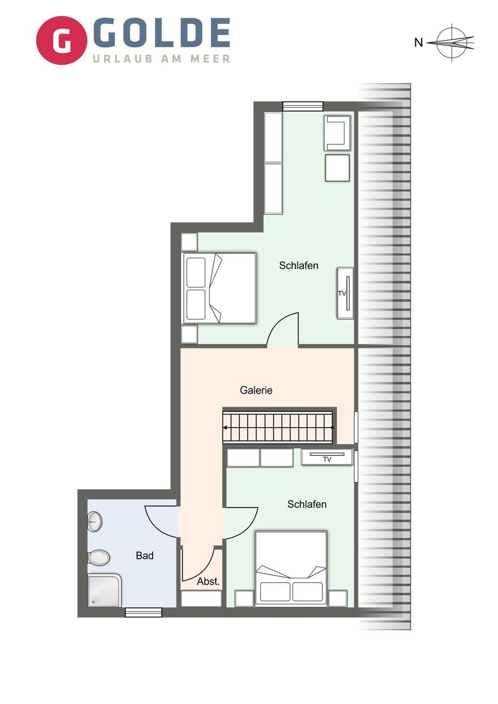 Vom Wohnbereich gelangen Sie über eine Lofttreppe ins Obergeschoss. Hier befinden sich zwei weitere Schlafzimmer, jeweils mit einem Boxspringbett (1,8 x 2,0 m) und je einem TV, sowie ein separates Duschbad mit zusätzlichem WC.