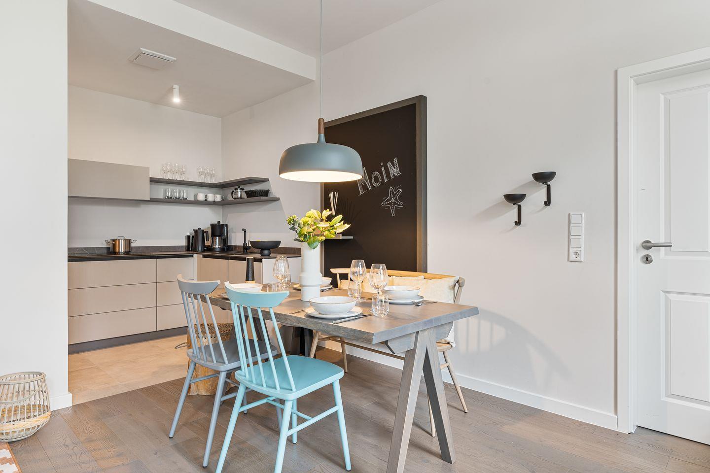 In der offenen Küche können Hobbyköche ihr Talent entfalten. Ausgestattet mit einem modernen Induktionsherd, Backofen, Geschirrspüler, Kühlschrank und Gefrierfach finden Sie hier alles, um köstliche Speisen zuzubereiten und das gemeinsame Essen zu zelebrieren. Der großzügige Wohnbereich mit Fernseher lädt zum Entspannen, Filmabende oder gemeinsamen Beisammensein ein.