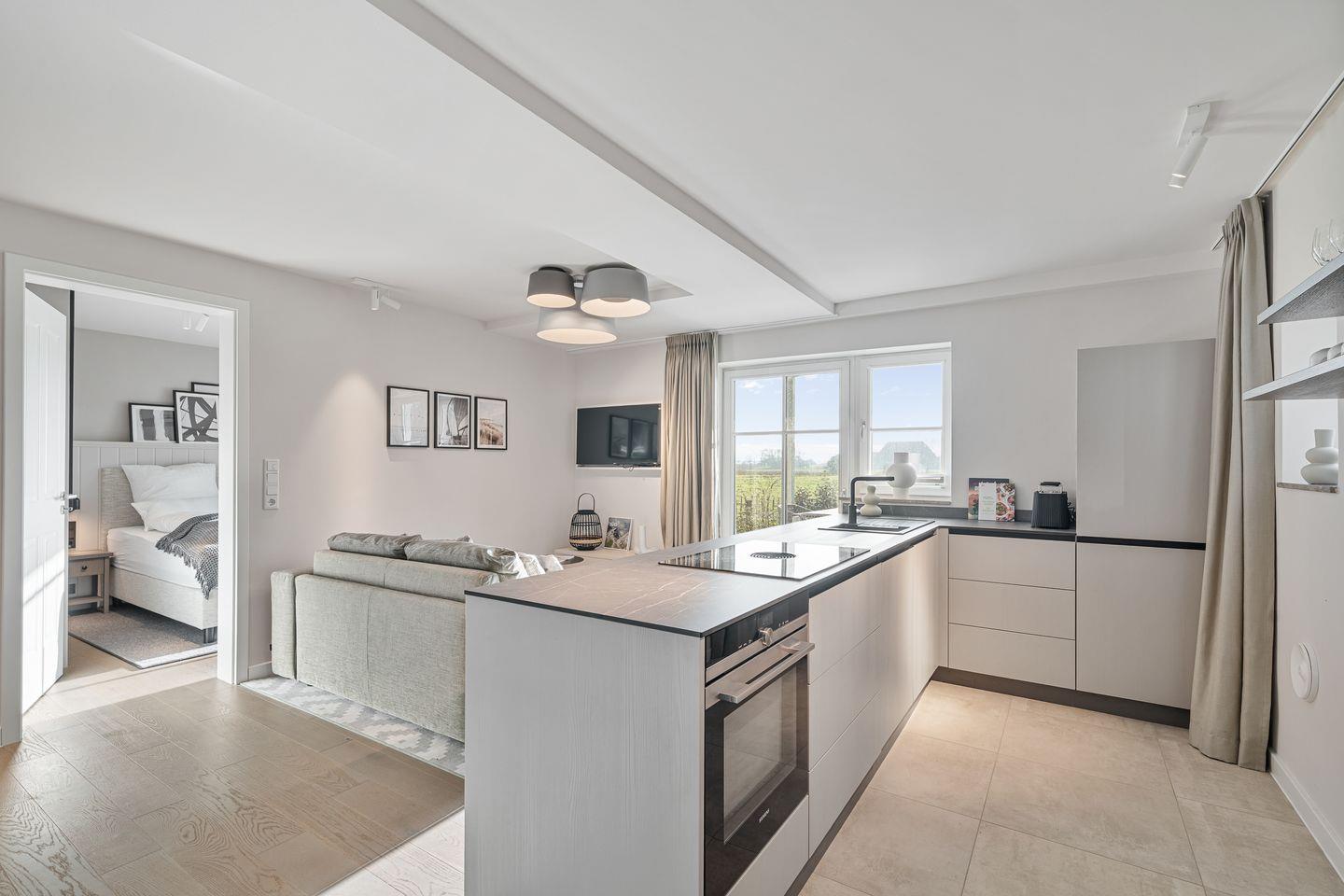 Die offene und exklusive Küche ist komplett ausgestattet und ideal für alle, die gerne selbst kochen. Hier finden Sie alle notwendigen Küchenutensilien sowie Hochwertige E-Geräte wie einen Induktionsherd, einen Backofen, eine Spülmaschine, eine Kaffeemaschine um Ihren Morgen mit einer Tasse frisch gebrühten Kaffee zu beginnen. Der eingerichtet Wohnbereich ist hell und exklusiv gestaltet und verbindet sich harmonisch mit der Küche. Gemütliche Abende können Sie beim Fernsehen verbringen; die Ferienwohnung ist mit zwei TV-Geräten ausgestattet, sodass Sie Ihre Lieblingssendungen in beiden Bereichen genießen können.