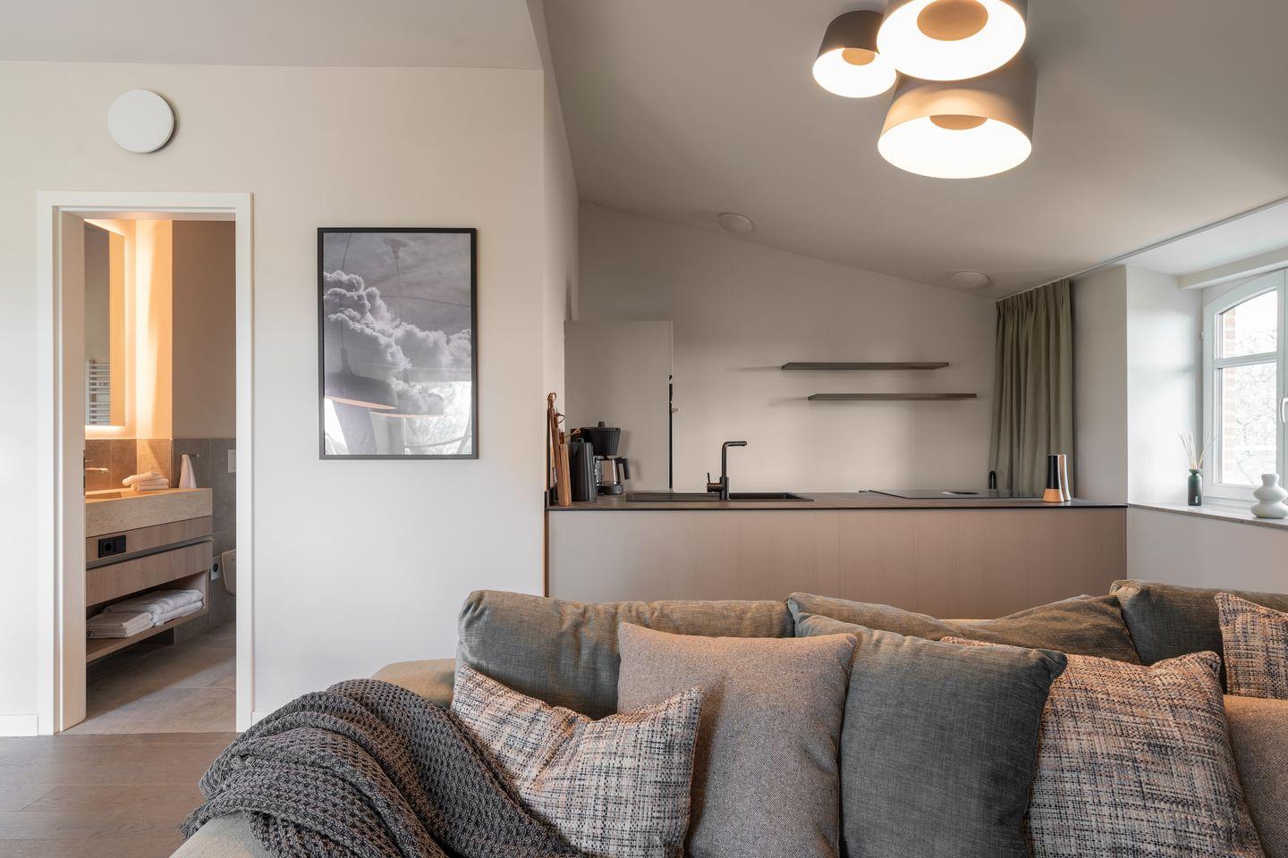 In der offenen und exklusiven Küche, die nahtlos in das Wohnzimmer übergeht - sind Sie bestens ausgestattet, um kulinarische Köstlichkeiten zuzubereiten. Die Küche ist mit hochwertigen E-Geräten ausgestattet, darunter ein Induktionsherd, ein Backofen, eine Spülmaschine, ein Kühlschrank mit Gefrierfach, sowie Mikrowelle, Toaster und Kaffeemaschine.