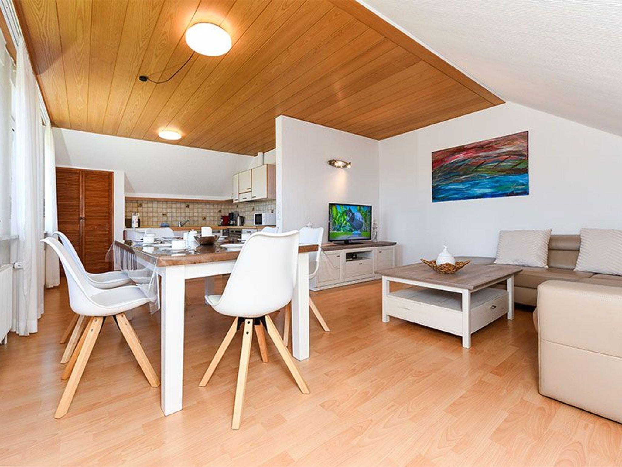 Größe, ca. 90 Quadratmeter, Wohnraum mit integrierter Küche, Schlafzimmer, zweites separates Schlafzimmer, drittes separates Schlafzimmer, Badezimmer mit Dusche und zwei Waschtischen, separates WC, Obergeschoss, Terrasse, Balkon, Versorgungsraum, optimal für 2 bis 6 Personen.