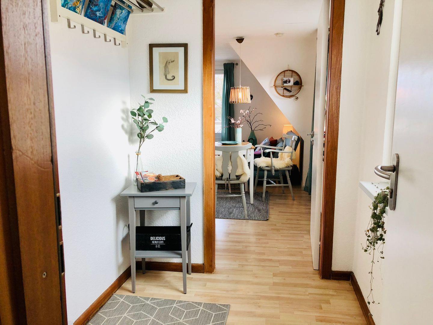 Über eine kleine Treppe und den Flur mit Garderobe gelangst du in das Apartment, das über eine separate, gut ausgestattete Küchenzeile verfügt – alles da, was man im Urlaub braucht, ohne viel Schnickschnack.