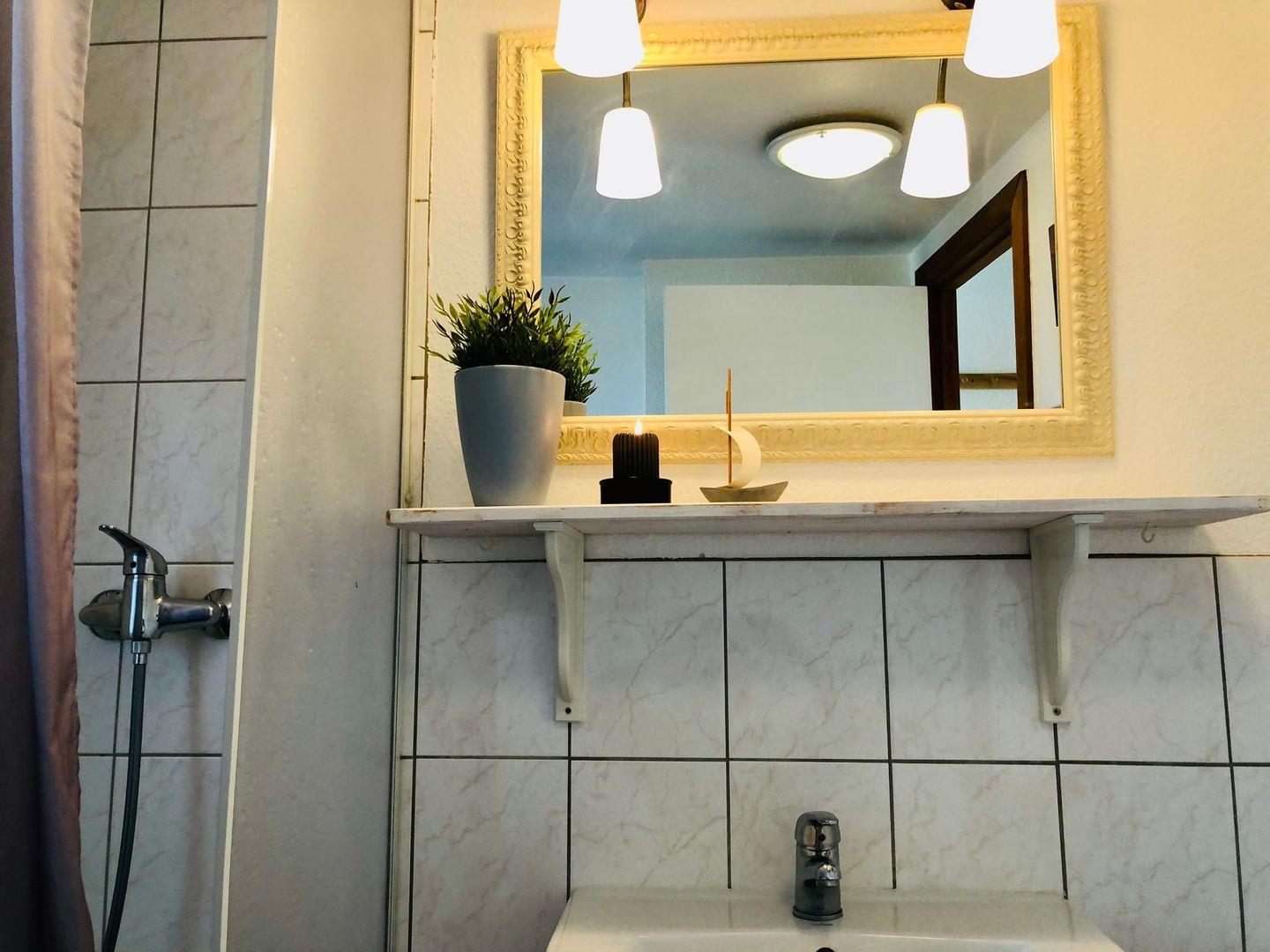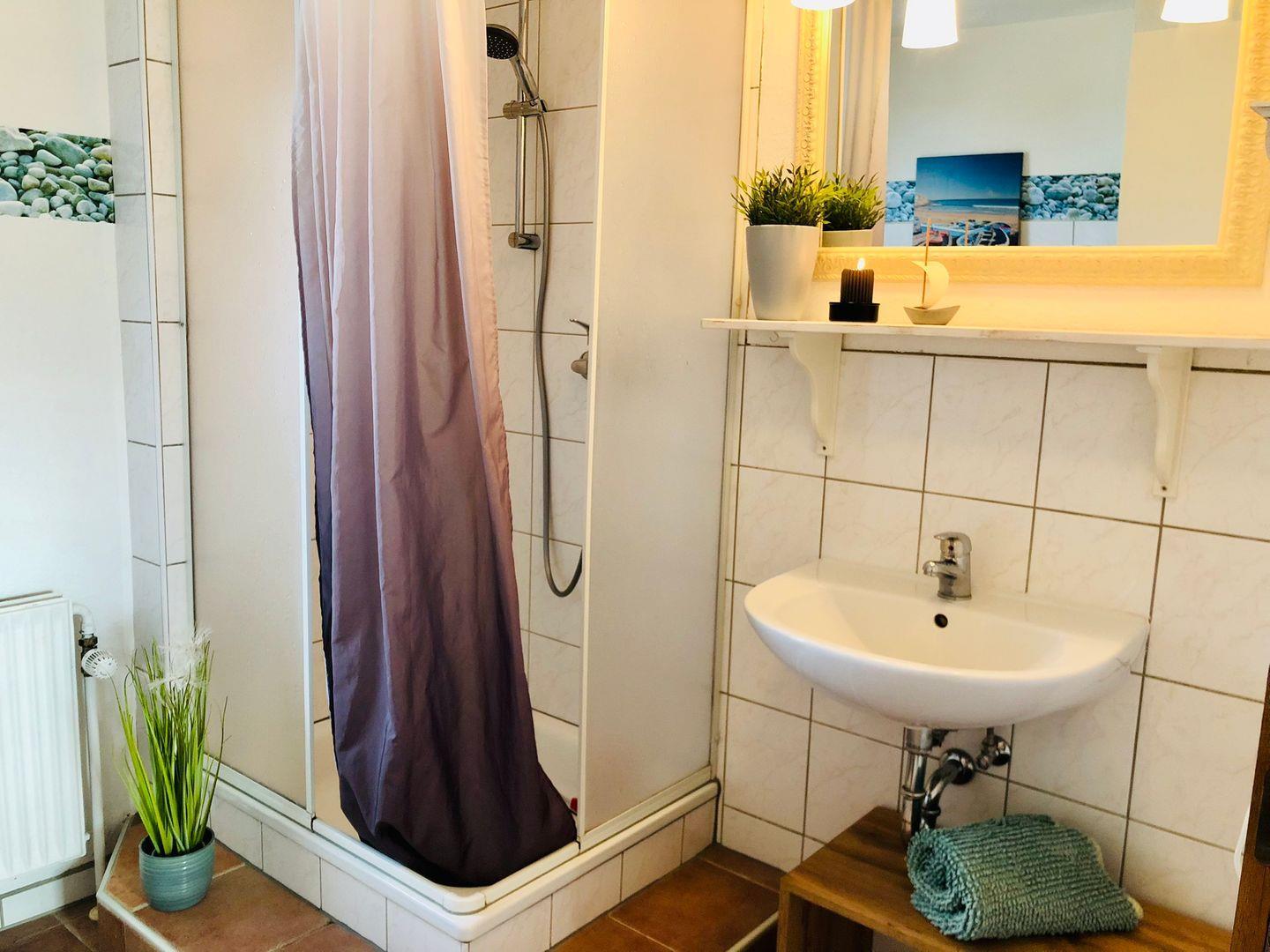 Das Badezimmer mit Tageslichtfenster ist schlicht gehalten und mit Dusche, WC, Waschtisch und Fön ausgestattet.