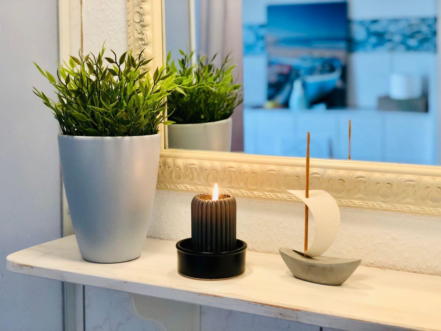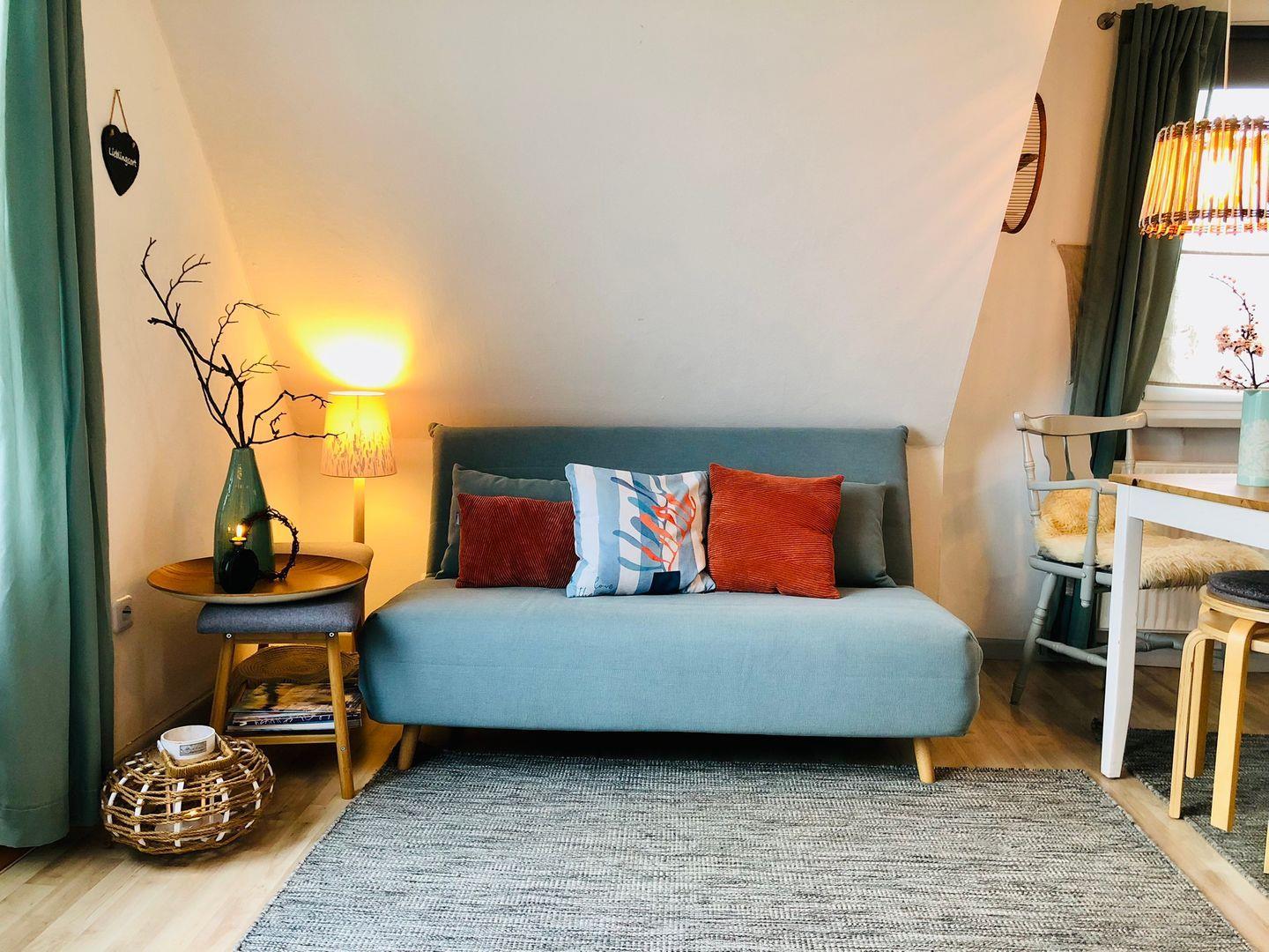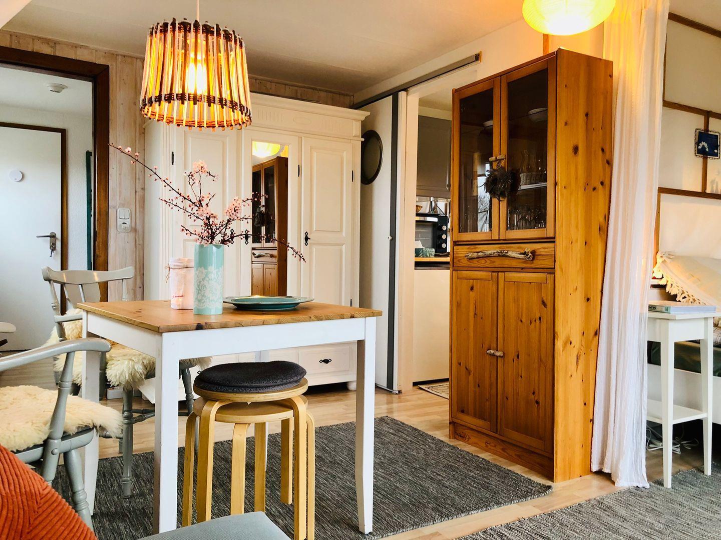 Diese einfache, aber liebevoll eingerichtete 1-Zimmer-Wohnung im ersten Obergeschoss überzeugt mit einer großzügigen Dachterrasse zur Seeseite – hier lassen sich Sonnenuntergänge und frische Meeresluft besonders schön genießen. Die Einrichtung besteht teils aus gut erhaltenen Second-Hand-Möbeln, was der Wohnung einen wohnlichen, persönlichen Charakter verleiht.