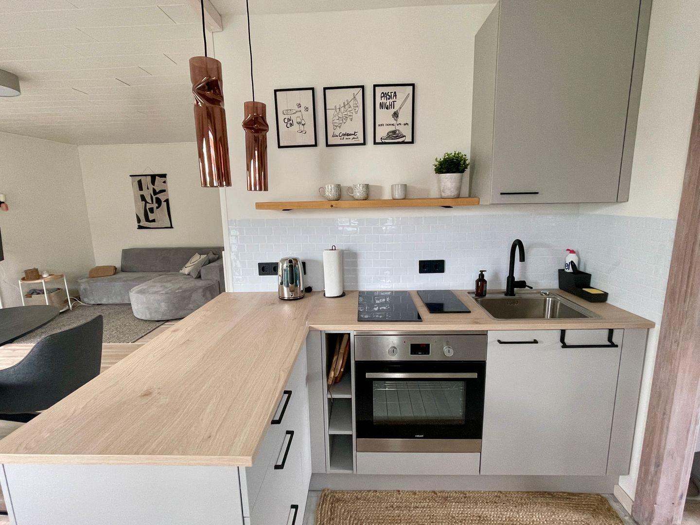 Offene, voll ausgestattete Küche mit Geschirrspüler, Backofen, Kaffeemaschine, Nespresso-Maschine & mehr