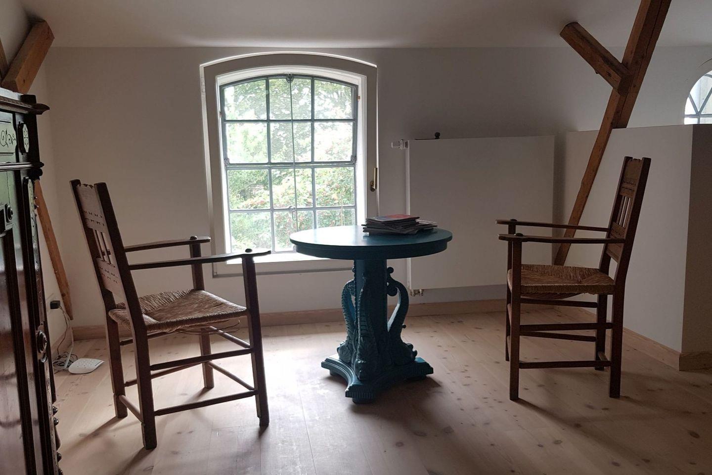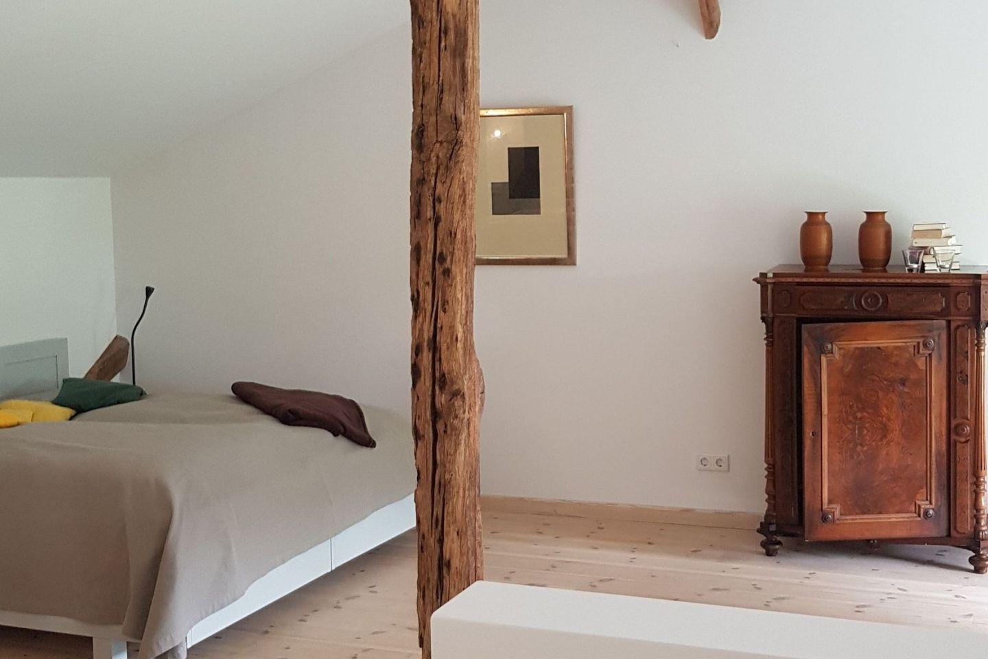 Das Hay Loft befindet sich im Obergeschoss des ehemaligen Stalltraktes der Hofanlage „Kiekut“ und ist ruhig nach Süden ausgerichtet. Von hier genießen Sie einen weiten Blick über die sanfte Angeliter Landschaft – ideal für alle, die dem Alltag entfliehen und dabei nicht auf Komfort verzichten möchten.