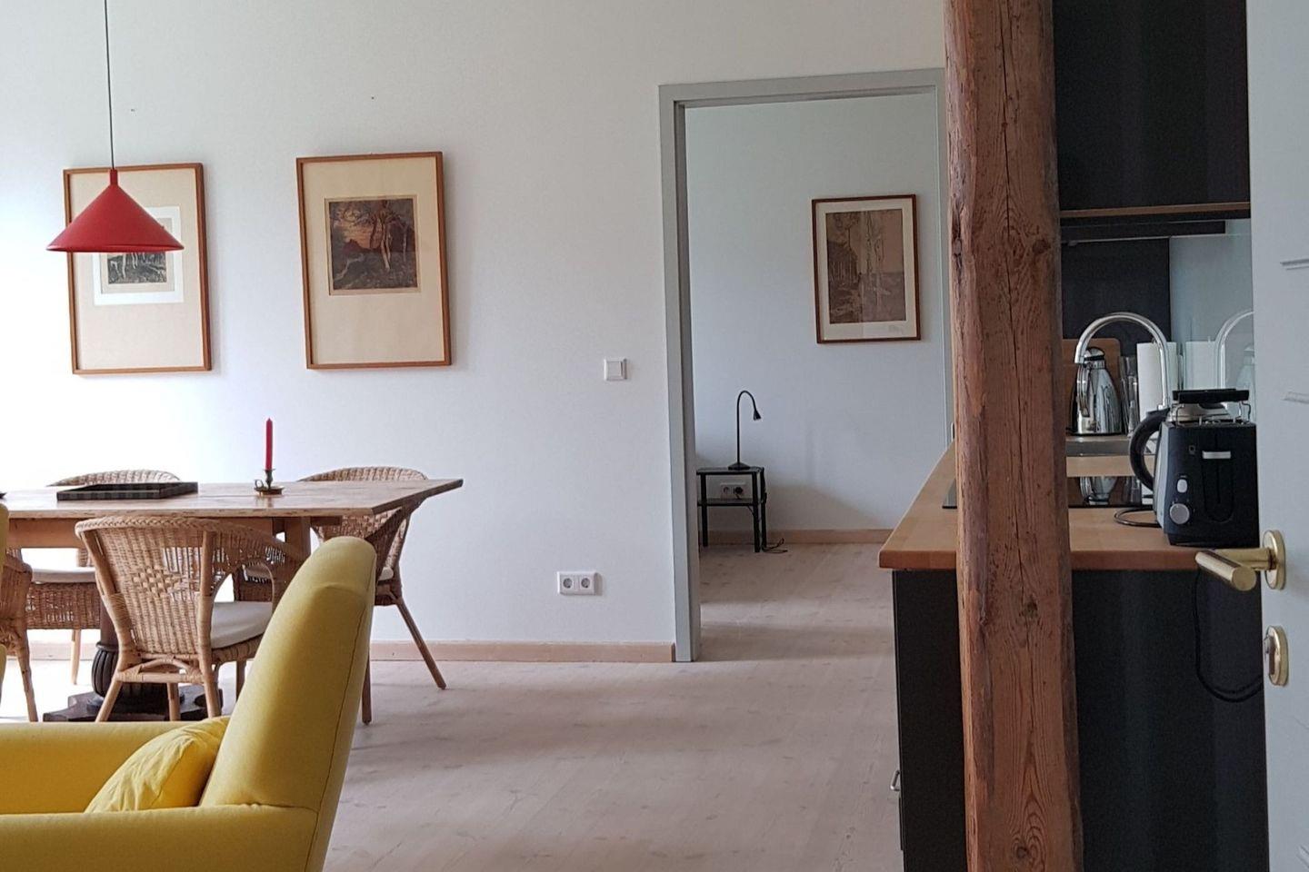 Die Wohnung (Baujahr 2014) mit rund 90 m² bietet, im Obergeschoss nach Süden gelegen, einen weiten Blick über die Angeliter Landschaft. Sie verfügt über zwei Schlafzimmer und zwei Duschbäder. Ein großzügiger Wohn- / Essbereich mit einer komfortabel eingerichteten Pantry lädt zu entspannten Aufenthalten ein. Die Wohnung wird durch einen eigenen Treppenzugang erschlossen, über den auch der Garten erreicht werden kann in dem ein eigener Sitz- und Liegeplatz eingerichtet ist. Sat-TV sowie W-Lan sind vorhanden.