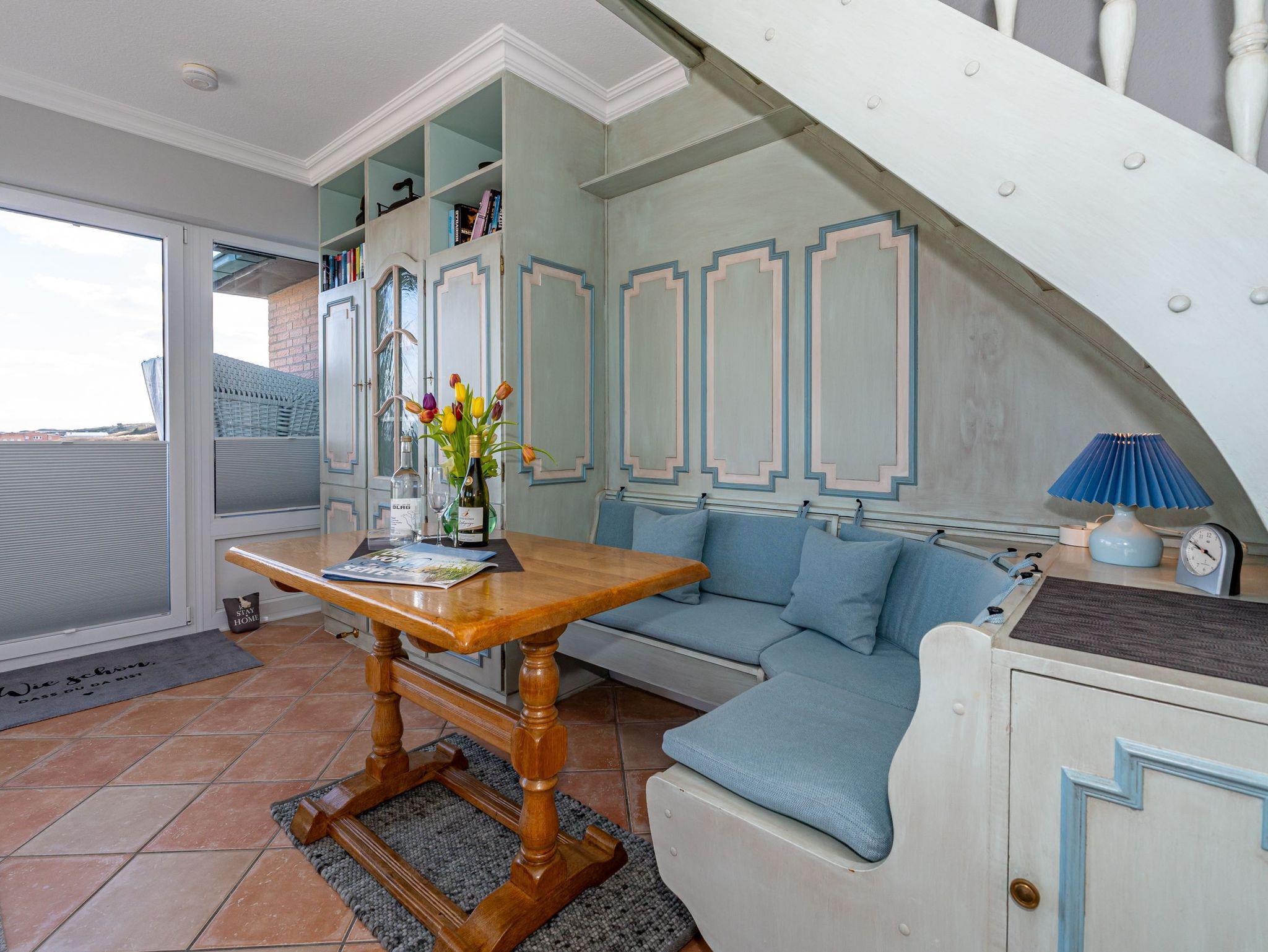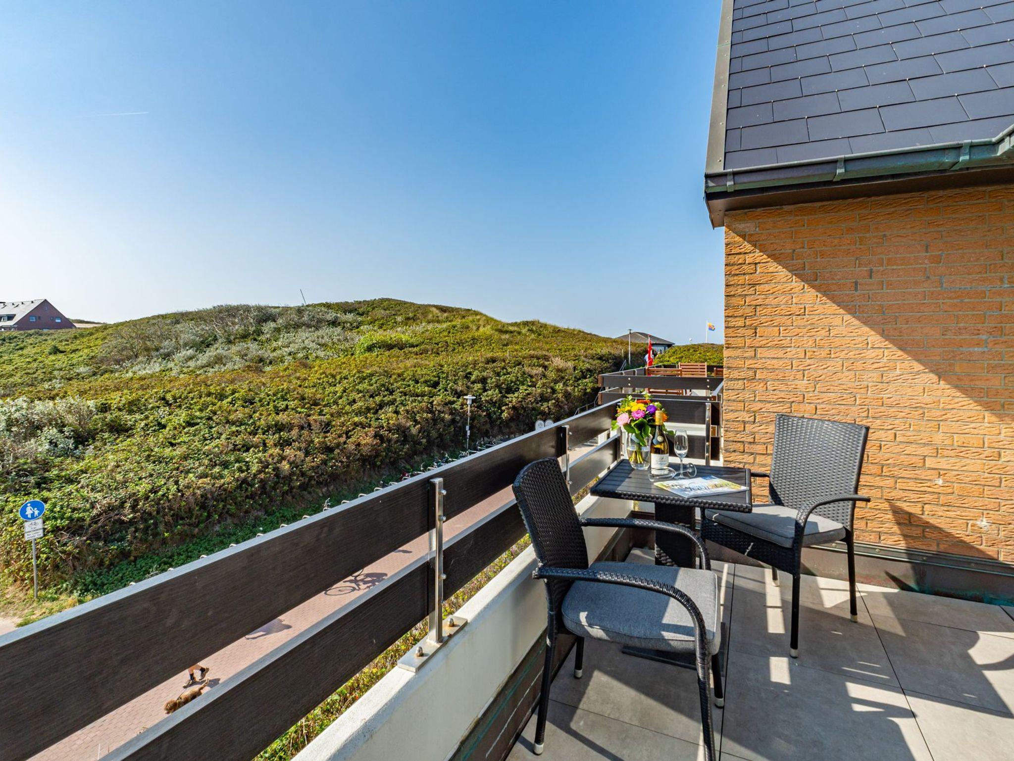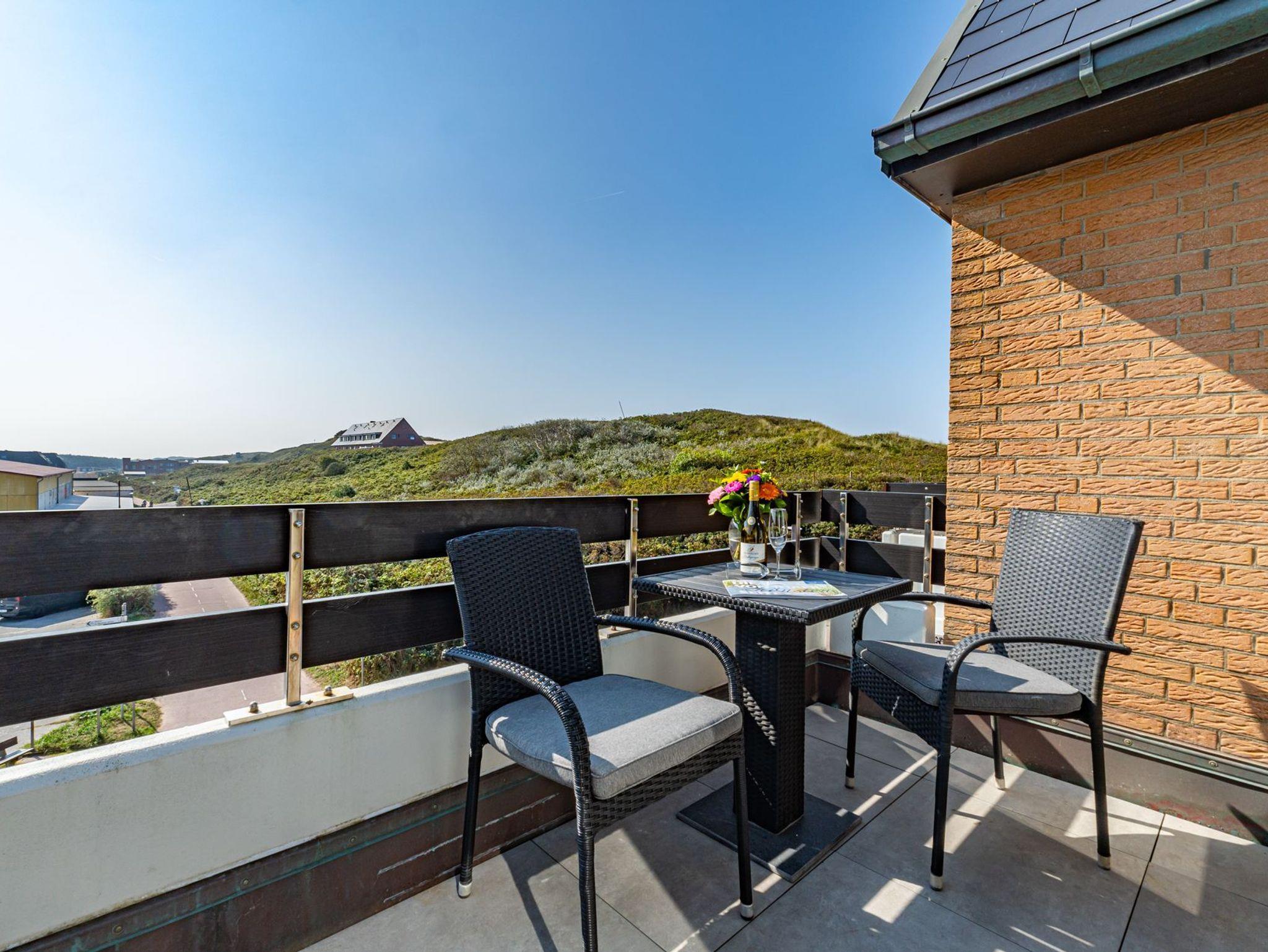 Diese großzügige 1-Zimmer-Nichtraucher-Ferienwohnung mit offener Empore besitzt eine Gesamtfläche von ca. 58 qm und bietet Platz für 2 Personen. Die Wohnung erstreckt sich über zwei Ebenen und befindet sich in der 2. Etage zur Südseite, mit herrlichen Blick auf die Dünen und den Süden Westerlands. Genießen Sie ganztägig entspannte Sonnenstunden auf dem großen Südbalkon, der mit Balkonmöbeln, Auflagen und einem Strandkorb ausgestattet ist.