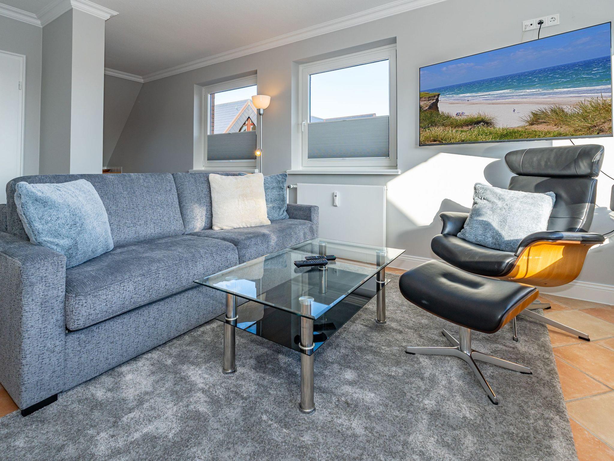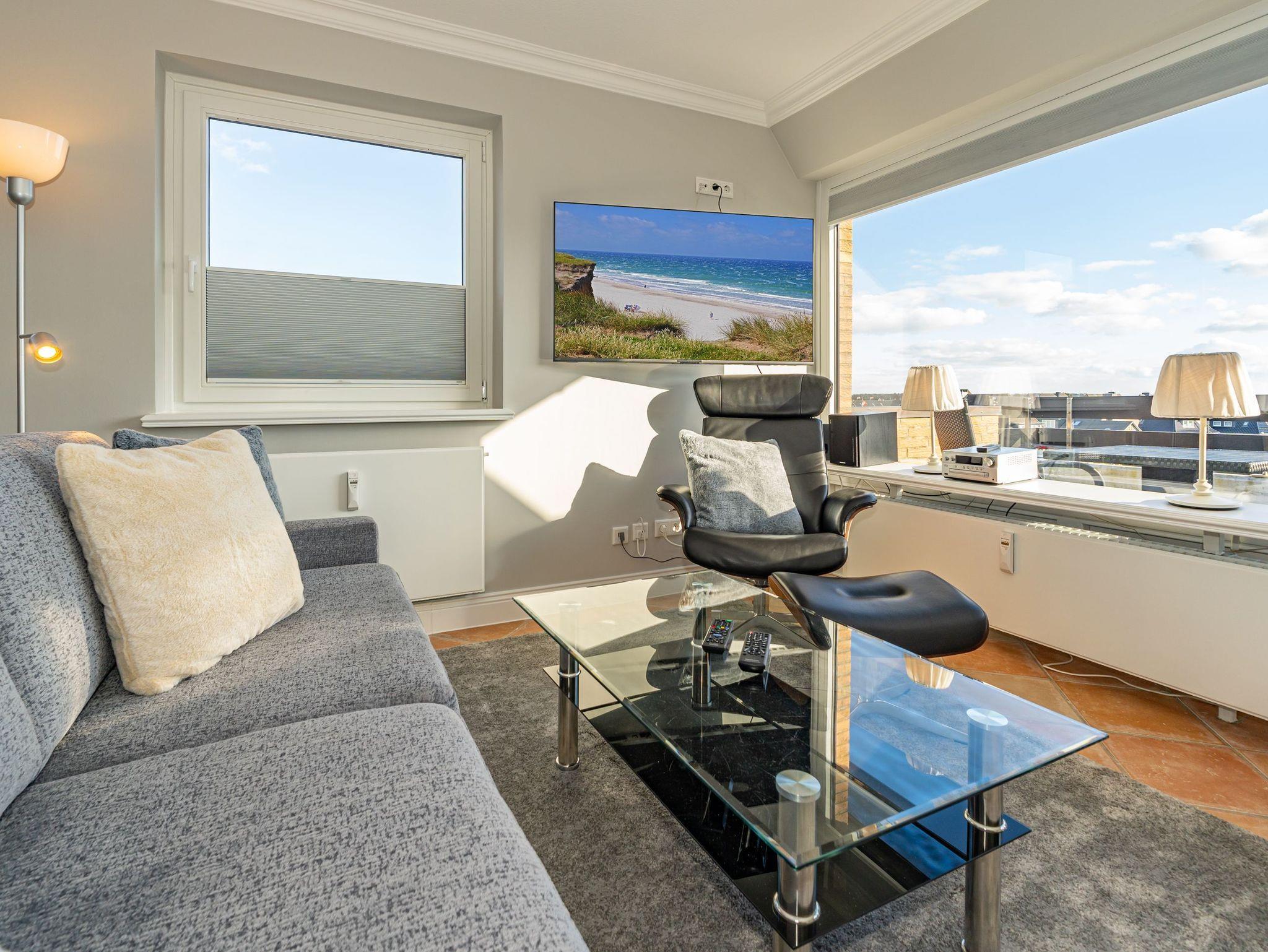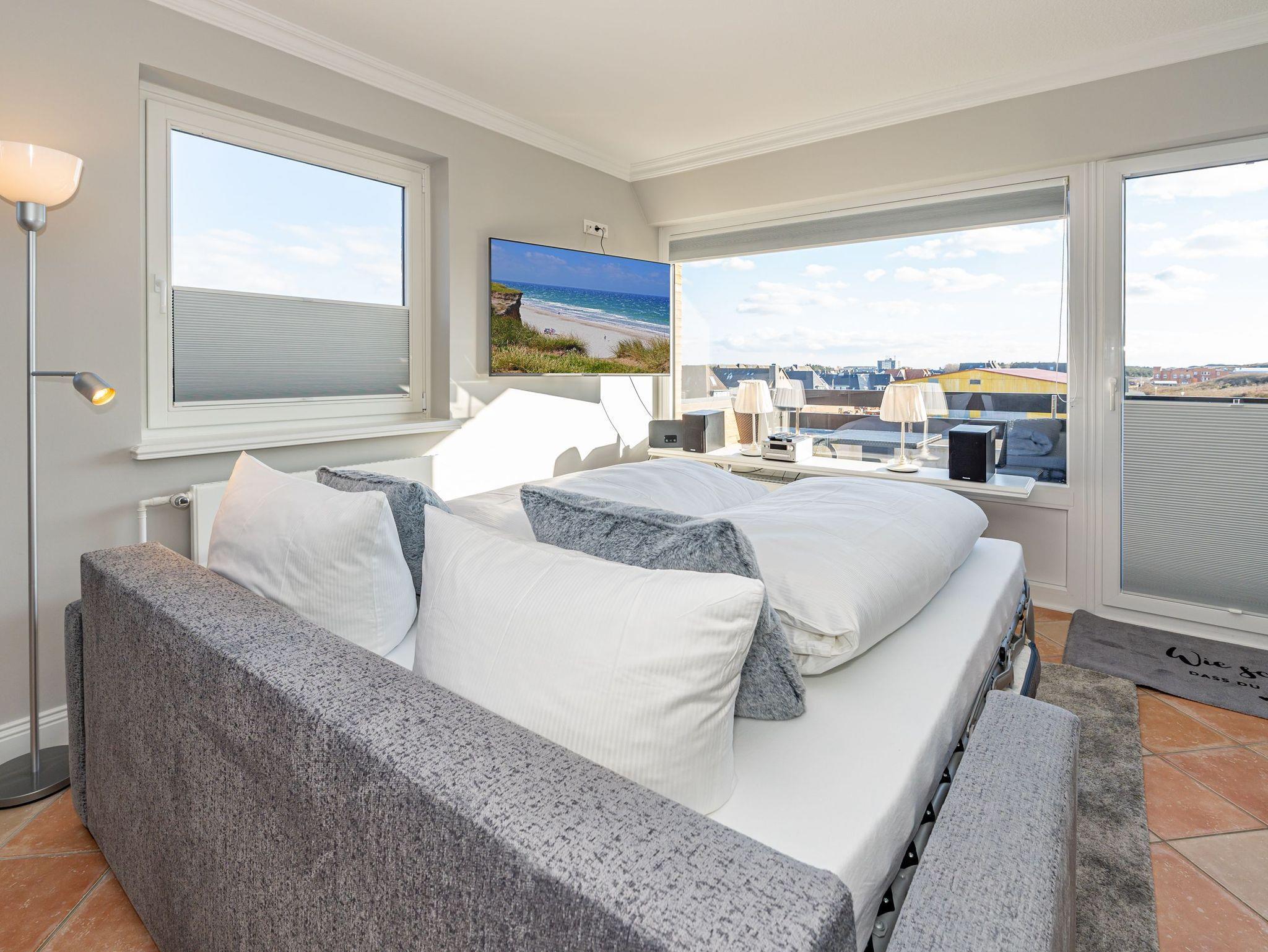 Diese großzügige 1-Zimmer-Nichtraucher-Ferienwohnung mit offener Empore besitzt eine Gesamtfläche von ca. 58 qm und bietet Platz für 2 Personen. Die Wohnung erstreckt sich über zwei Ebenen und befindet sich in der 2. Etage zur Südseite, mit herrlichen Blick auf die Dünen und den Süden Westerlands. Genießen Sie ganztägig entspannte Sonnenstunden auf dem großen Südbalkon, der mit Balkonmöbeln, Auflagen und einem Strandkorb ausgestattet ist.