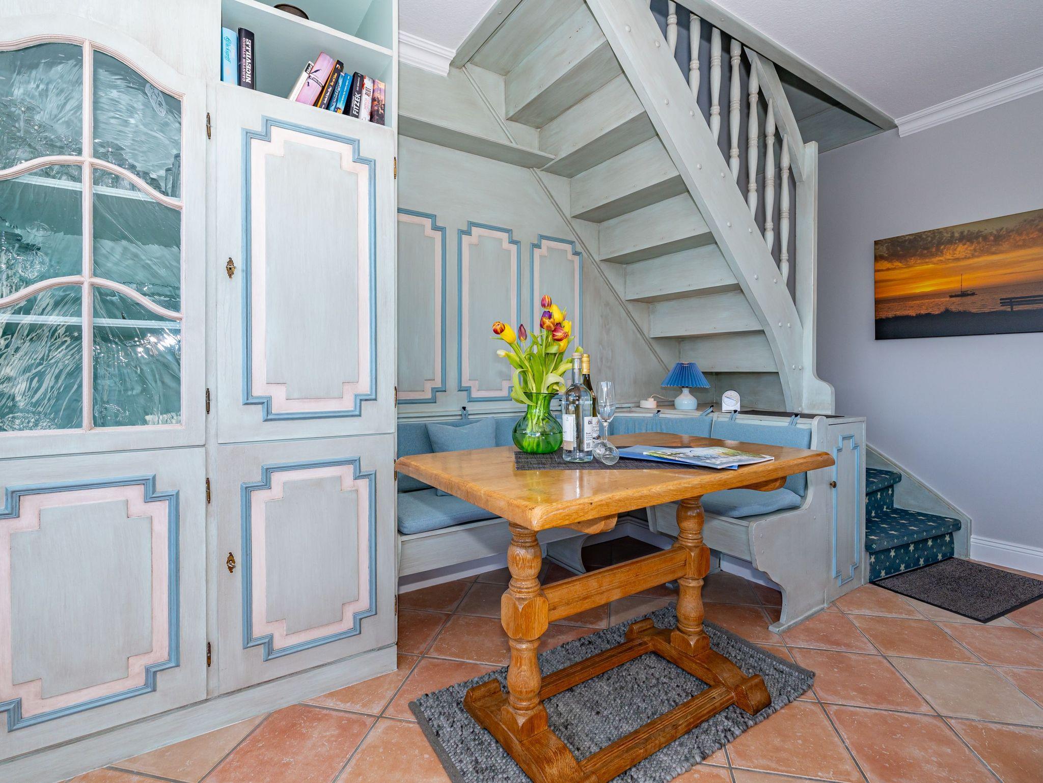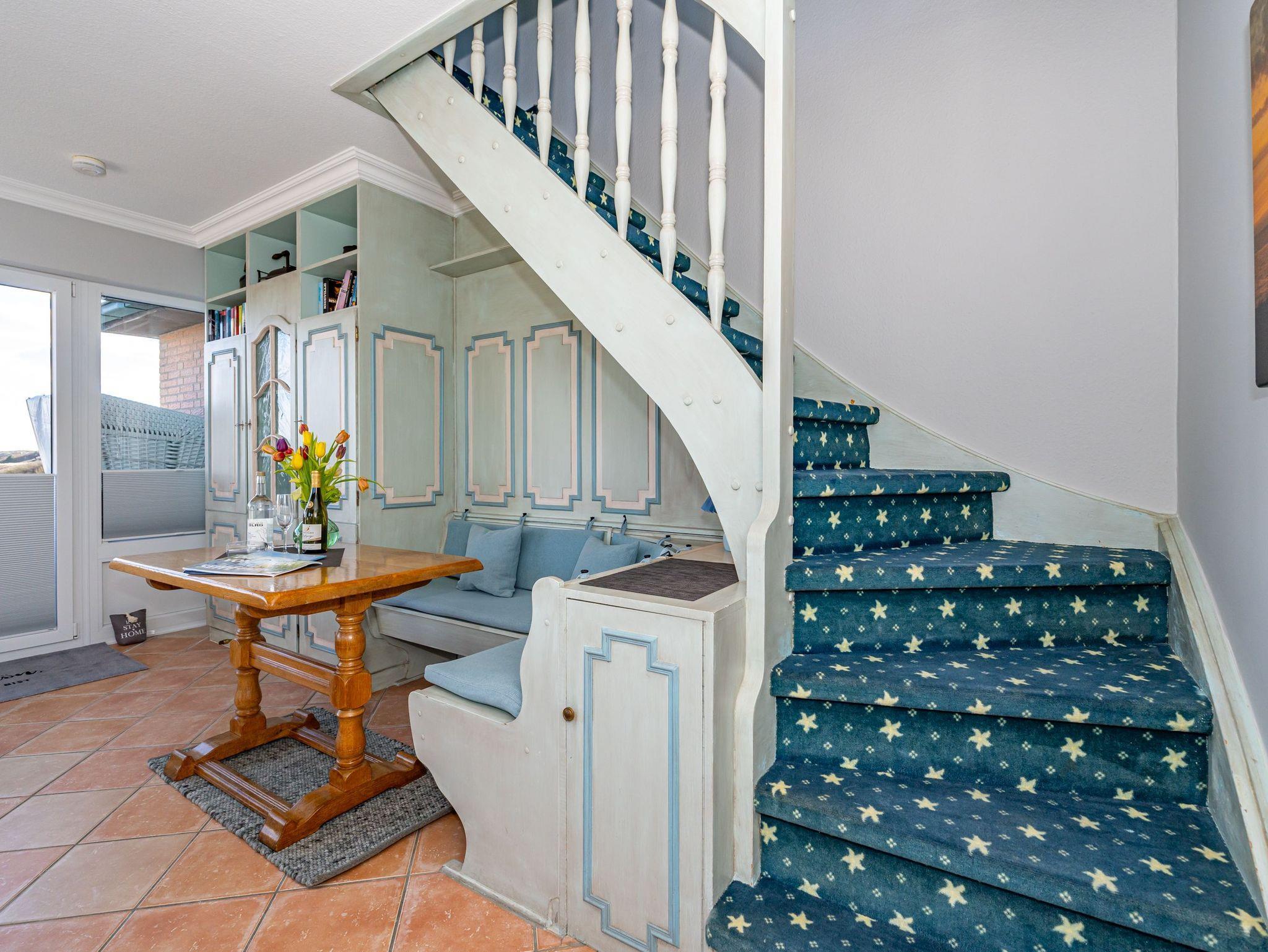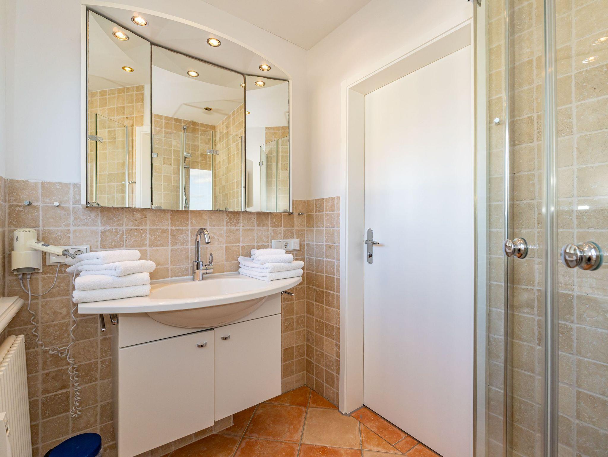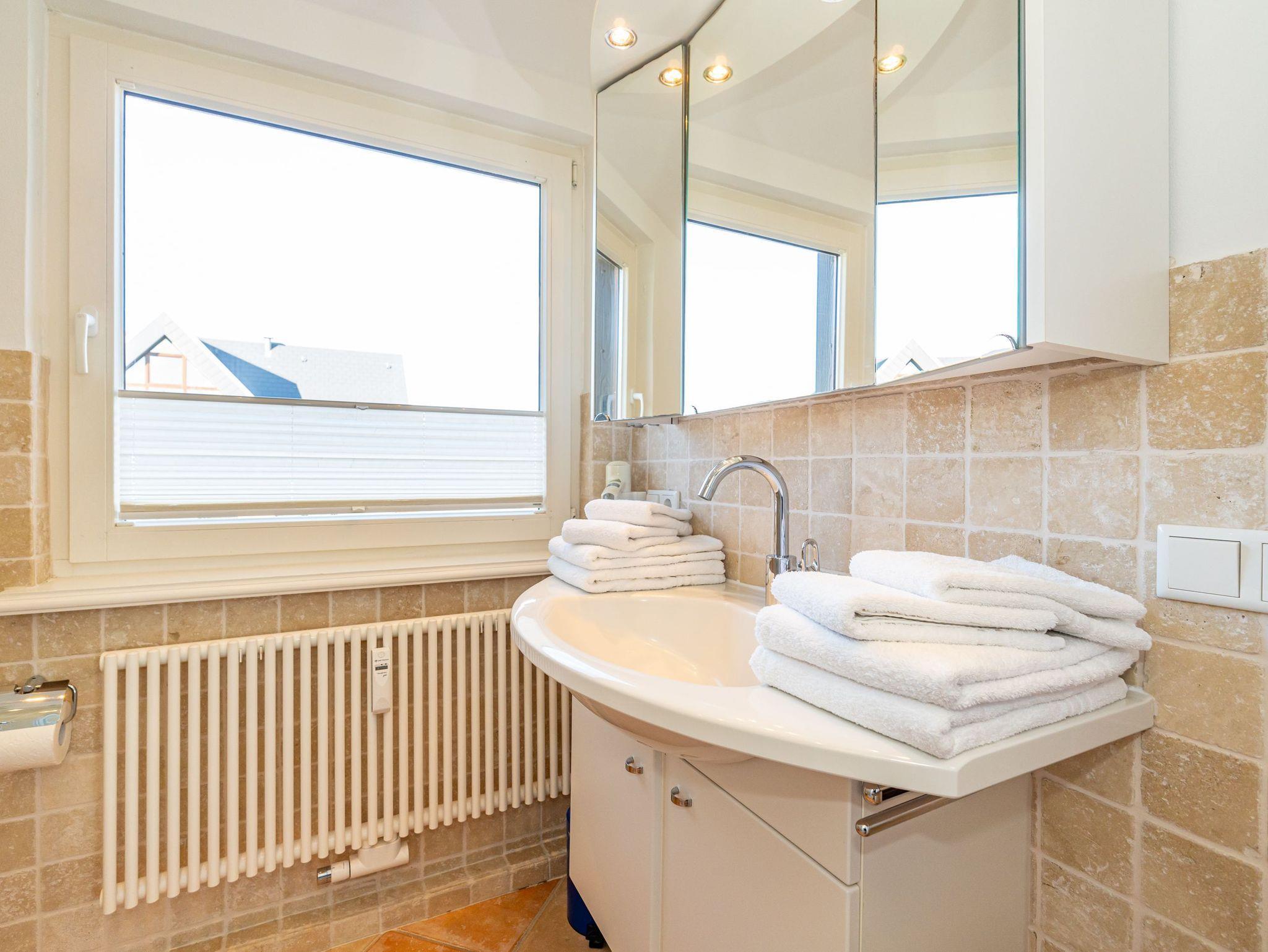 Das neuwertige Badezimmer mit Natursteinboden mit Dusche (extraflacher Einstieg), Waschtisch, Handtuchtrockner, Fön, WC und Fenster lässt Sie perfekt in den Urlaubstag starten. Über eine bequem begehbare Treppe gelangen Sie auf die offene Empore, die mit Teppichboden ausgelegt ist und Ihnen mit einem großzügigen Kleiderschrank sowie kleineren Nebenschränken ausreichend Stauraum bietet ? ideal, um Koffer und weiteres Gepäck unterzustellen.