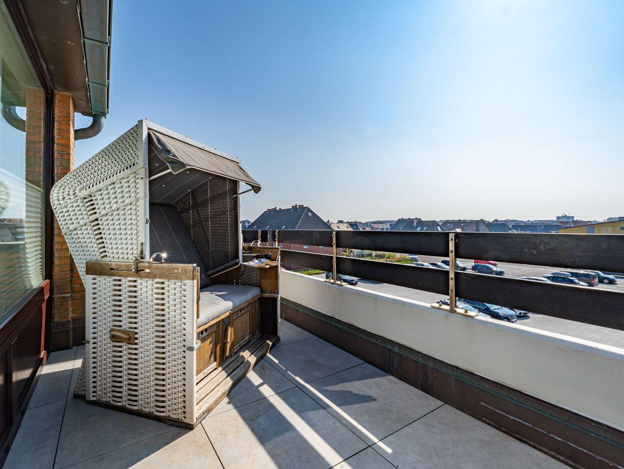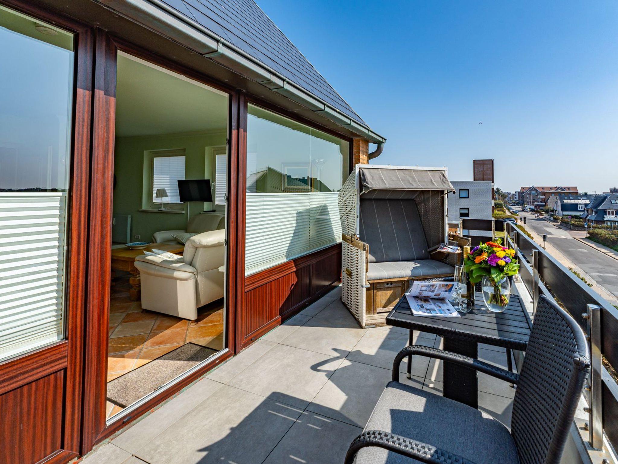 Ruhige Eck-Ferienwohnung in der obersten Etage direkt am Standübergang mit Südbalkon, Strandkorb und PKW-Stellplatz am Haus