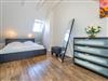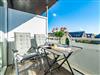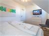 Vom Vorflur mit Garderobe gelangt man in das kleine Schlafzimmer mit Doppelschlafcouch (1,50 x 2,00 m) und verfügt über ein Flachbild-TV. Von dem Flur gelangt man in das Wohnzimmer (mit Austritt zum Balkon), und in das Duschbad/WC.
