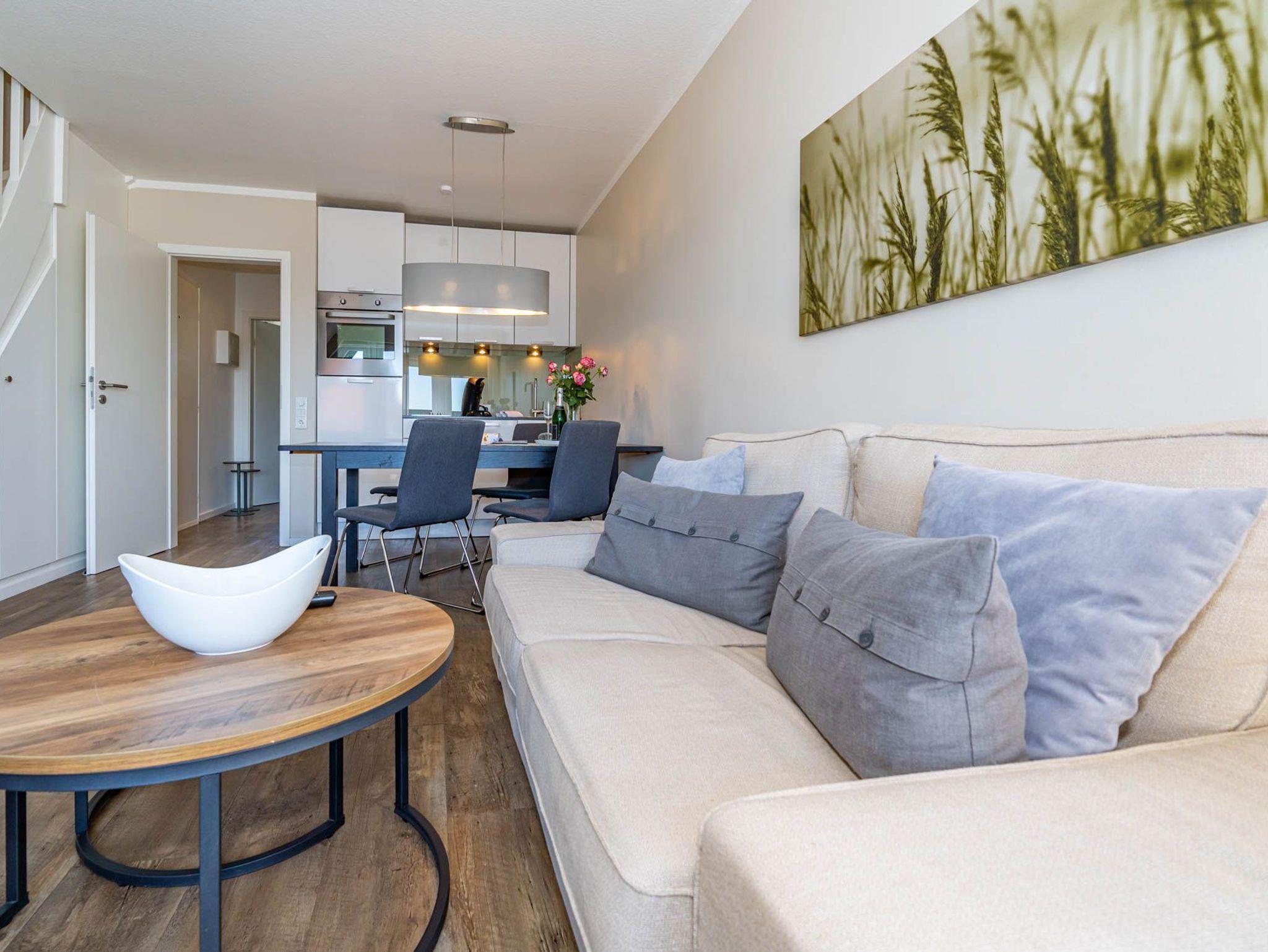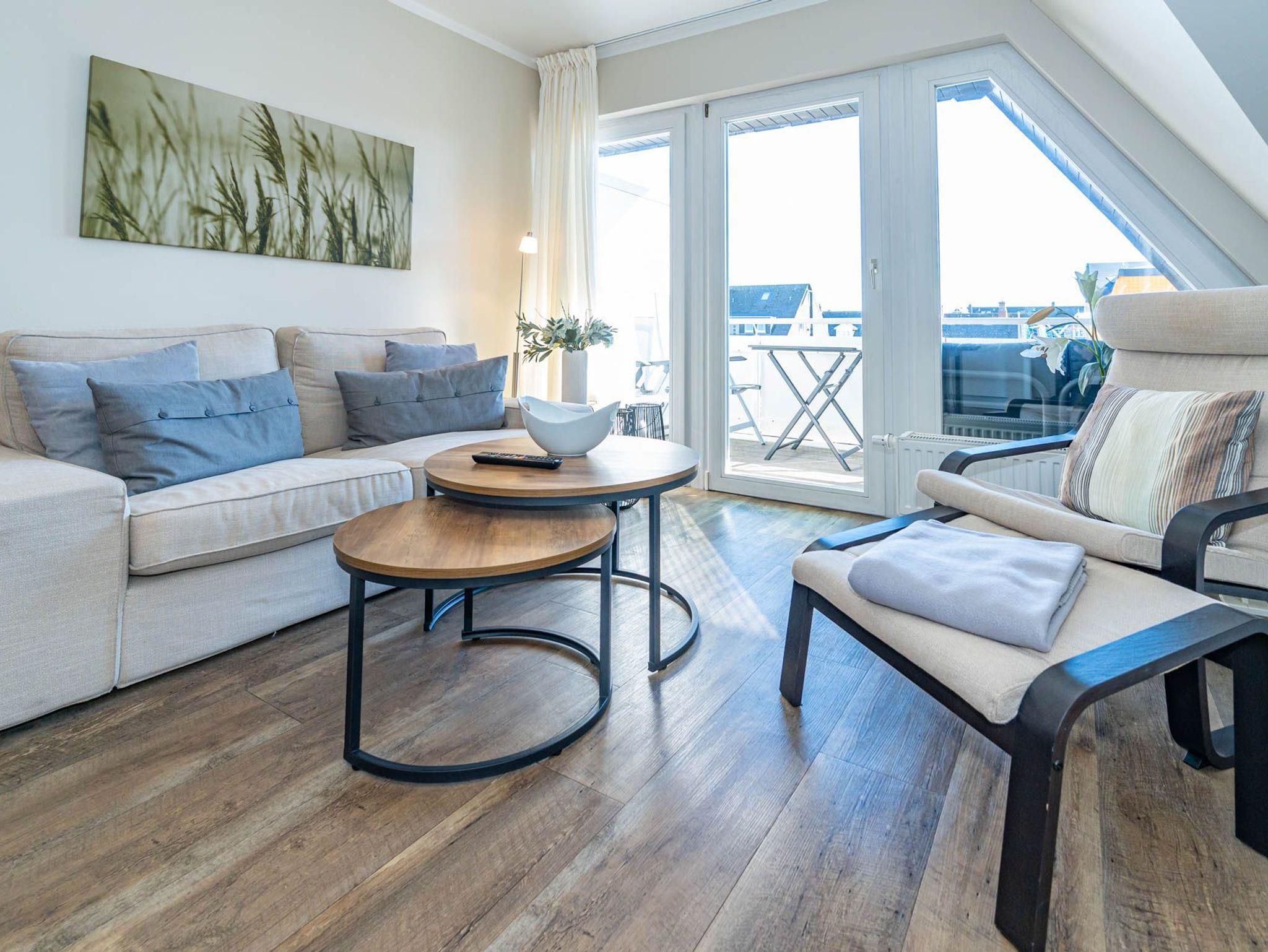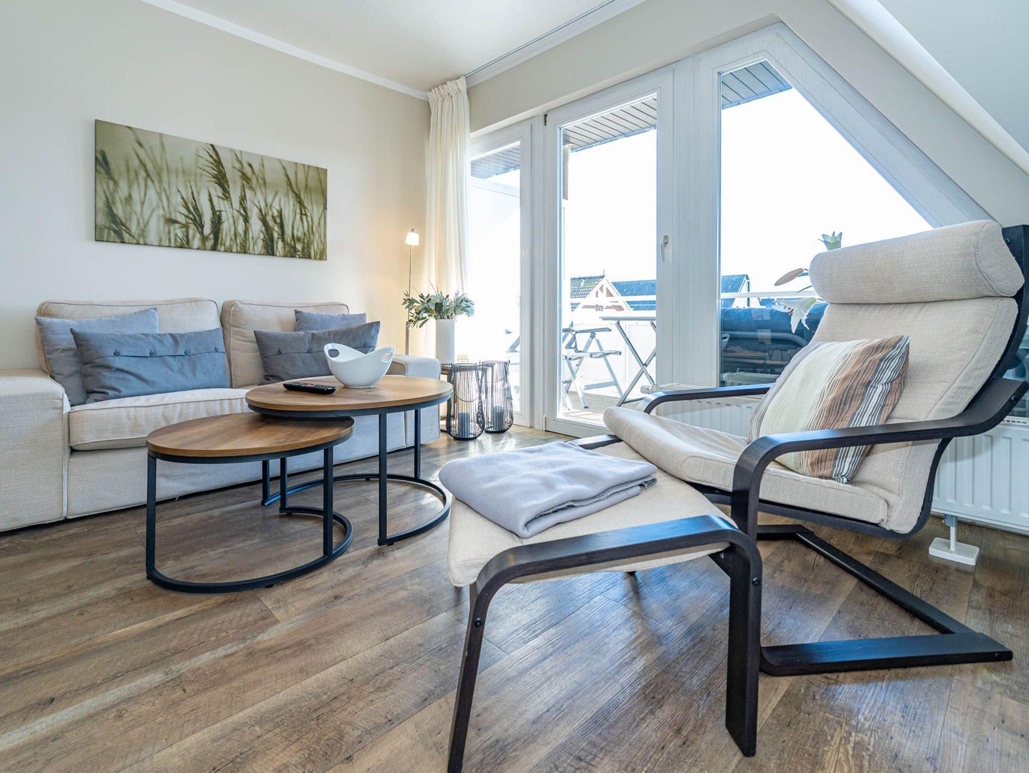 Hochwertig, geschmackvoll und gemütlich eingerichtete 3-Zimmer-Nichtraucher-Ferienwohnung ca. 67 qm, komplett mit Designerboden in Holzoptik ausgelegt in der 2. Etage zur Südseite mit Südbalkon (ganztägig Sonne, mit Balkonmöbeln und Auflagen) für max. 4 Personen.