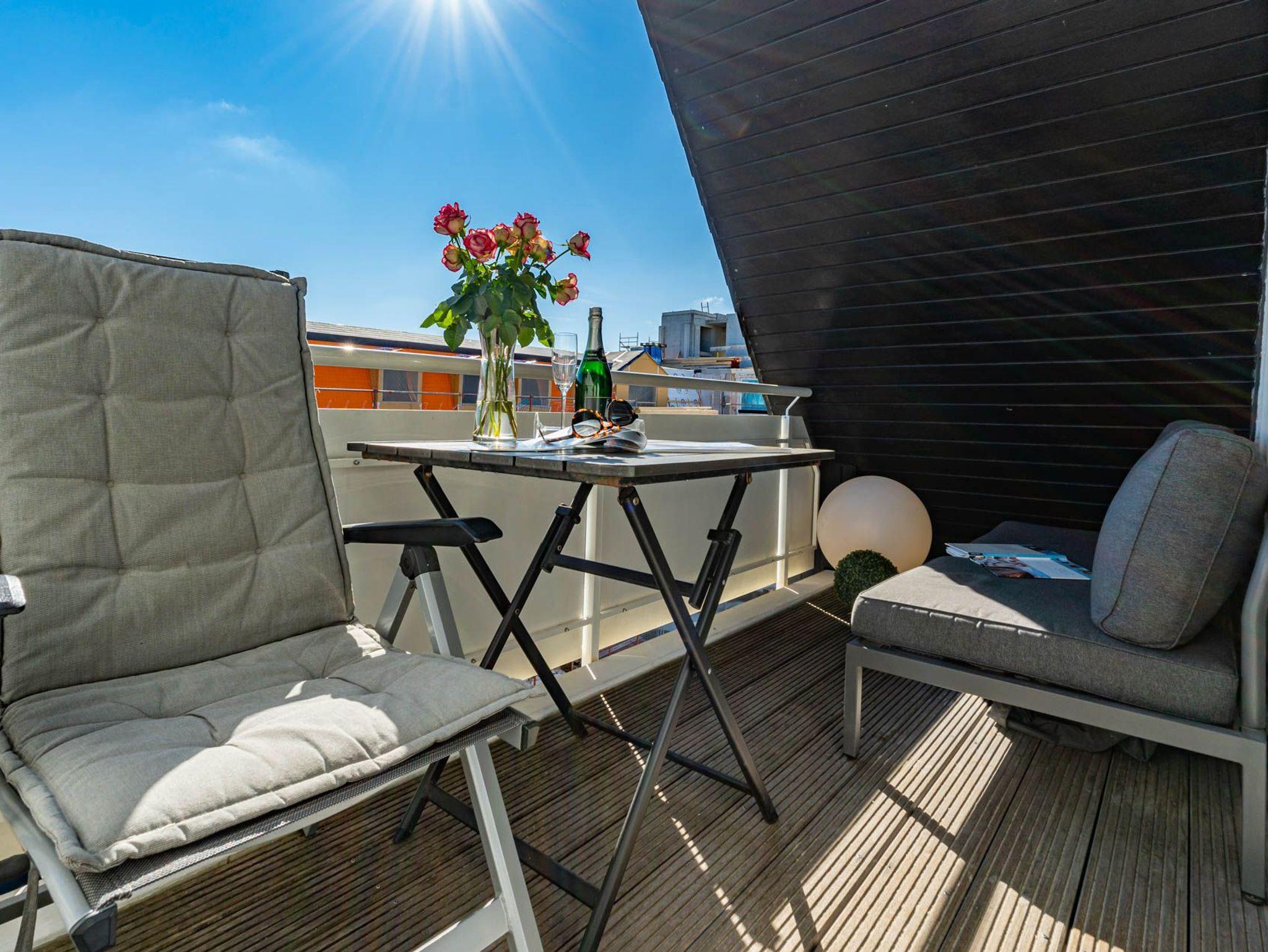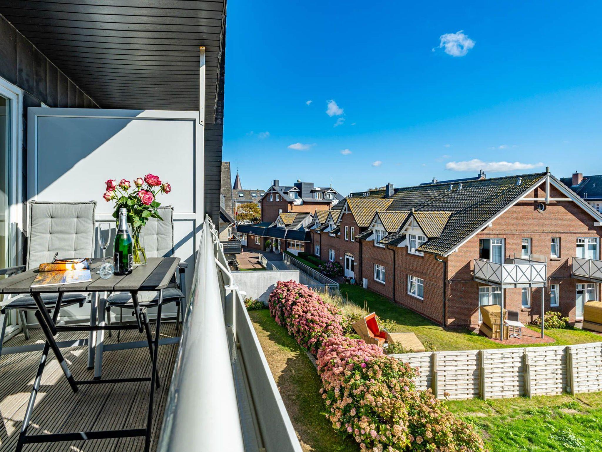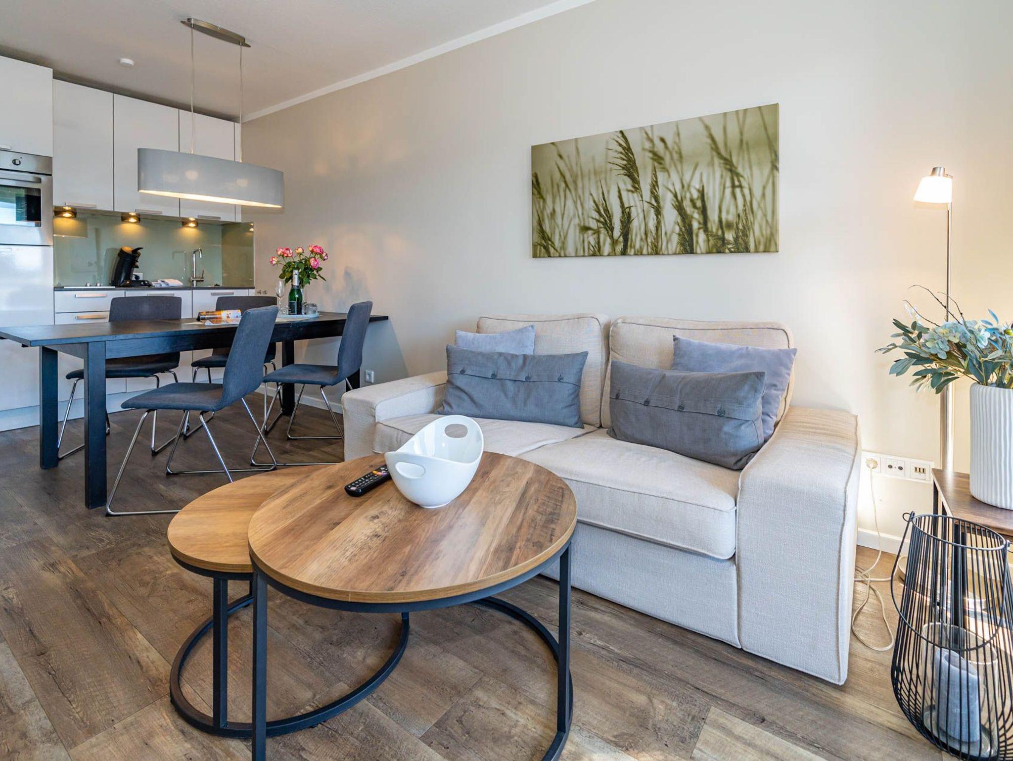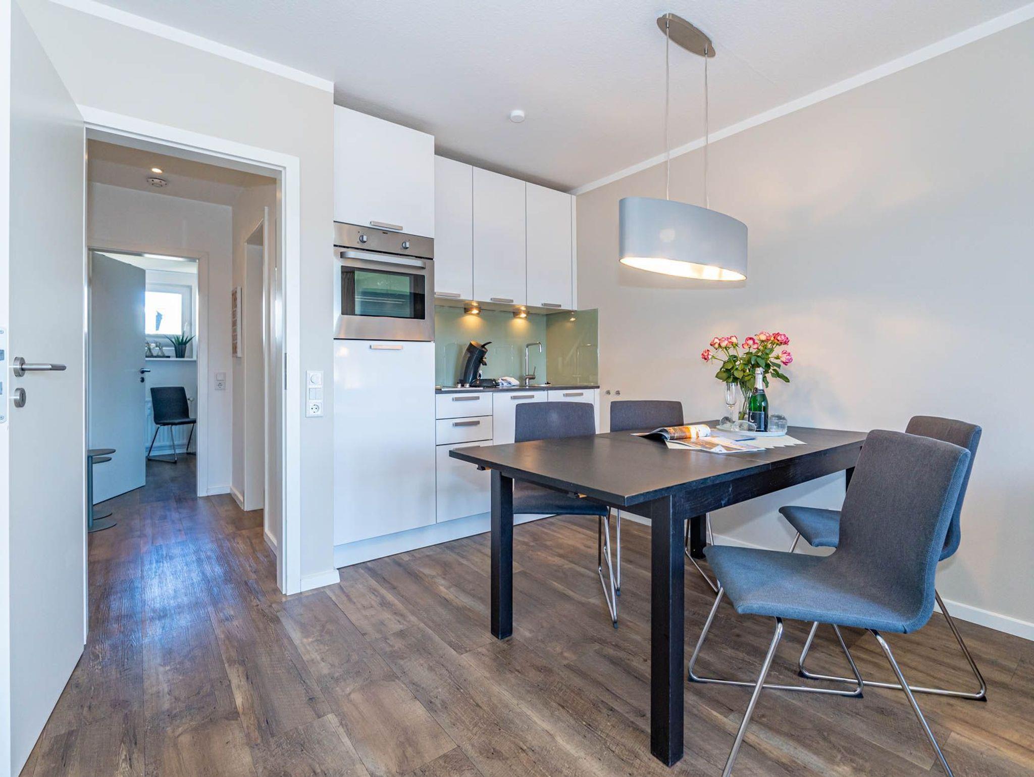 Hochwertig, geschmackvoll und gemütlich eingerichtete 3-Zimmer-Nichtraucher-Ferienwohnung ca. 67 qm, komplett mit Designerboden in Holzoptik ausgelegt in der 2. Etage zur Südseite mit Südbalkon (ganztägig Sonne, mit Balkonmöbeln und Auflagen) für max. 4 Personen.