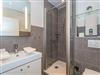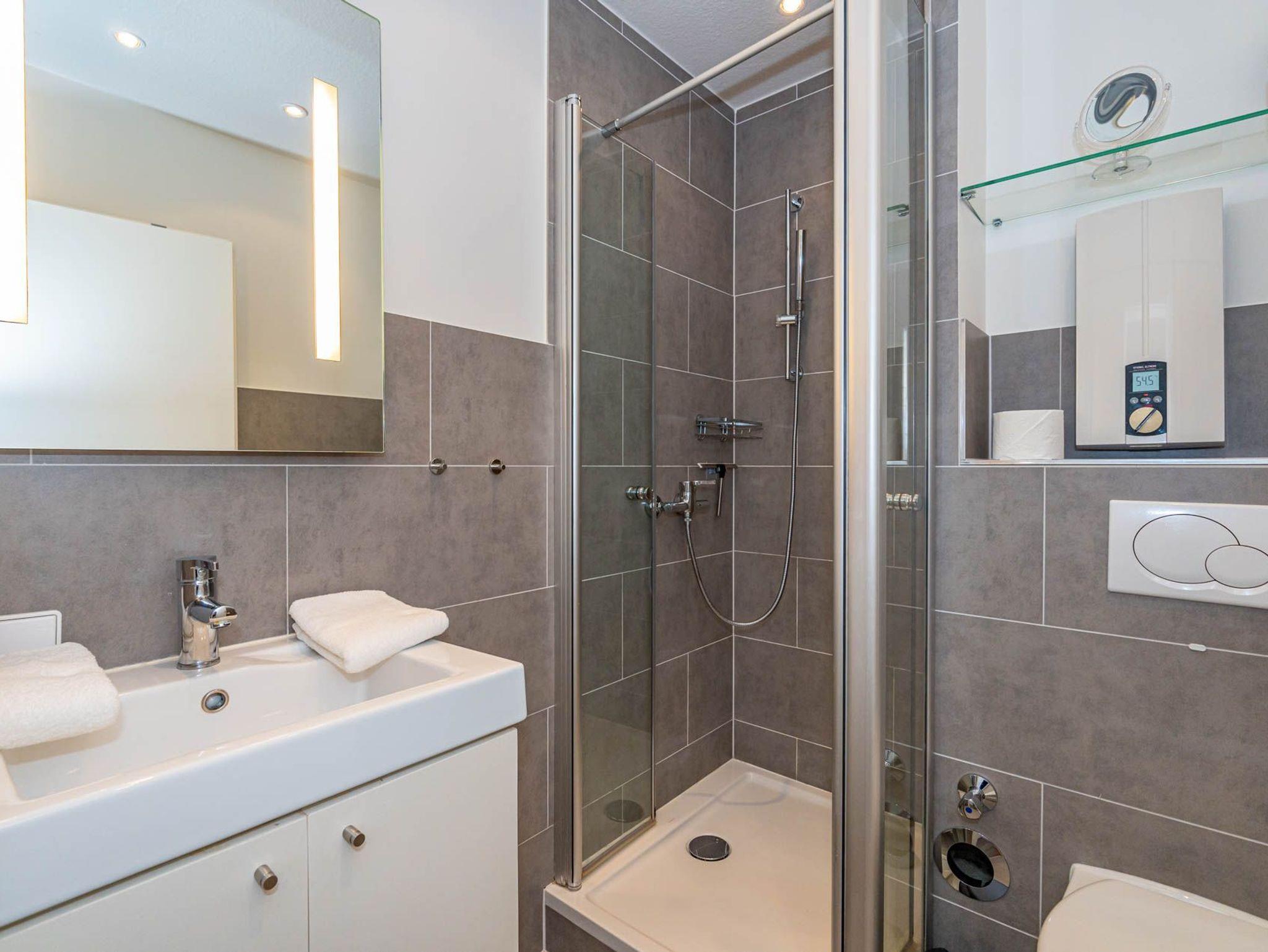 Im Bad befinden sich eine Dusche, ein WC, ein Waschtisch und ein Handtuchtrockner.