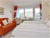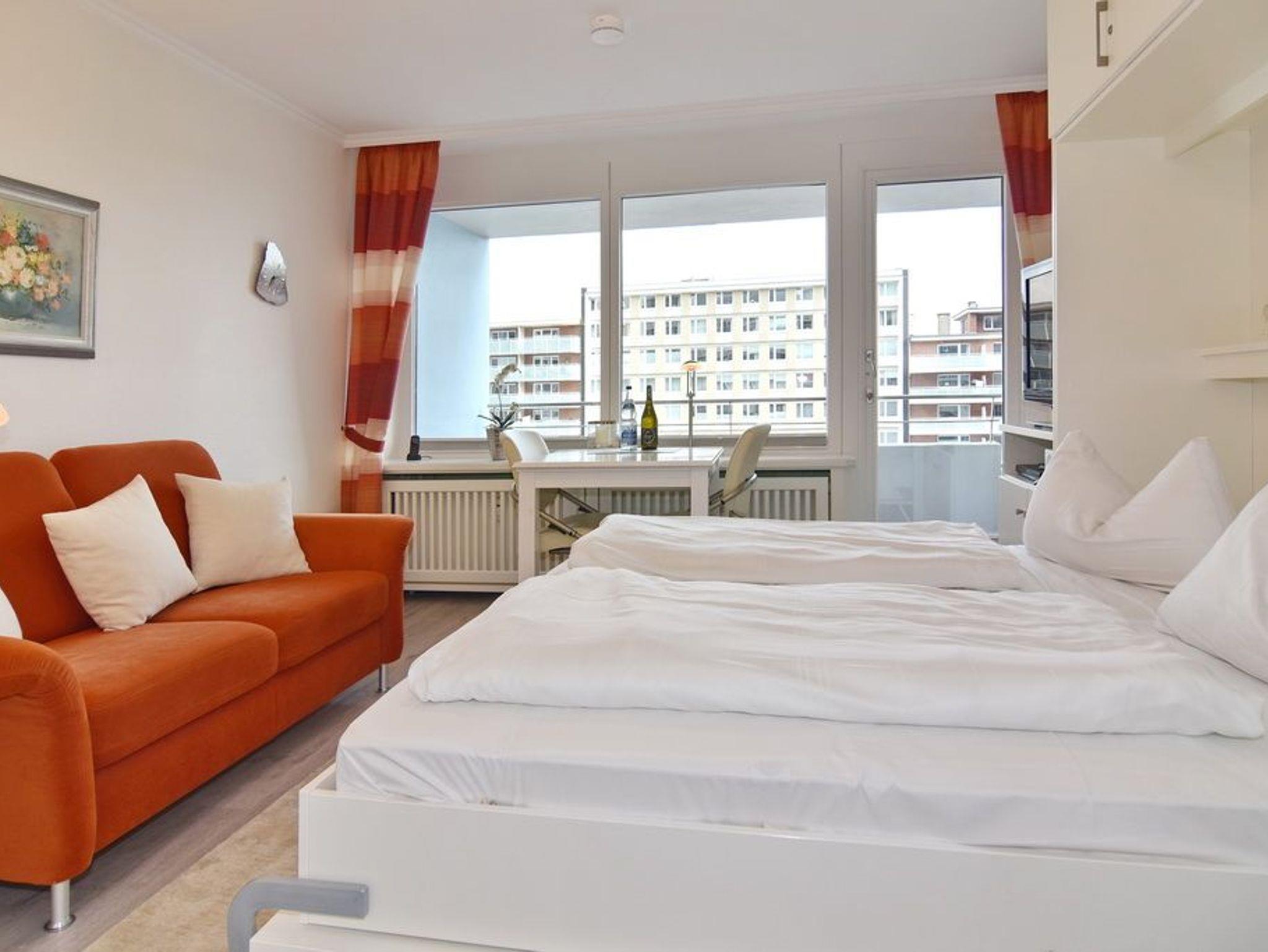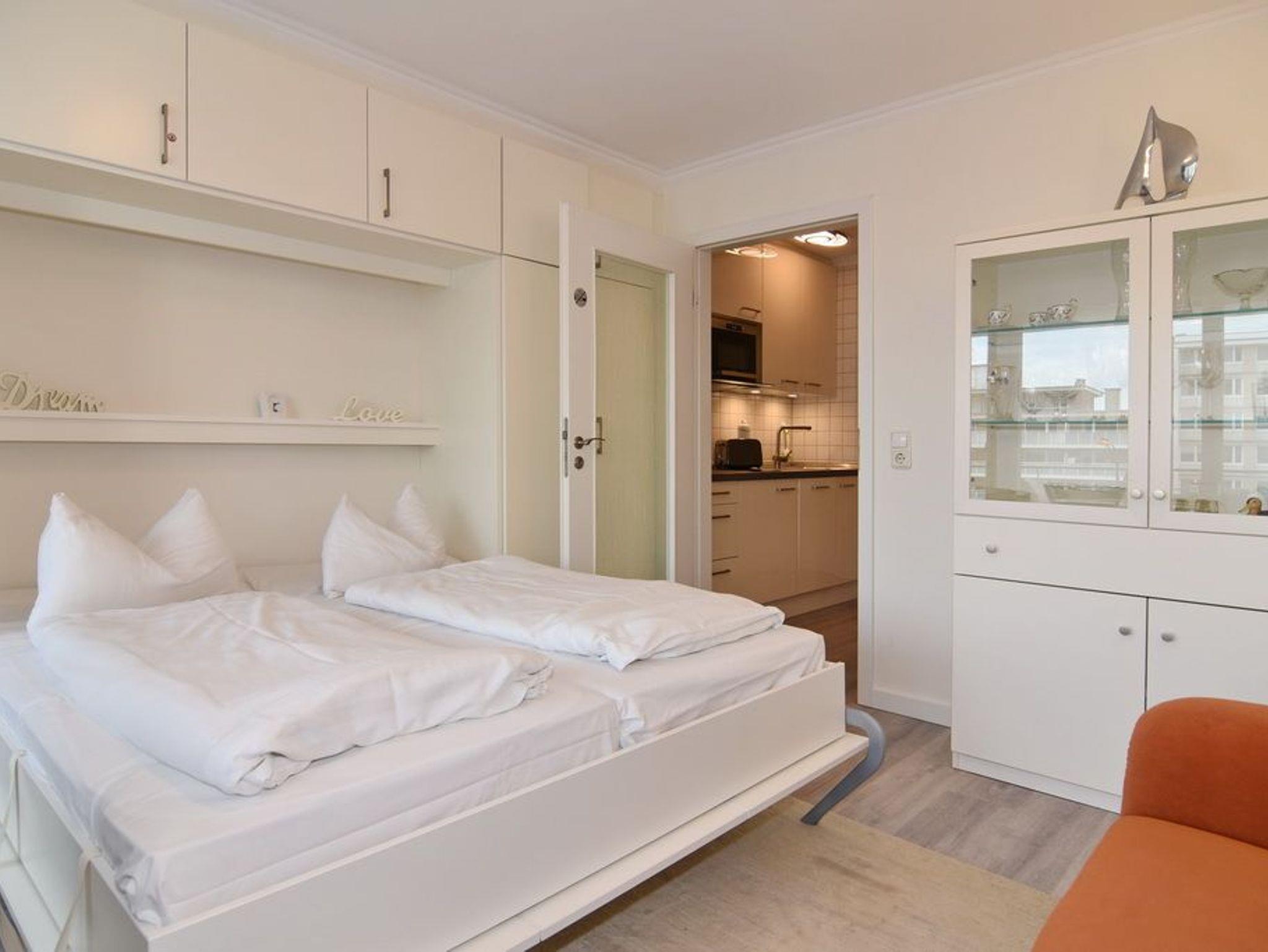 Strandnahe, helle und komfortable 1-Zimmer-Wohnung im 1. OG zur Landseite im Haus Metropol gelegen. Ca. 30 m². Der Wohn-/Schlafraum ist mit einem Doppelschrankbett, einer 2-Sitzer-Couch, dem Essplatz am Fenster sowie Flat-TV, Radio und WLAN (ohne Gewähr) ausgestattet. Der Balkon ist gen Osten ausgerichtet. Die moderne Küche ist mit einer Mikrowelle, einem Geschirrspüler und einem 2-Platten-Cerankochfeld ausgestattet. Helles Badezimmer mit Duschbad /WC, Kosmetikspiegel und Föhn.