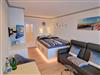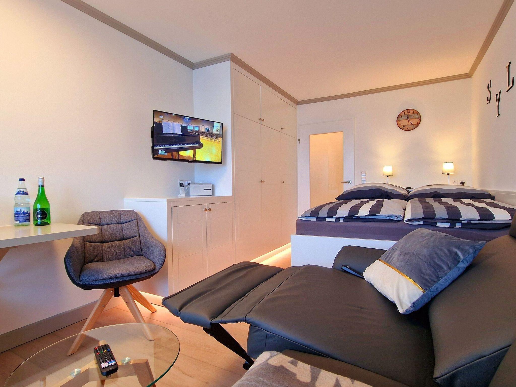 1-Zimmer-Apartment mit freiem Seeblick im 11. OG des Haus Metropol, ca. 25 m². Kombinierter Wohn- und Schlafraum mit festem Doppelbett (140x200 cm), 2er-Sofa mit elektronischer Liegefunktion, Esstisch mit gemütlichen Stühlen, Smart-TV, Festnetzanschluss, seperatem WLAN und möblierten Westbalkon. Hübsche Küchenzeile mit Geschirrspüler, Mikrowelle, 2er-Cerankochfeld und extra Senseo Kaffeemaschine. Duschbad mit WC. Tierhaltung und Rauchen ist in der Wohnung ist nicht gestattet.