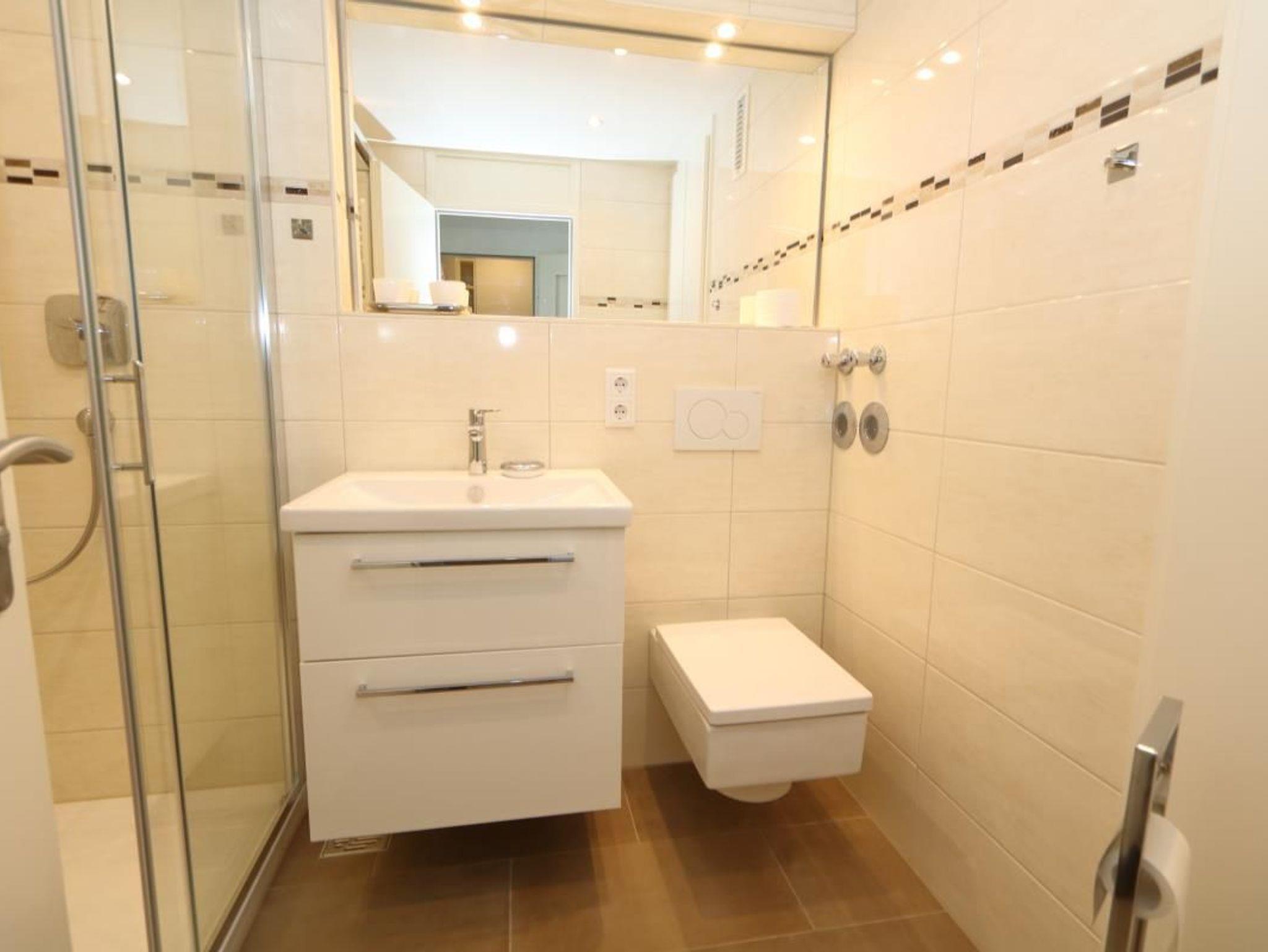 Das Badezimmer mit Glasduschkabine ist sehr modern und besitzt mehrere Handtuchhalterungen (teilweise mit Wärmezufuhr). Ein Föhn ist ebenfalls vorhanden. Der Schlaf-und Wohnbereich ist vielseitig eingerichtet und ist folgendermaßen ausgestattet: