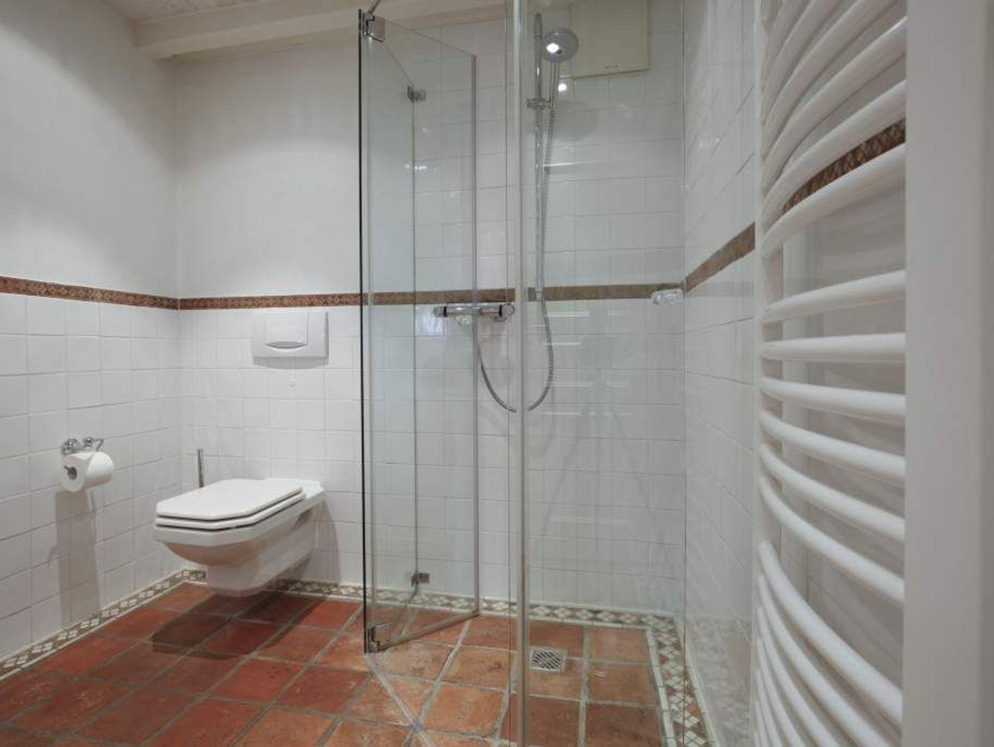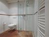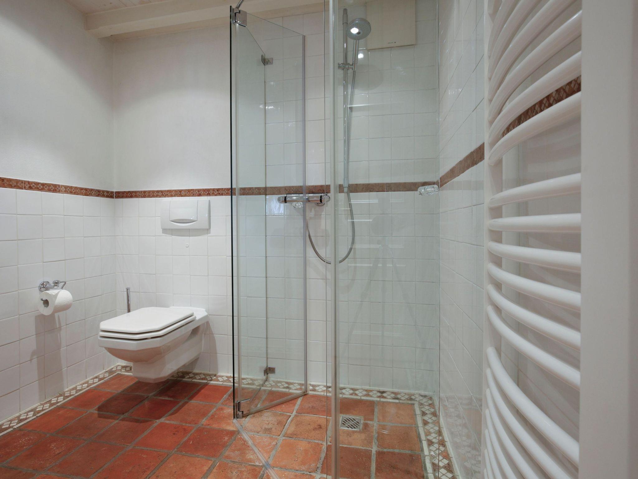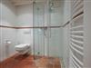Im Bad befinden sich eine Dusche, ein WC und ein Waschbecken.