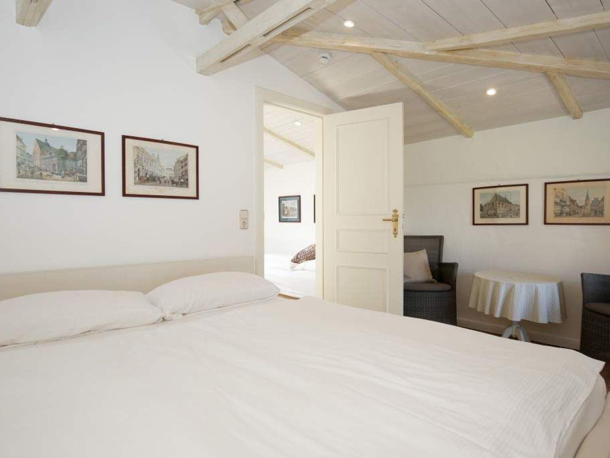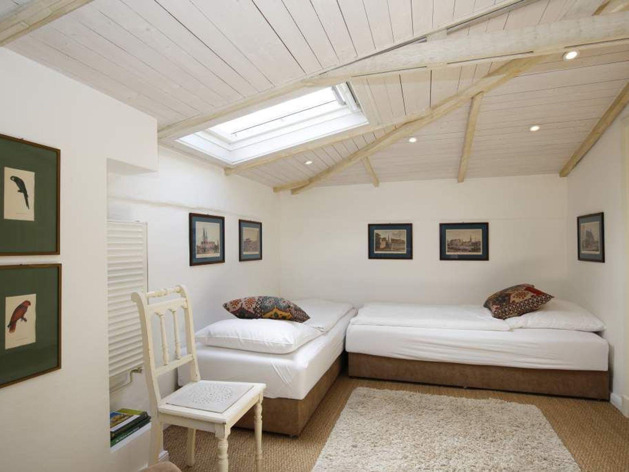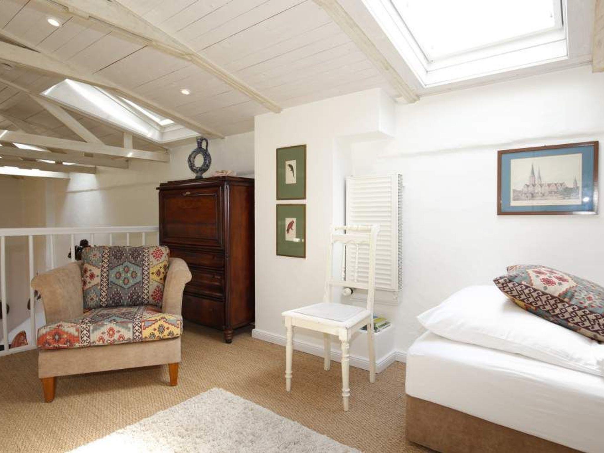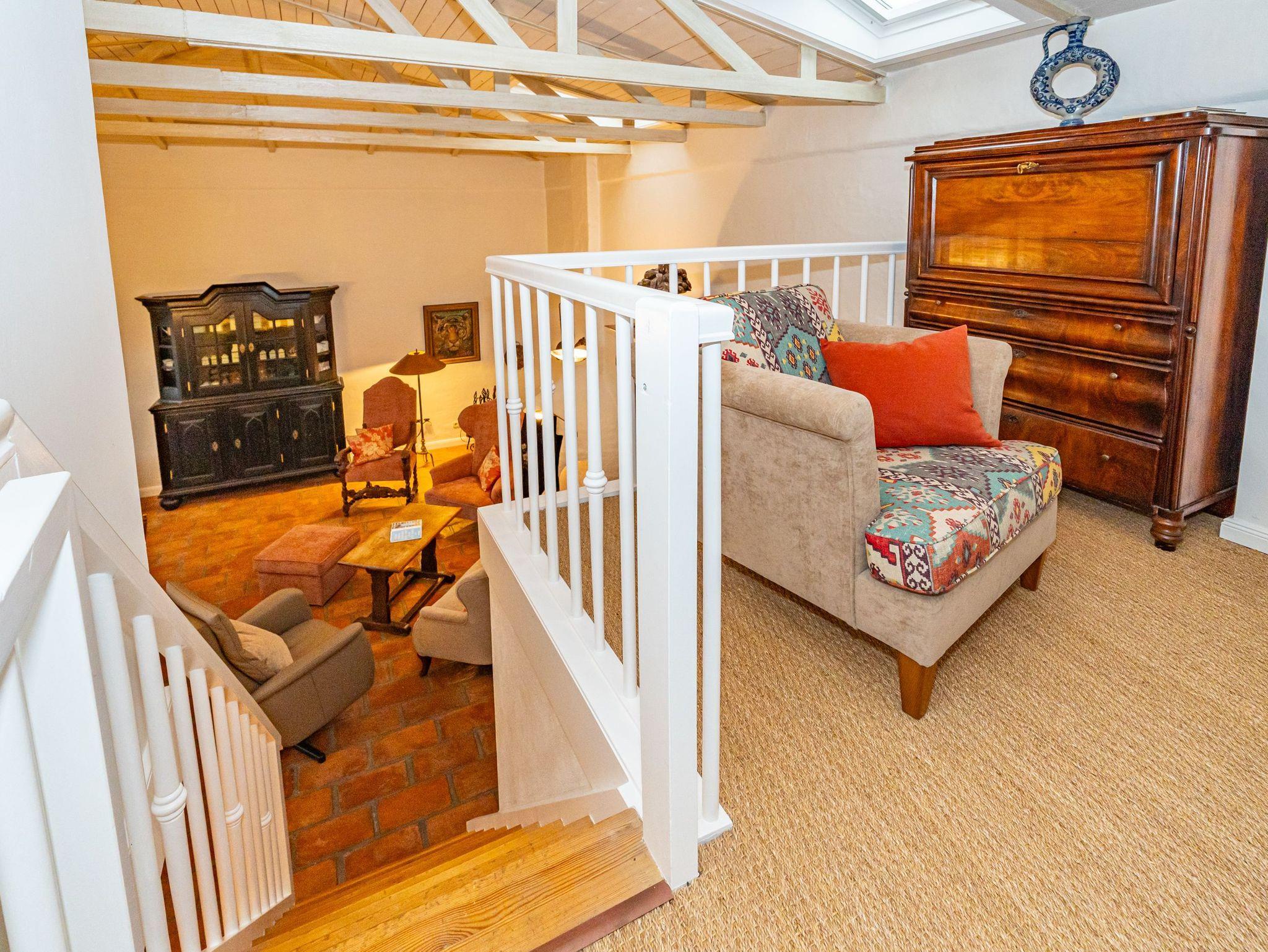 Im OG befinden sich zwei über Eck stehende Betten (0,90 x 2,00 m) und ein Sessel auf der offenen Empore.