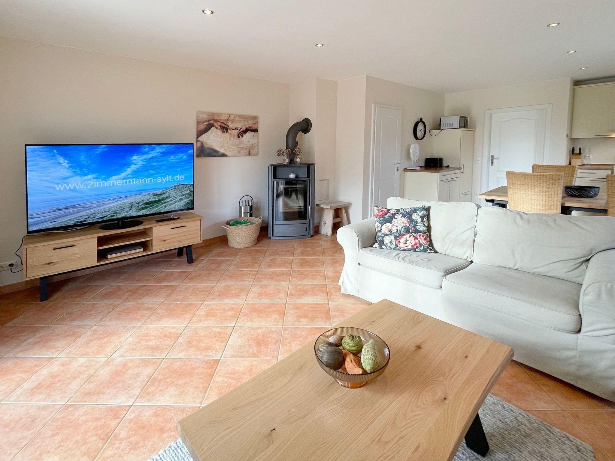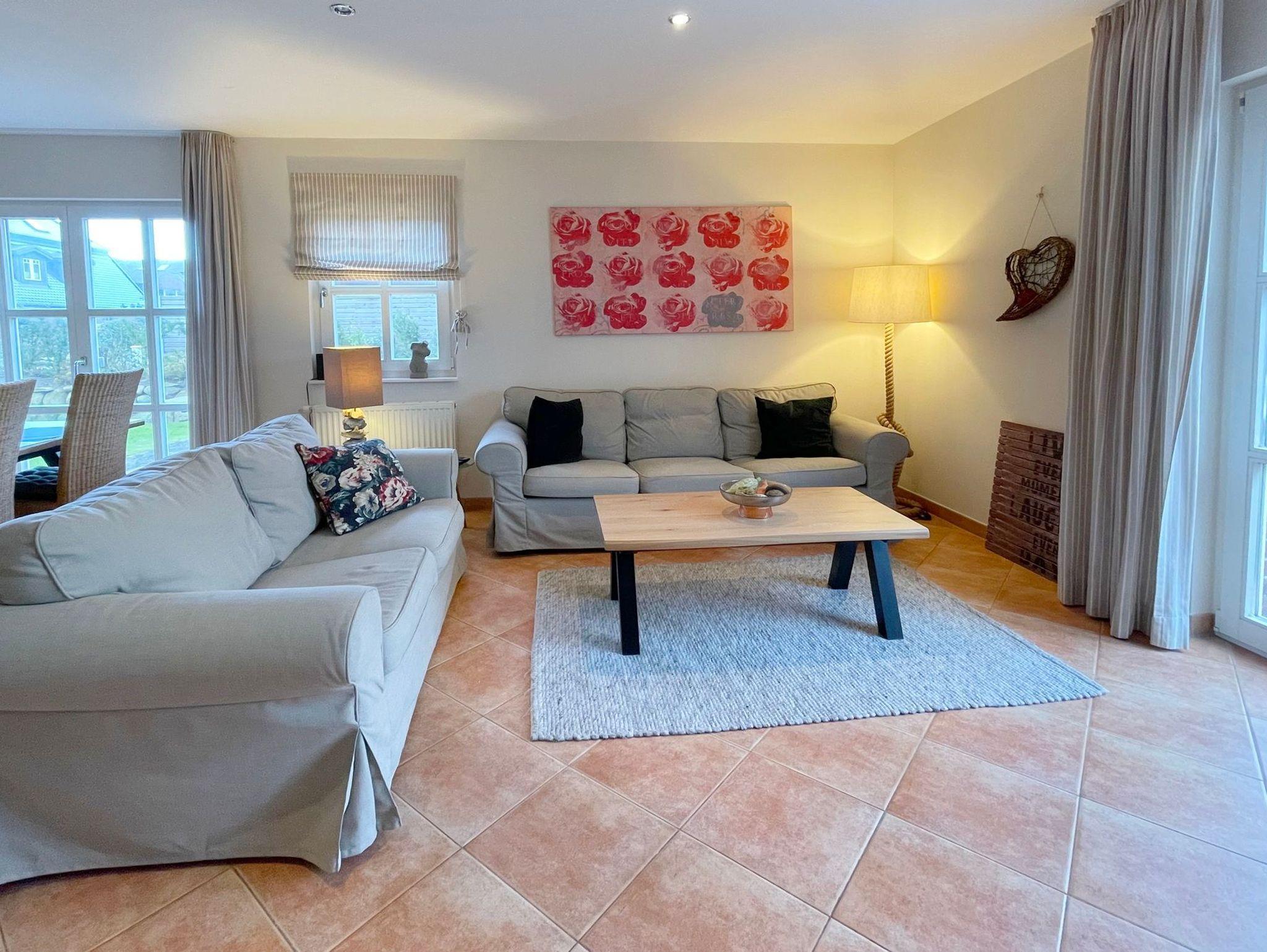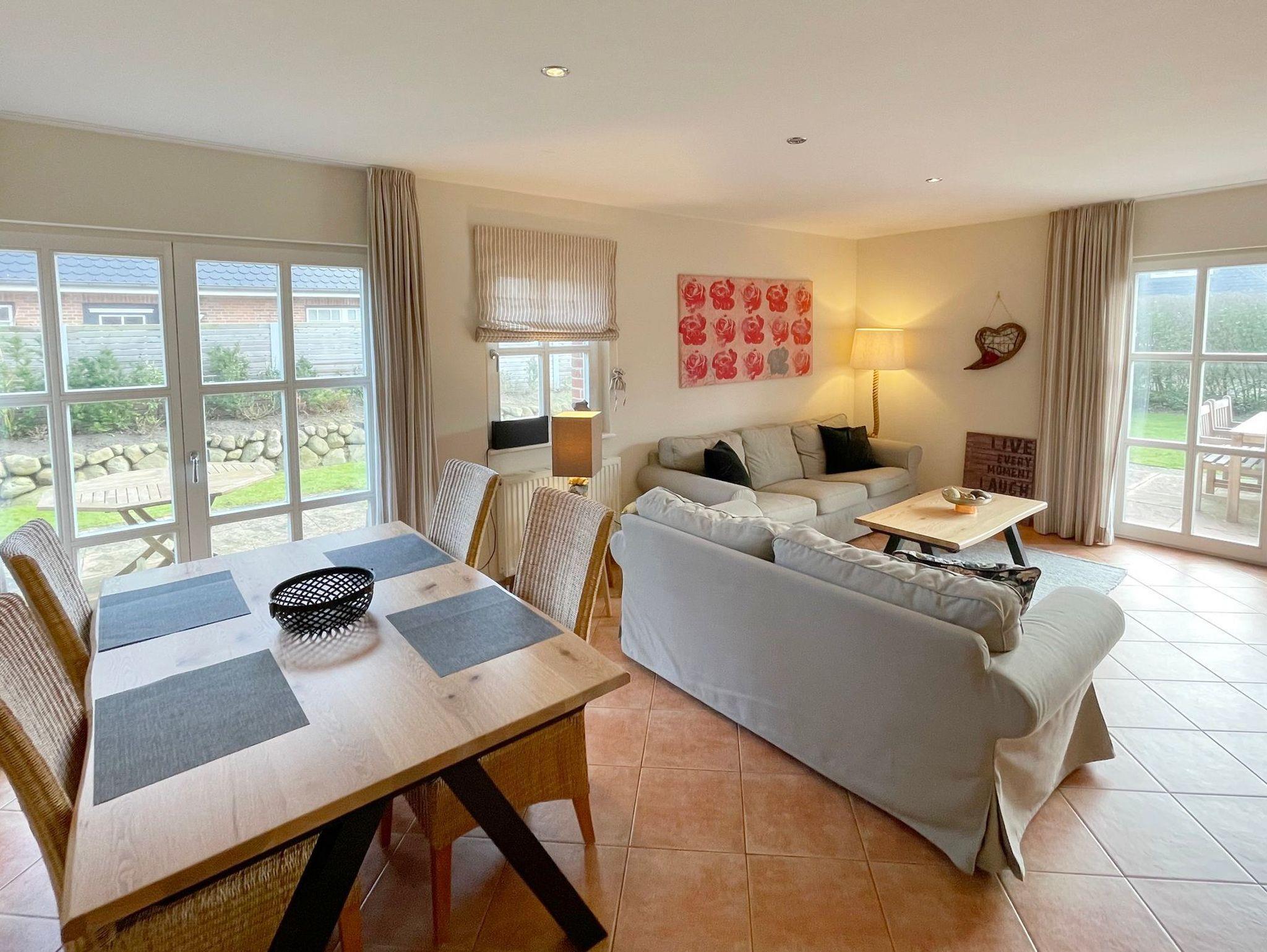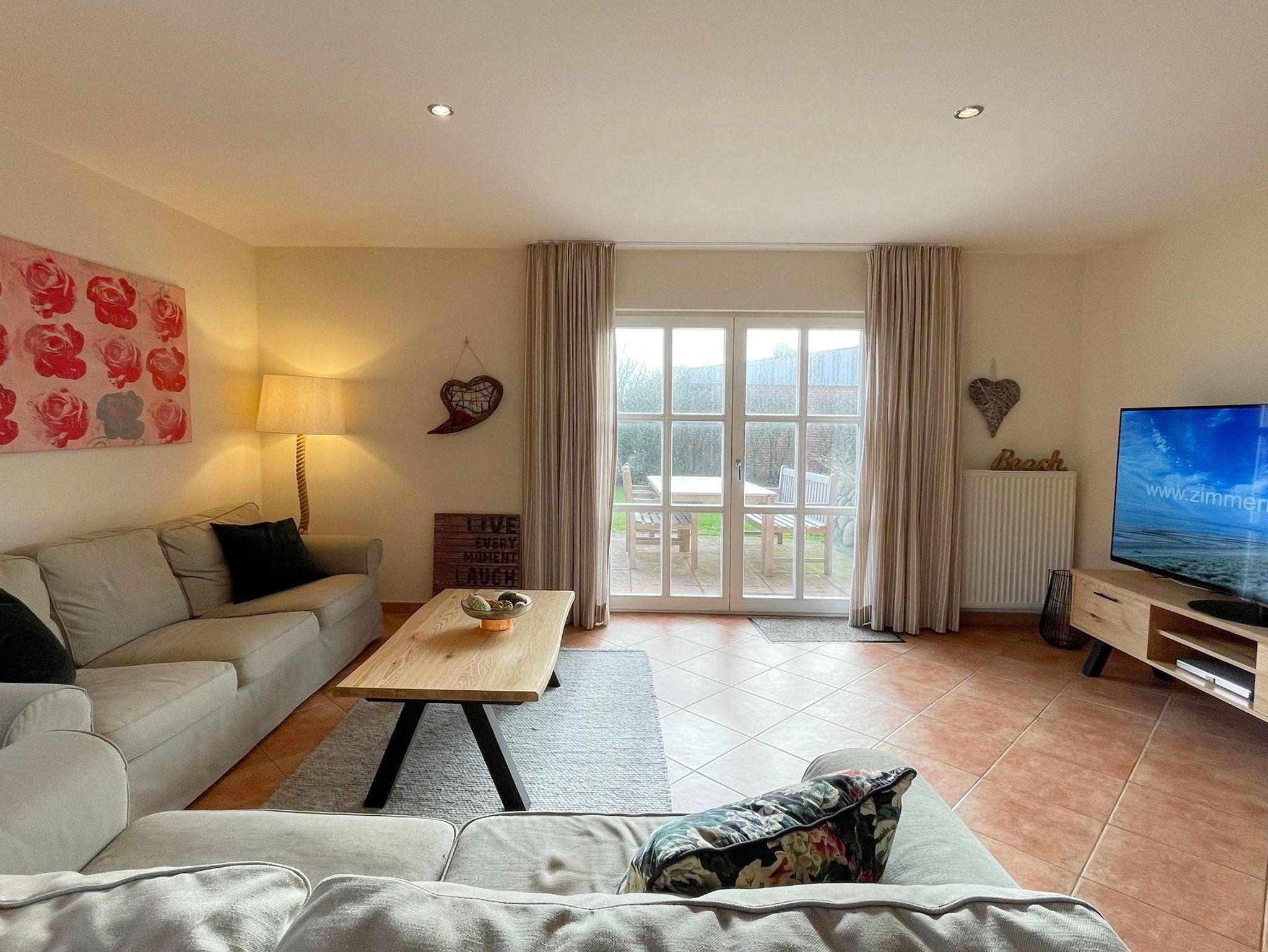 Reihenendhausteil mit 2 Terrassen in zentraler, strandnaher Lage, Wohnzimmer mit Sitzgruppe und Eßecke, Kaminofen, Fernseher (Smart-TV[nbsp] offene Küche mit Geschirrspüler und Backofen, 2 Bäder mit Waschbecken und WC, 2 Schlafzimmer mit Doppelbett für je 2 Personen, Waschmaschine und Trockner
