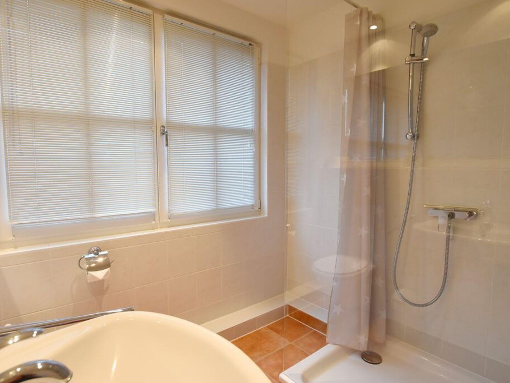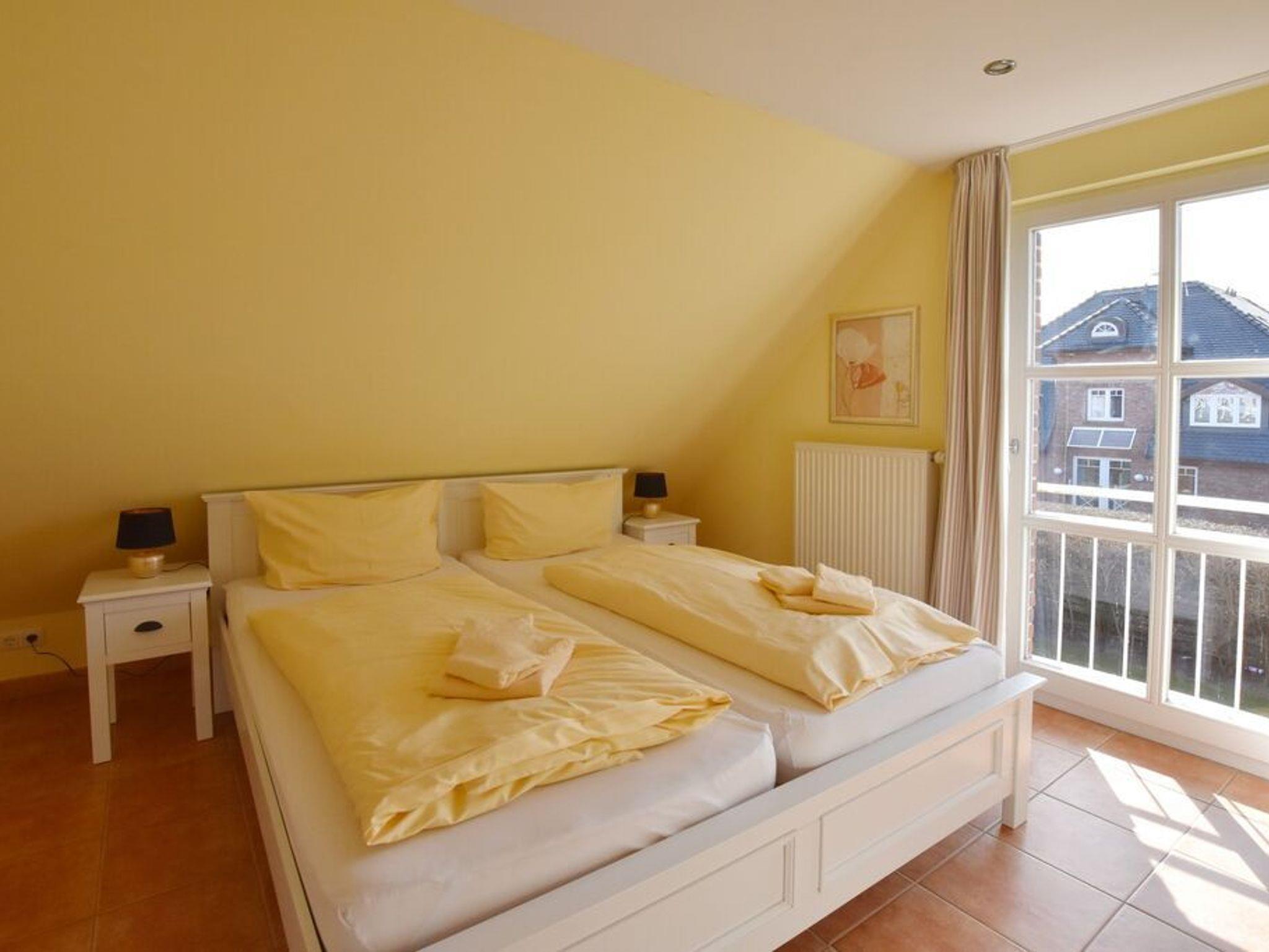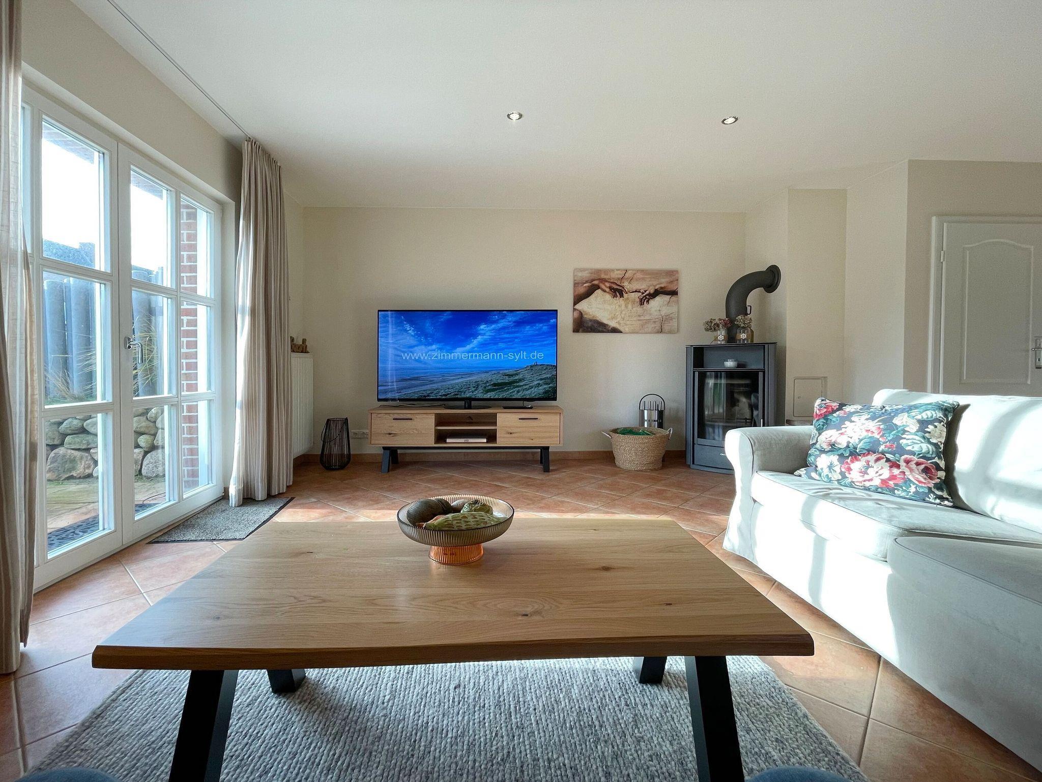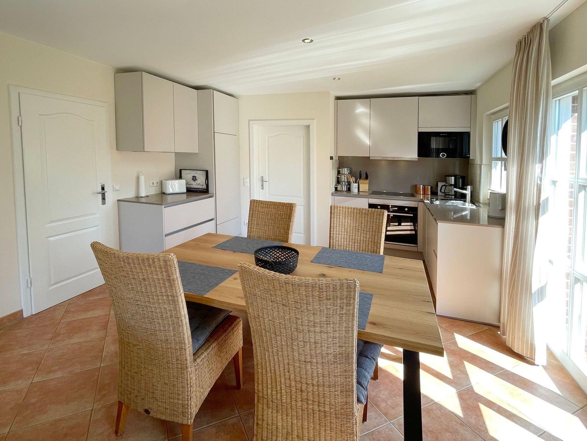 Reihenendhausteil mit 2 Terrassen in zentraler, strandnaher Lage, Wohnzimmer mit Sitzgruppe und Eßecke, Kaminofen, Fernseher (Smart-TV[nbsp] offene Küche mit Geschirrspüler und Backofen, 2 Bäder mit Waschbecken und WC, 2 Schlafzimmer mit Doppelbett für je 2 Personen, Waschmaschine und Trockner