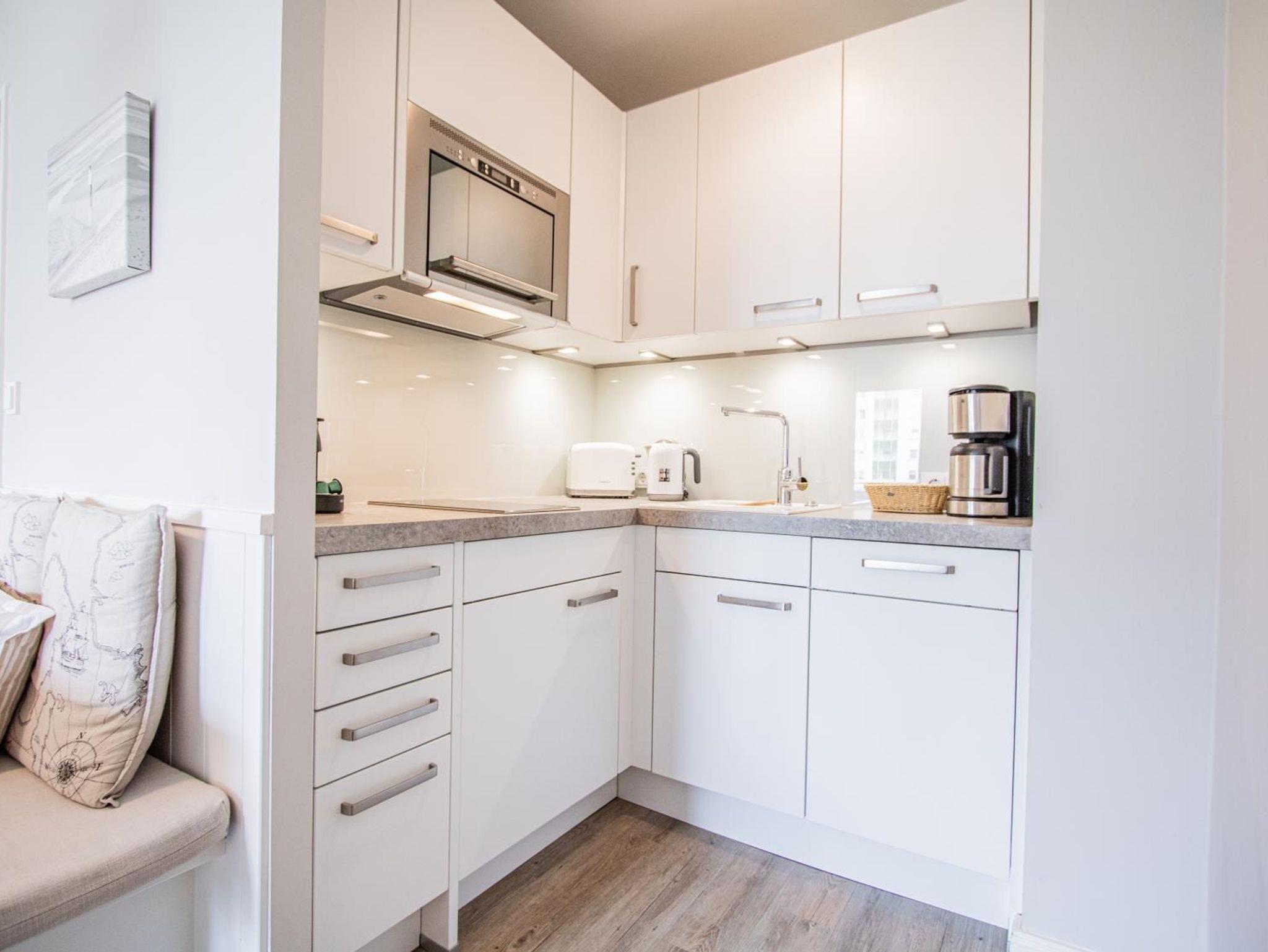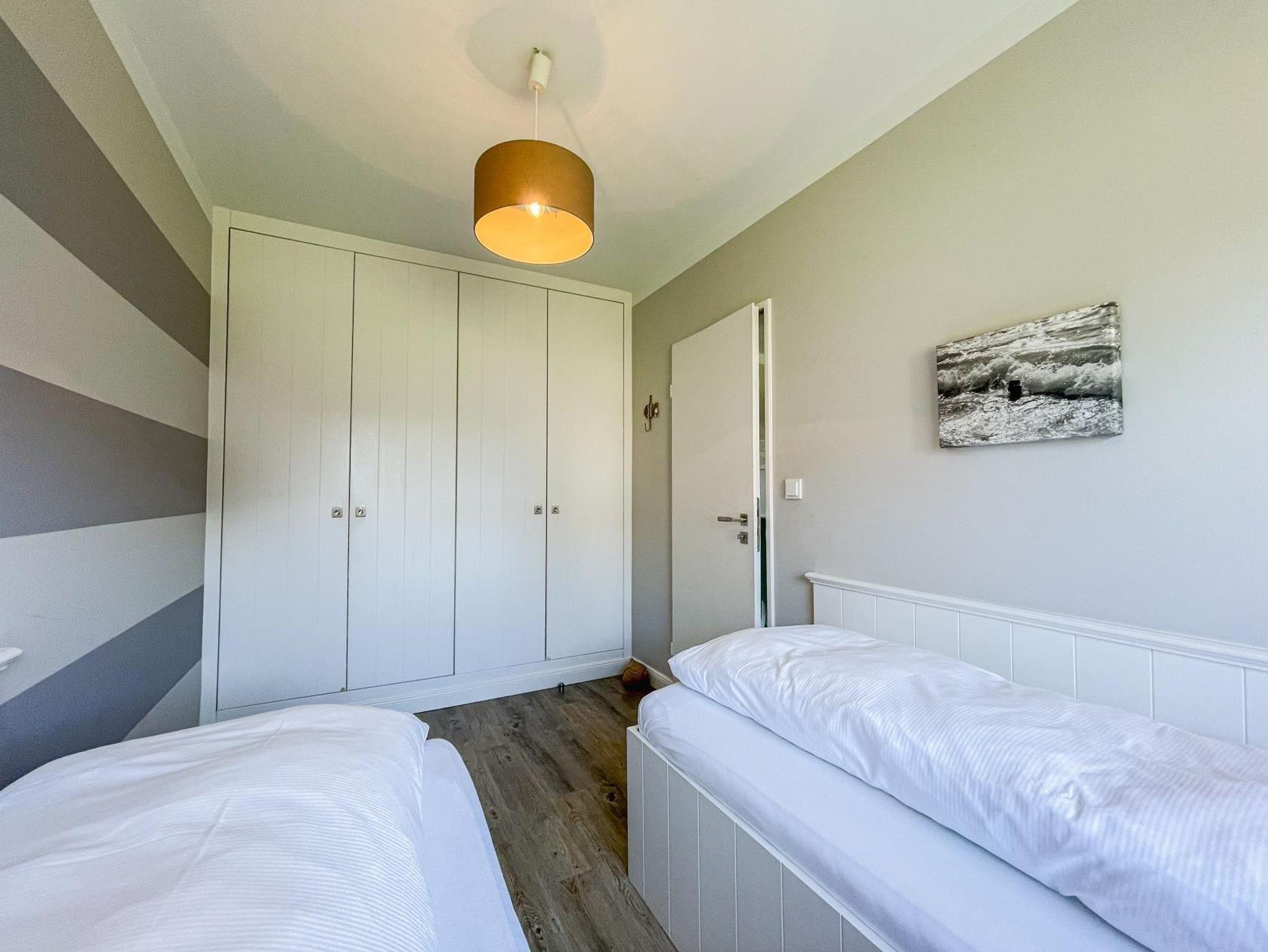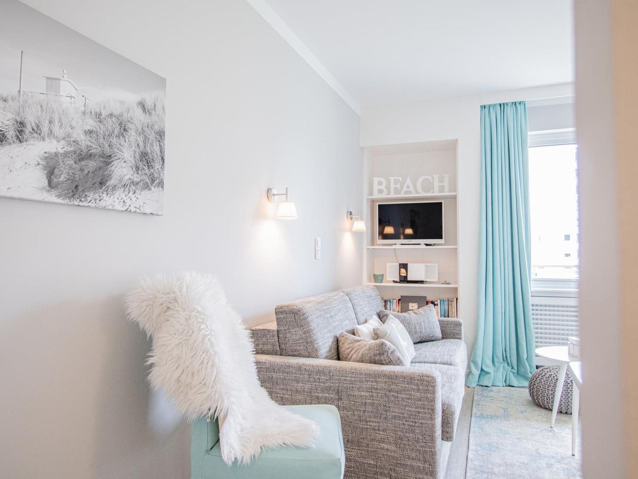 Hochwertig und geschmackvoll eingerichtetes 2-Zimmer-Appartement im Süden von Westerland in sehr ruhiger Lage. Im separaten Schlafzimmer befinden sich 2 Einzelbetten und ein großer, geräumiger Einbauschrank. Im Wohnzimmer ist ein Schlafsofa und der Zugang zum Westbalkon. Das Besondere im Wohnzimmer ist ein elektrischer Kamin. Die offene Küche ist komplett ausgestattet mit u. a. Spülmaschine und Mikrowelle mit Backfunktion.