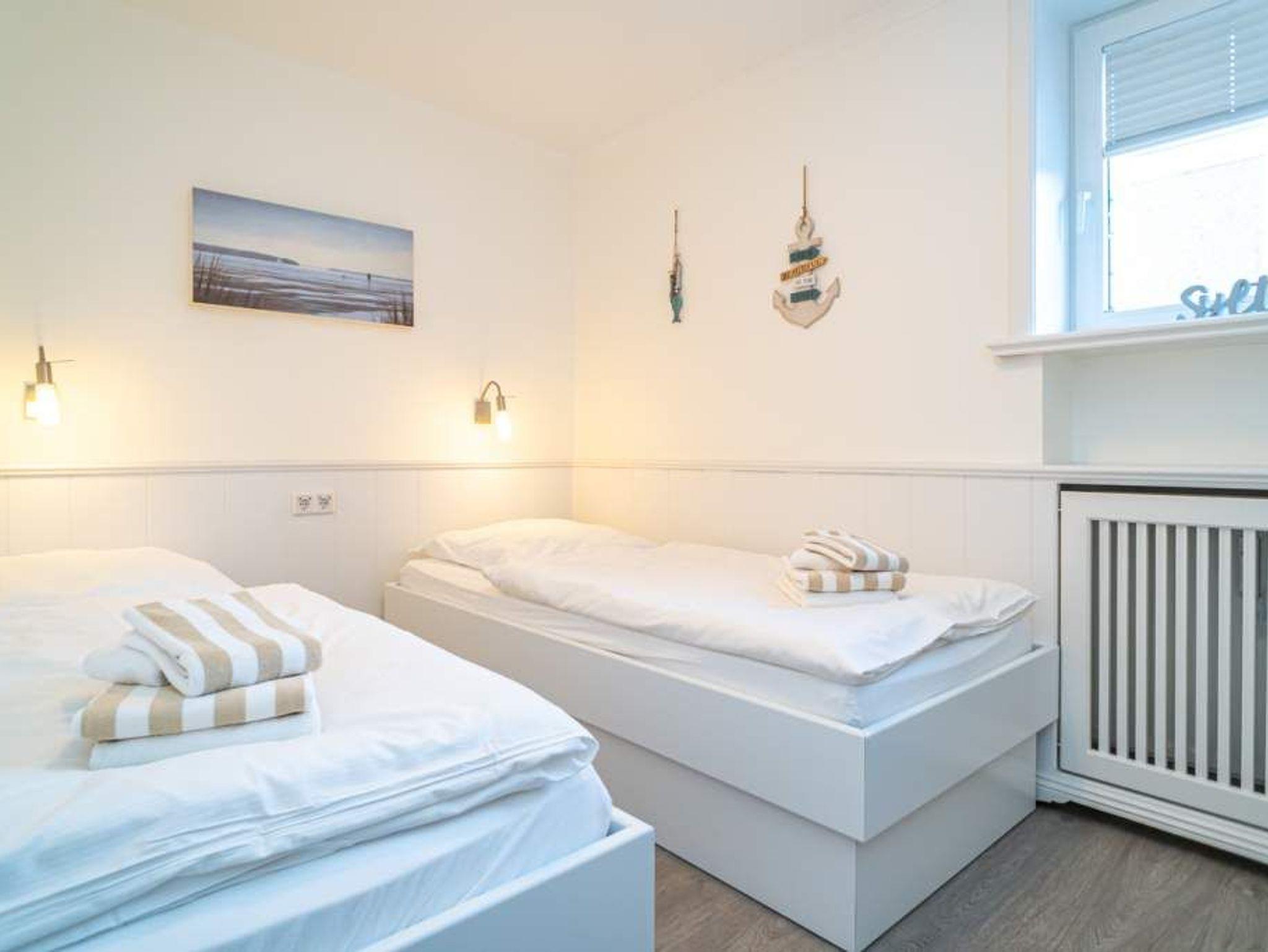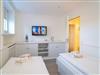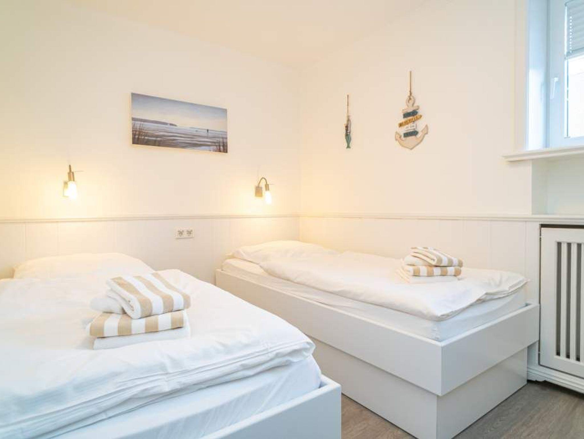 Das Schlafzimmer ist mit zwei auseinander stehenden Einzelbetten und einem Flachbild-TV ausgestattet.