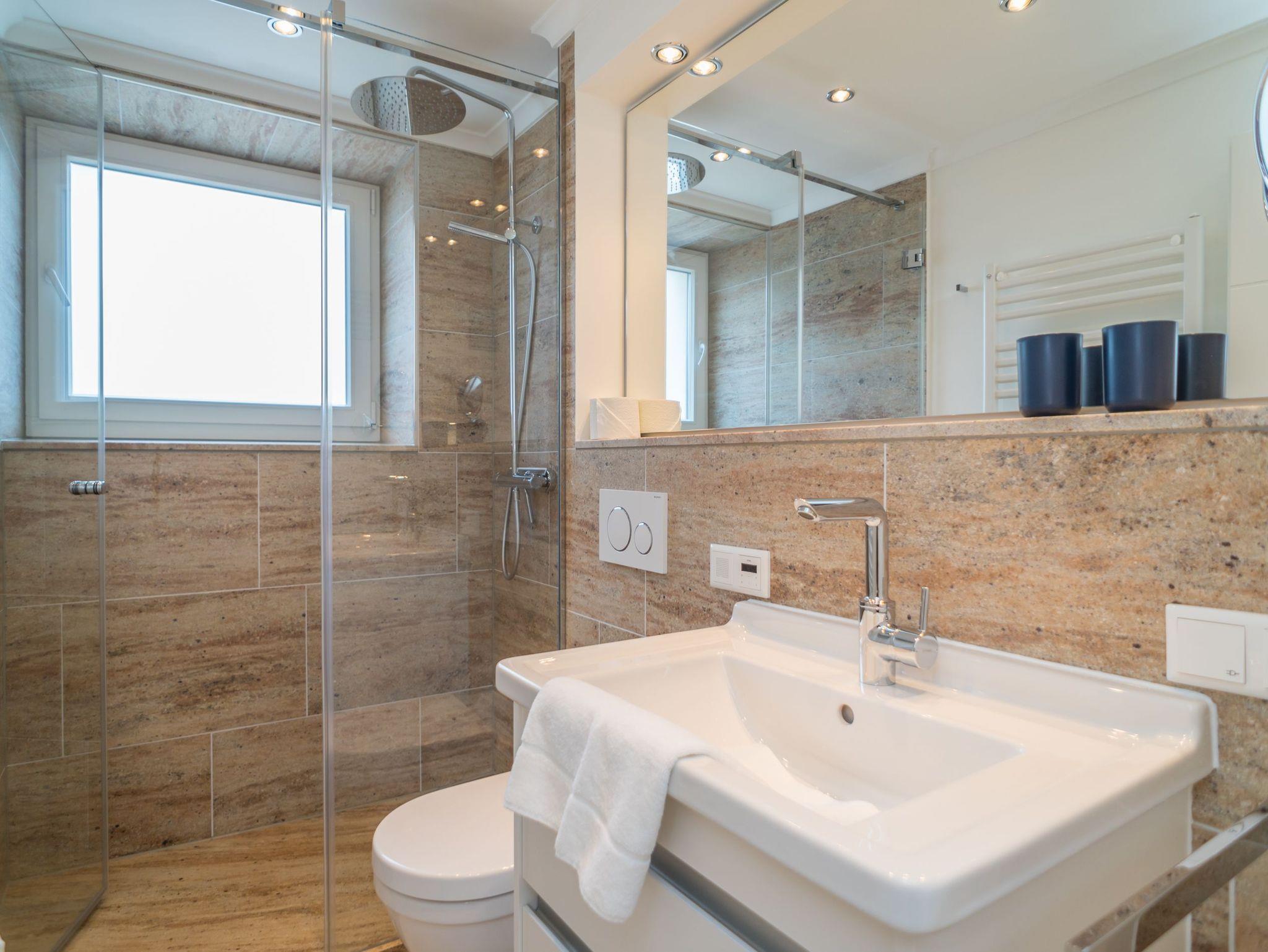 Im Bad befinden sich eine Dusche, ein WC, ein Waschtisch, ein Handtuchtrockner und ein Fenster.