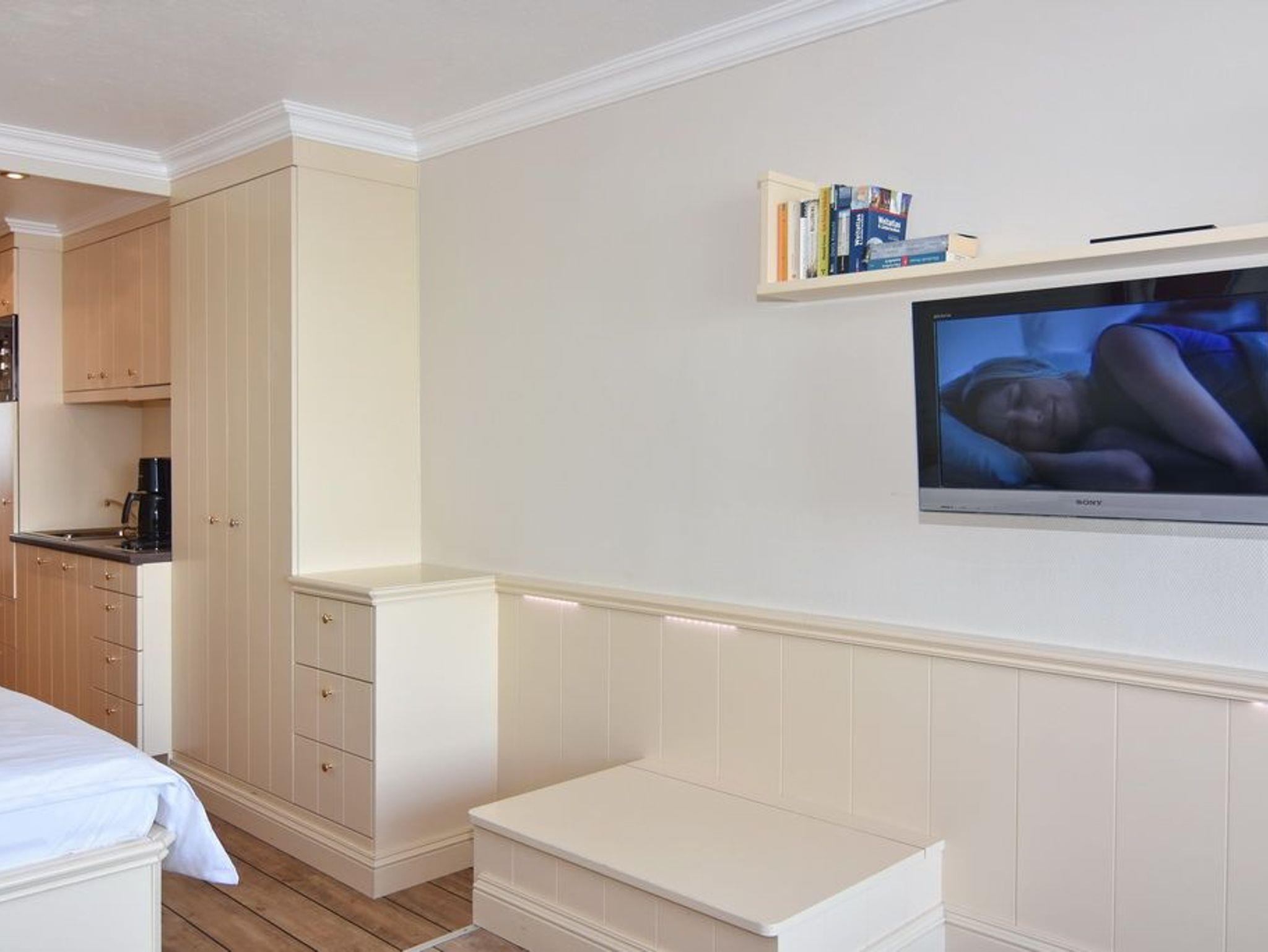 Schöne 1-Zimmer-Ferienwohnung im Haus Sylter Welle, 4.OG, ca. 25 qm; Nichtraucher-Whg.![nbsp][nbsp]Uneingeschränkter Meeresblick. Heller Wohn-/Schlafraum mit Doppelbett (140*200) und Westbalkon zur Seeseite, erhöhter Essplatz (Achtung Stufe) mit herrlichem Meeresblick, 2-Sitzer-Couch, Flat-TV, Radio, W-Lan (ohne Gewähr), Duschbad / WC, hübsche Küchenzeile mit Geschirrspüler und Mikrowelle. Bettwäsche und Handtücher sind zur Anreise aufgezogen. Ein PKW-Stellplatz kann kostenpflichtig zugebucht werden.