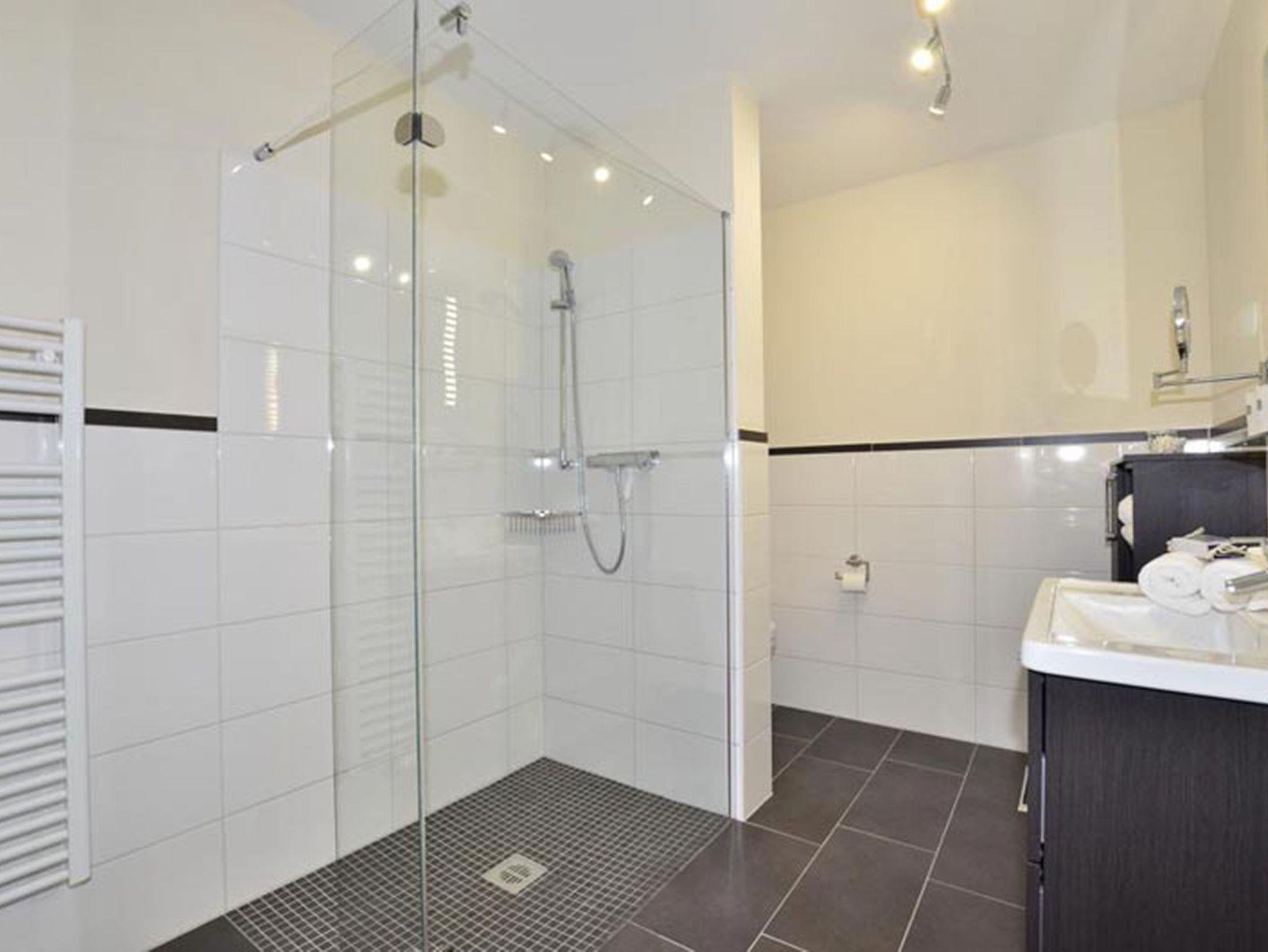 Das großzügige Badezimmer punktet mit einer bodengleichen, großen Dusche, einem modernen Waschtisch, WC, Handtuchtrockner, Fön und einem beleuchteten Kosmetikspiegel alles durchdacht und hochwertig umgesetzt.
