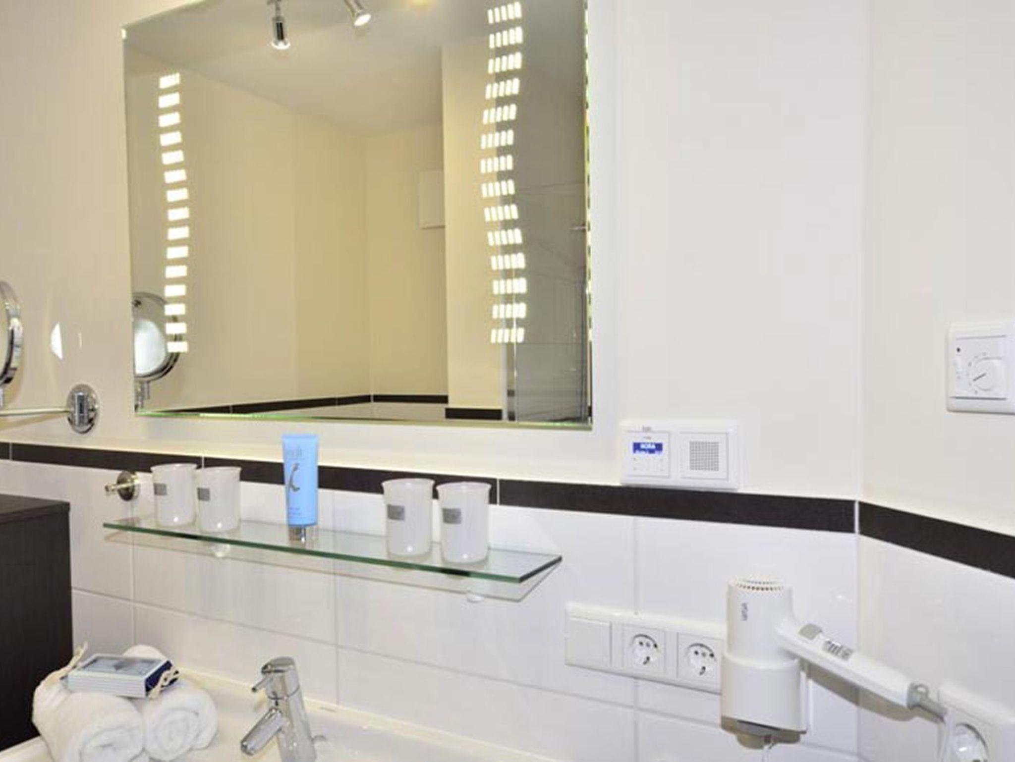Das großzügige Badezimmer punktet mit einer bodengleichen, großen Dusche, einem modernen Waschtisch, WC, Handtuchtrockner, Fön und einem beleuchteten Kosmetikspiegel ? alles durchdacht und hochwertig umgesetzt.