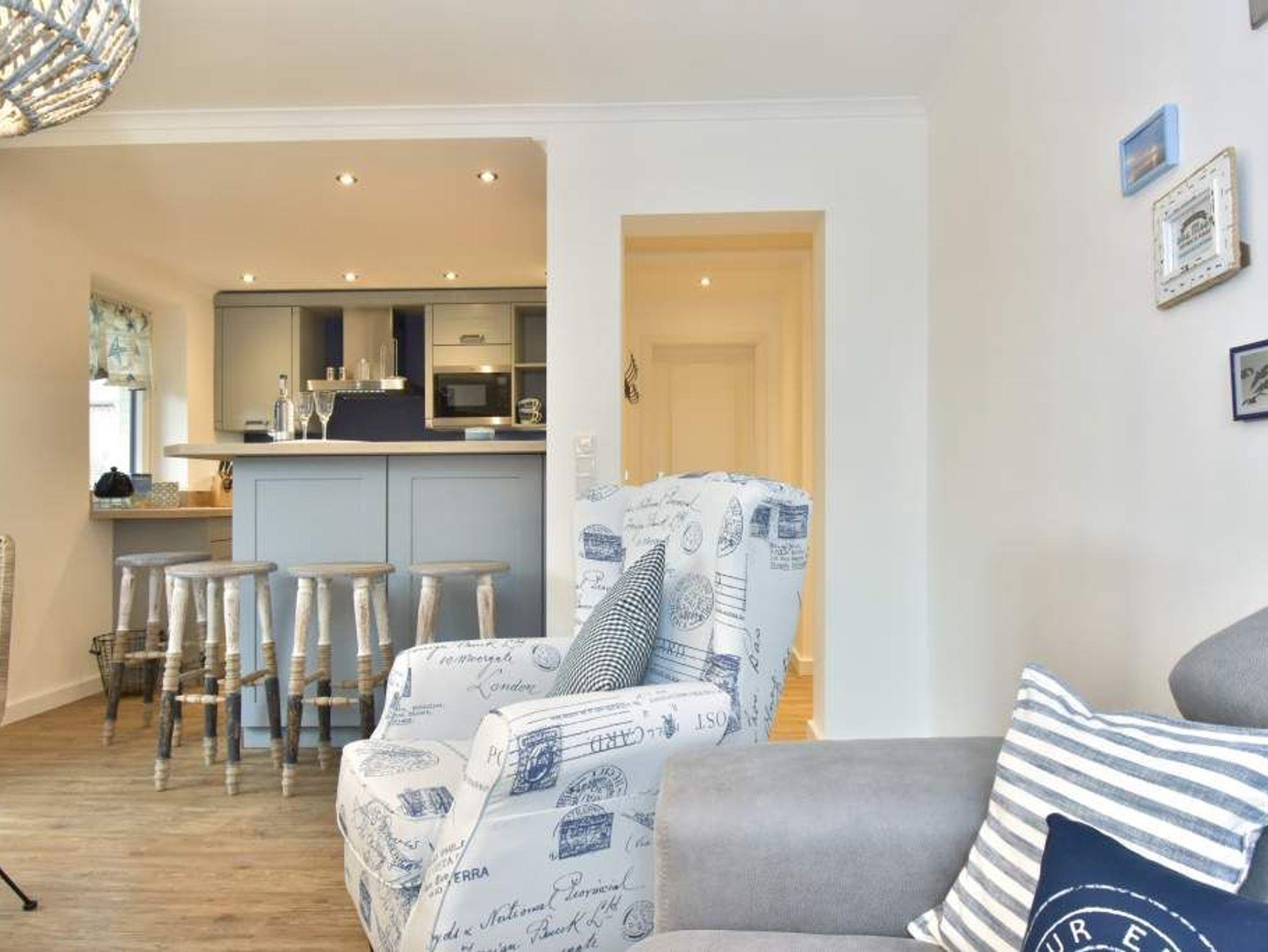 Vom Vorflur gelangt man direkt ins neue Duschbad/WC (extraflacher Duscheinstieg, Handtuchtrockner, Bidet, Waschtisch [&] Föhn) und ein paar Schritte weiter in den gemütlichen Wohnraum (Ecksofa, verlängerbarer Esstisch, Kinderstuhl, Kabel-Flachbild-TV, WLAN [&] Internet-Radio [&] kostenfreie Telefonie ins dt. Festnetz (o. Gewähr)). Der mit einer großzügigen Theke anschließende, offene Küchenbereich lädt auch mal zur Zubereitung eines umfangreicheren Menüs ein (Geschirrspüler, Backofen-/Mikrowellenkombination, 4-flammiges Ceran-Kochfeld, großer Kühlschrank mit 3*-Gefrierfach) und hält eine Kaffee- [&] Nespresso-Maschine, Wasser- [&] Eierkocher sowie einen Toaster als Grundausstattung für Sie bereit.