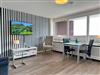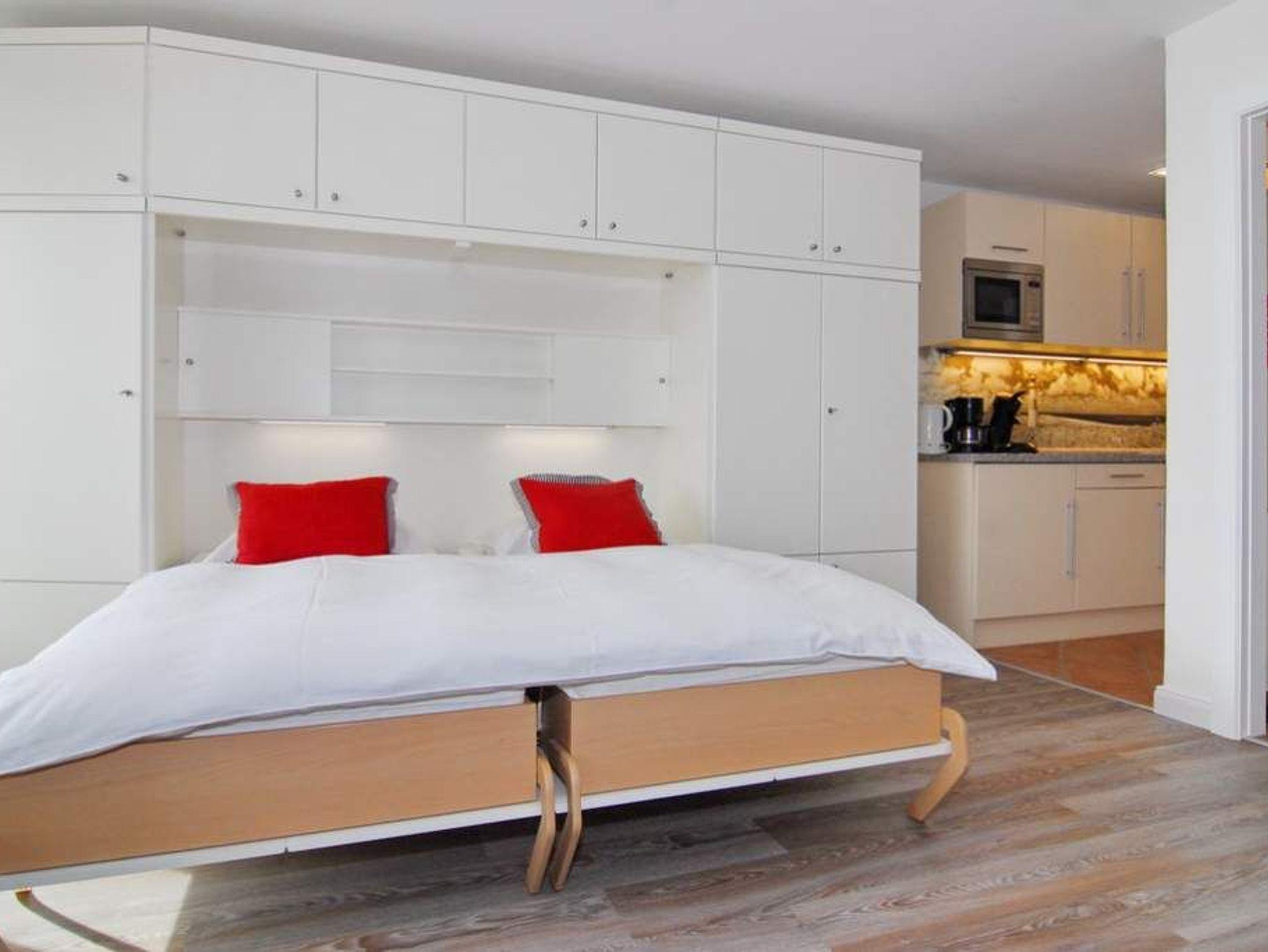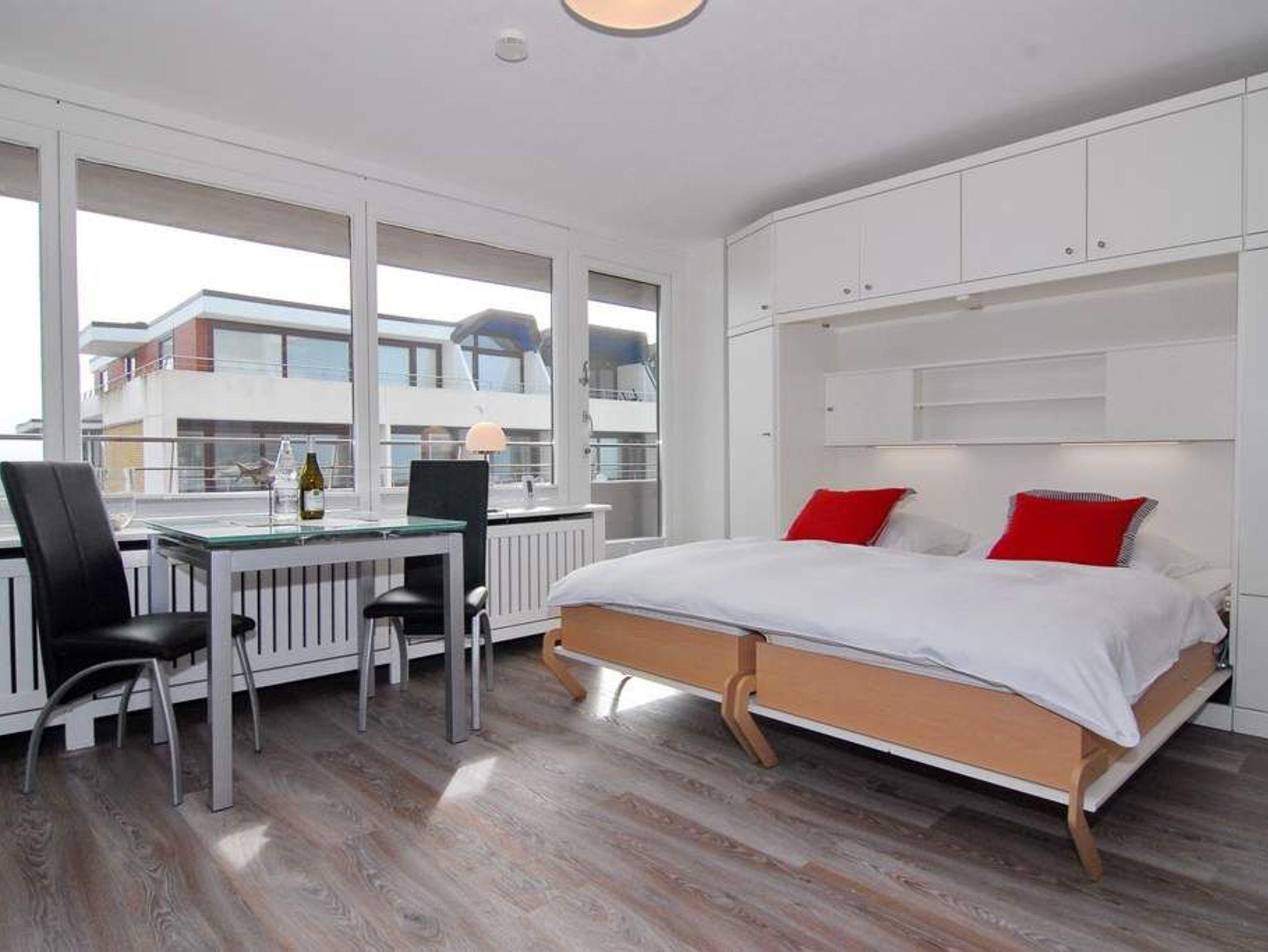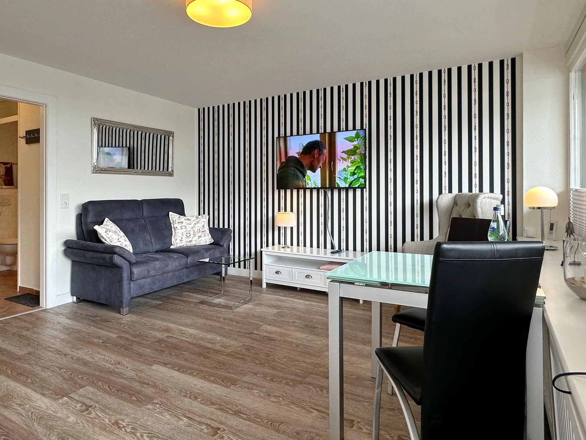 Komfortable 1-Zimmer-Wohnung im 7. OG zur Landseite im Haus Metropol, ca. 38m². Wohn- / Schlafraum mit Einzelschrankbetten, 2-Sitzer-Couch und Sessel, Essplatz am Fenster mit Blick über die Insel, Flat-TV mit Radio, W-LAN ohne Gewähr, offene Küche mit Geschirrspüler und Mikrowelle, Ostbalkon mit Balkonmöbeln, Duschbad/WC. Die Wohnung ist mit Design-Boden ausgelegt. Tierhaltung und Rauchen im Apartment ist nicht gestattet.Bettwäsche und Handtücher sind zur Anreise aufgezogen. Ein PKW-Stellplatz kann kostenpflichtig zugebucht werden.
