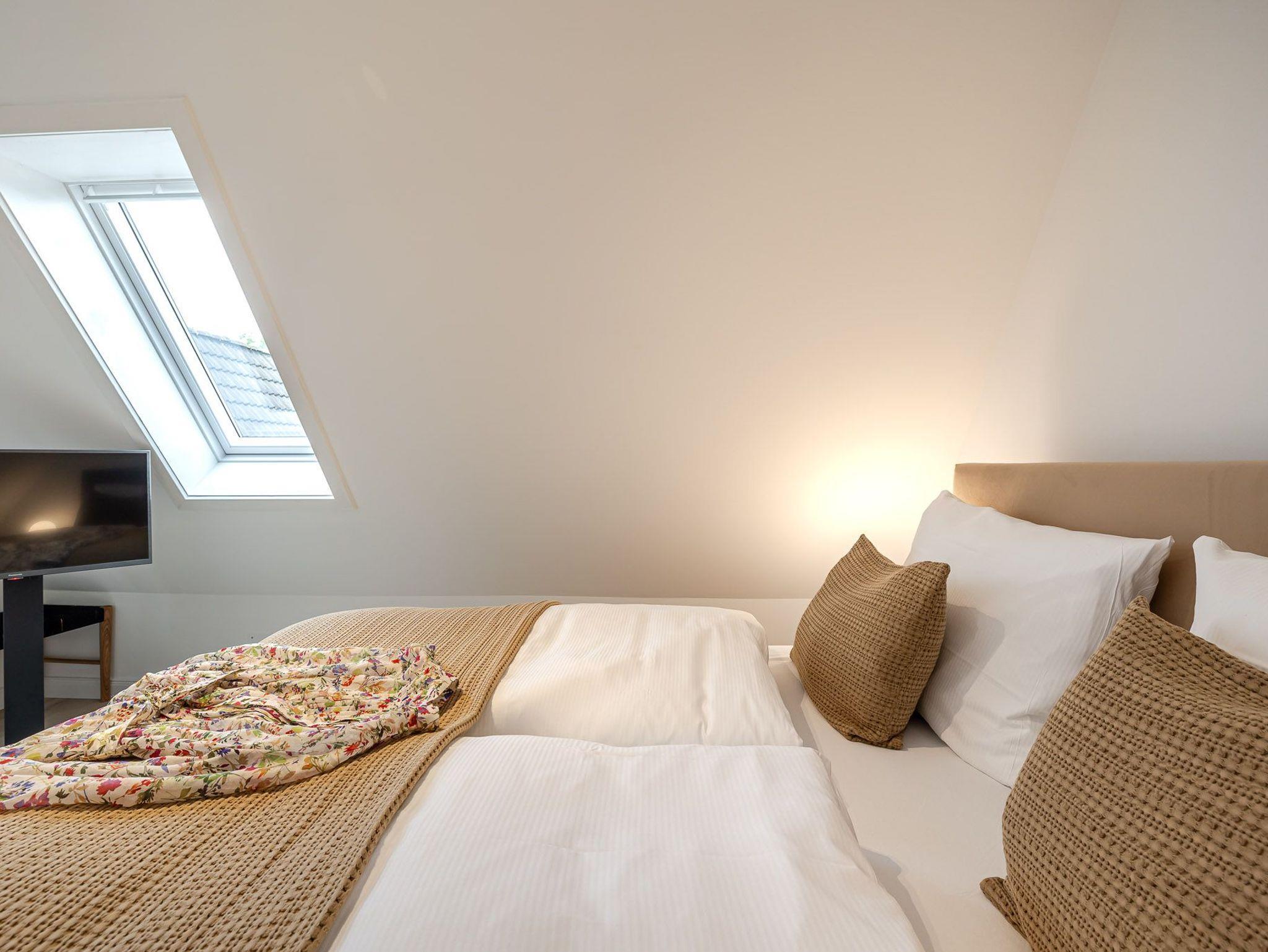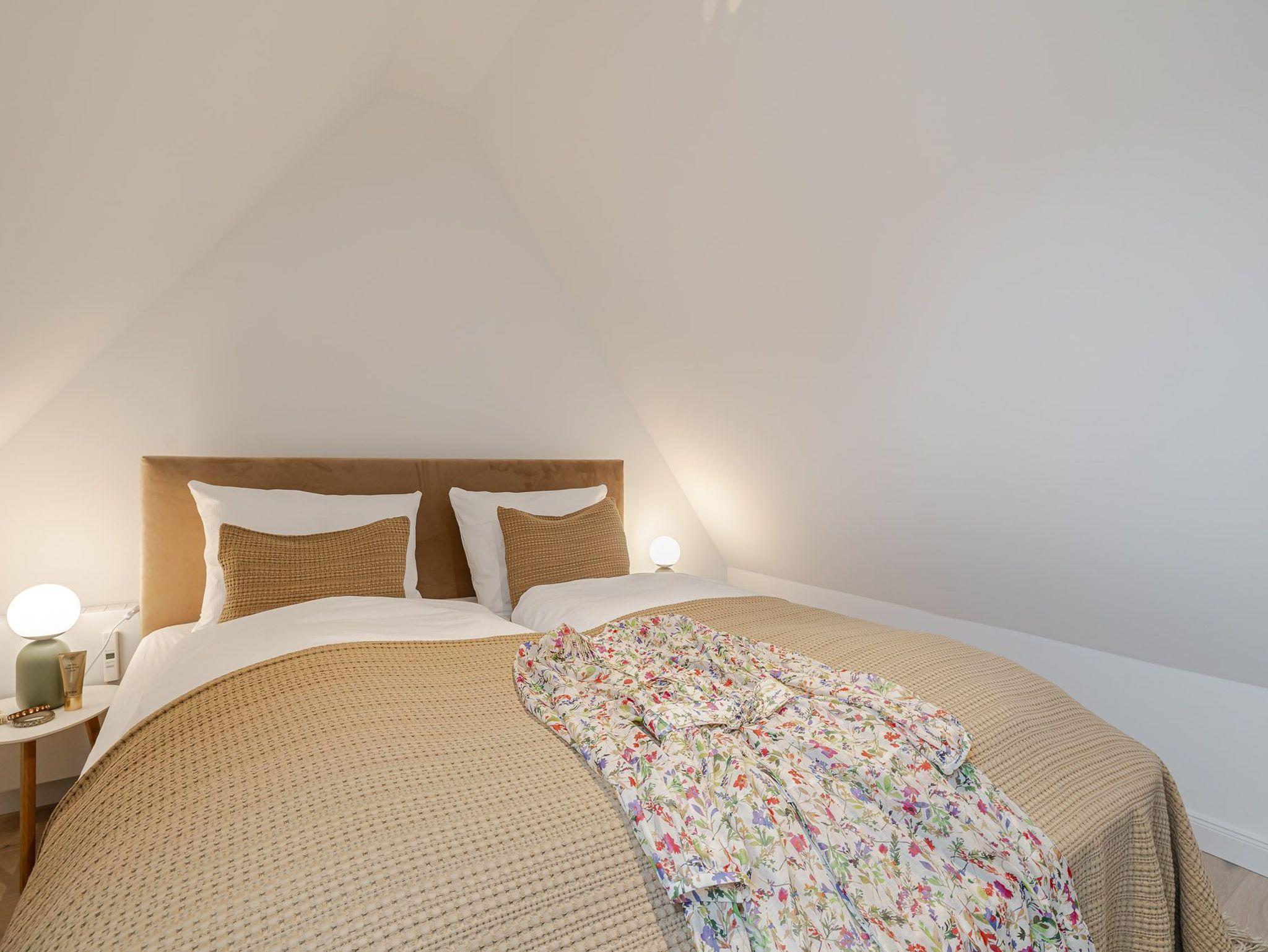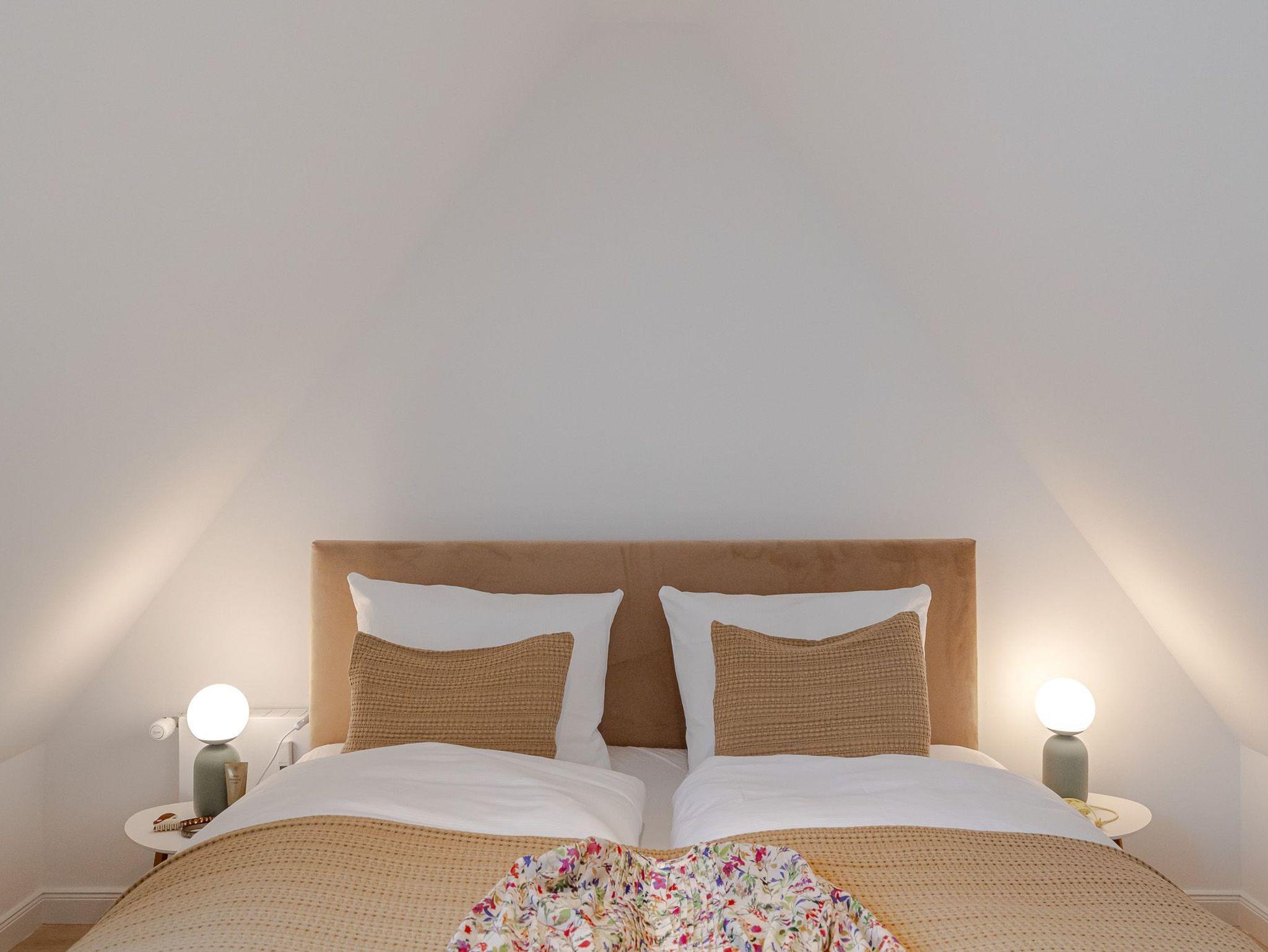 Zum gemütlichen Schlafzimmer gelangen Sie über die Treppe. Dort angekommen, erwartet Sie ein herrlich komfortables Boxspringbett der Marke Schramm, welches eine ruhige Nacht und schöne Träume garantiert.