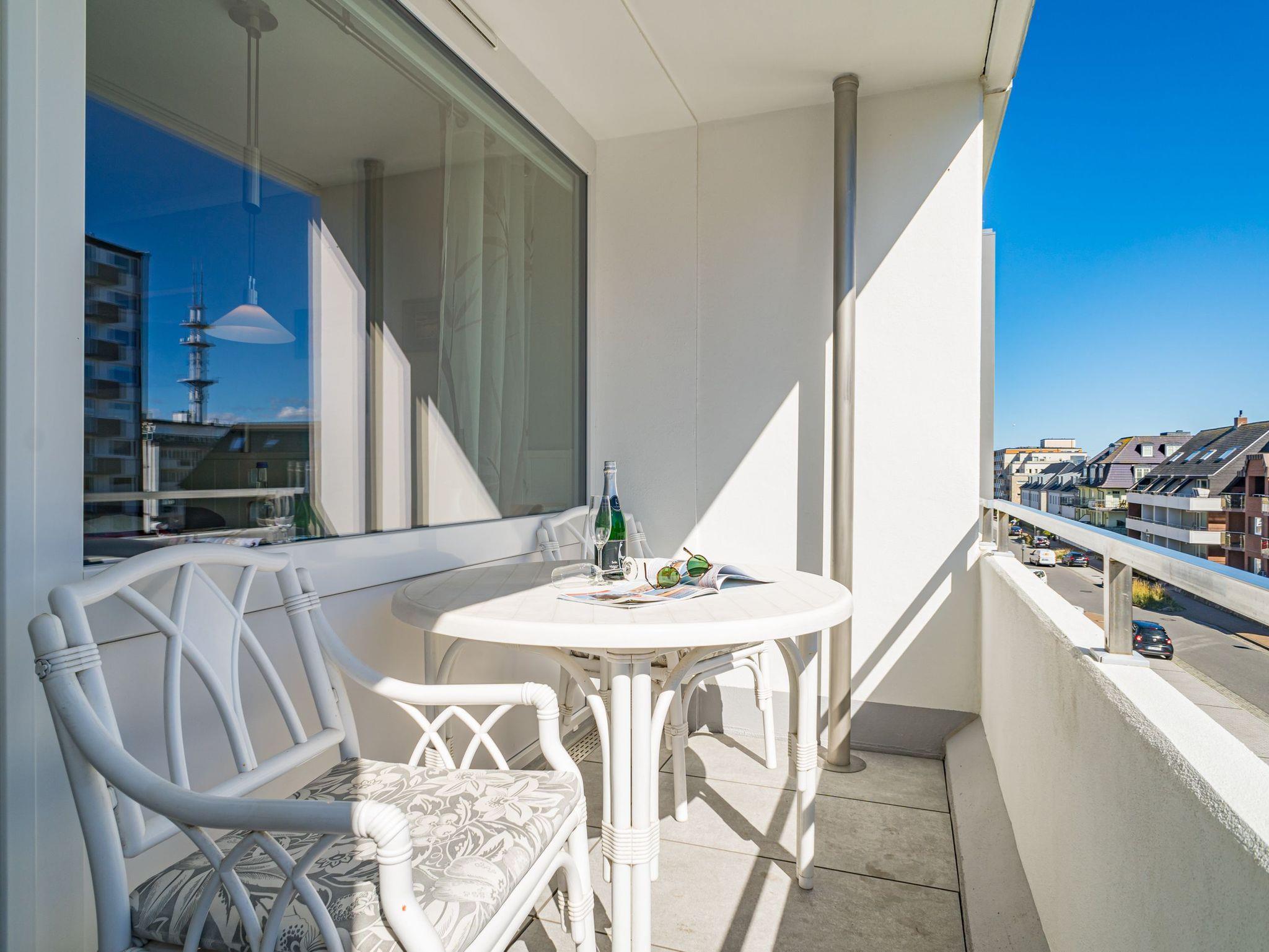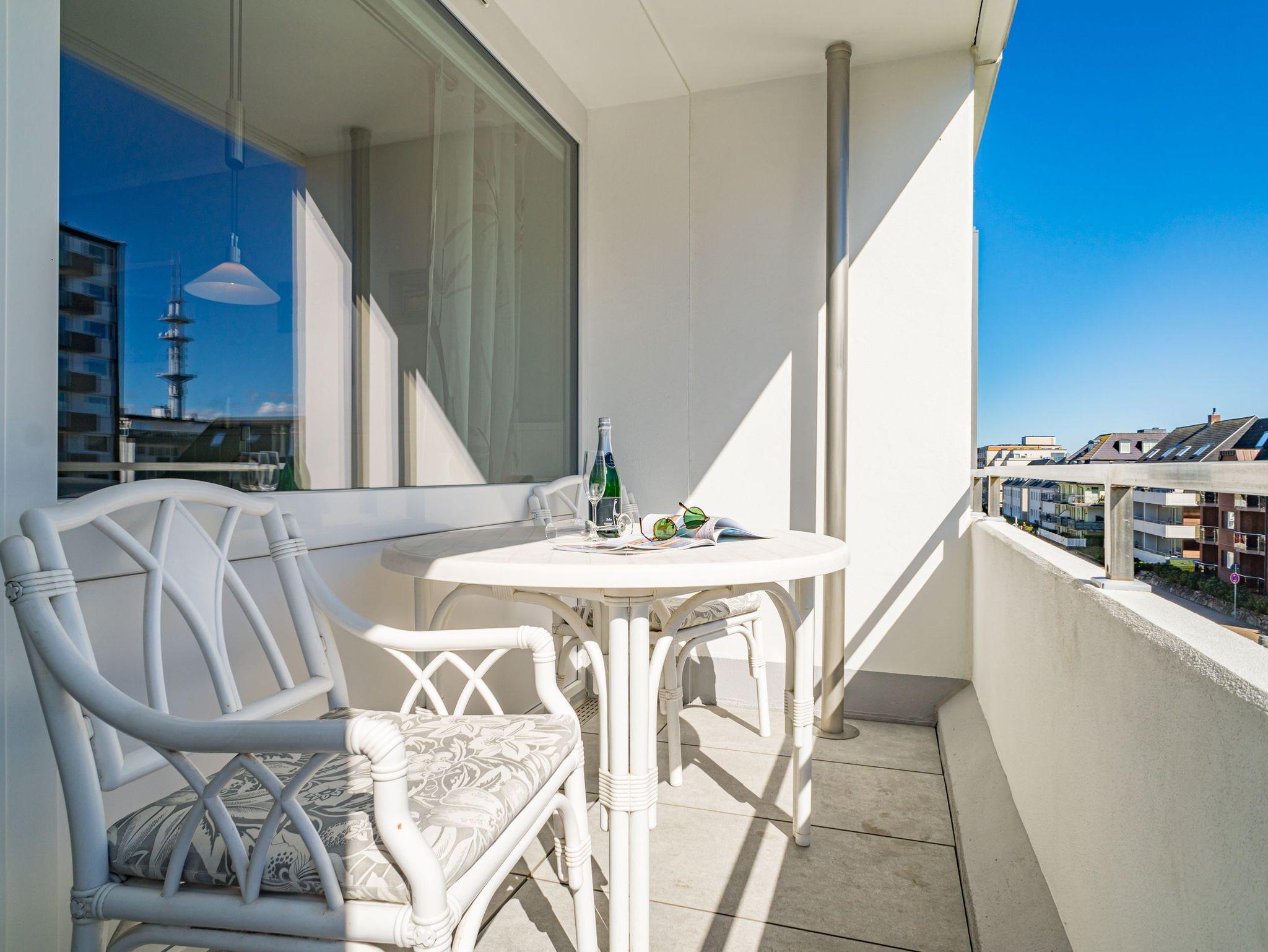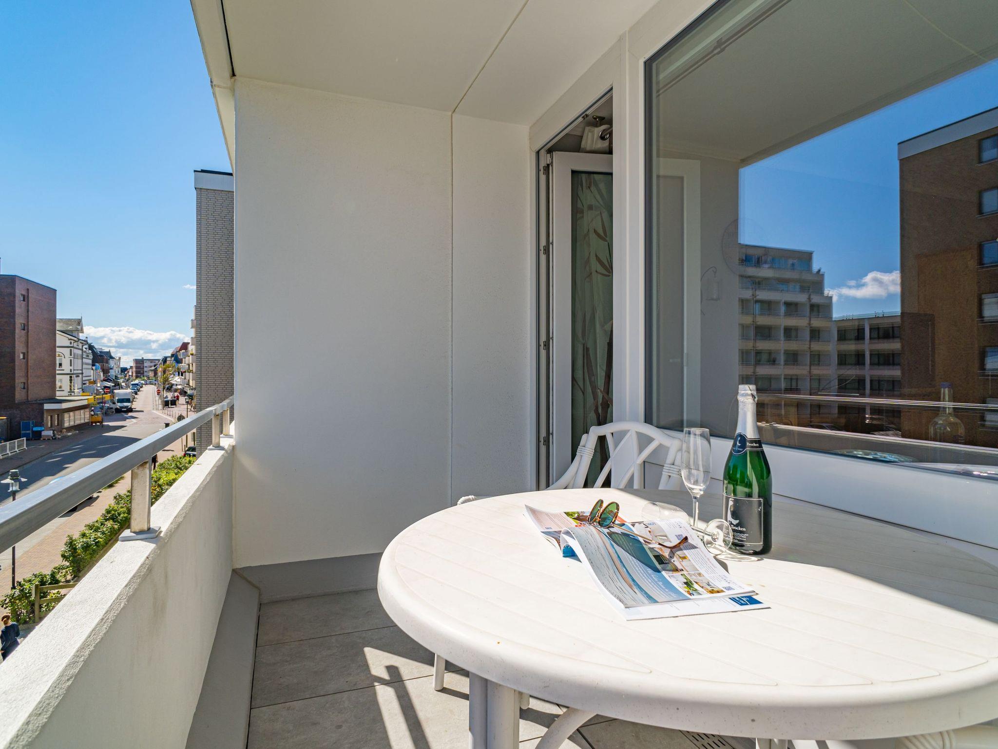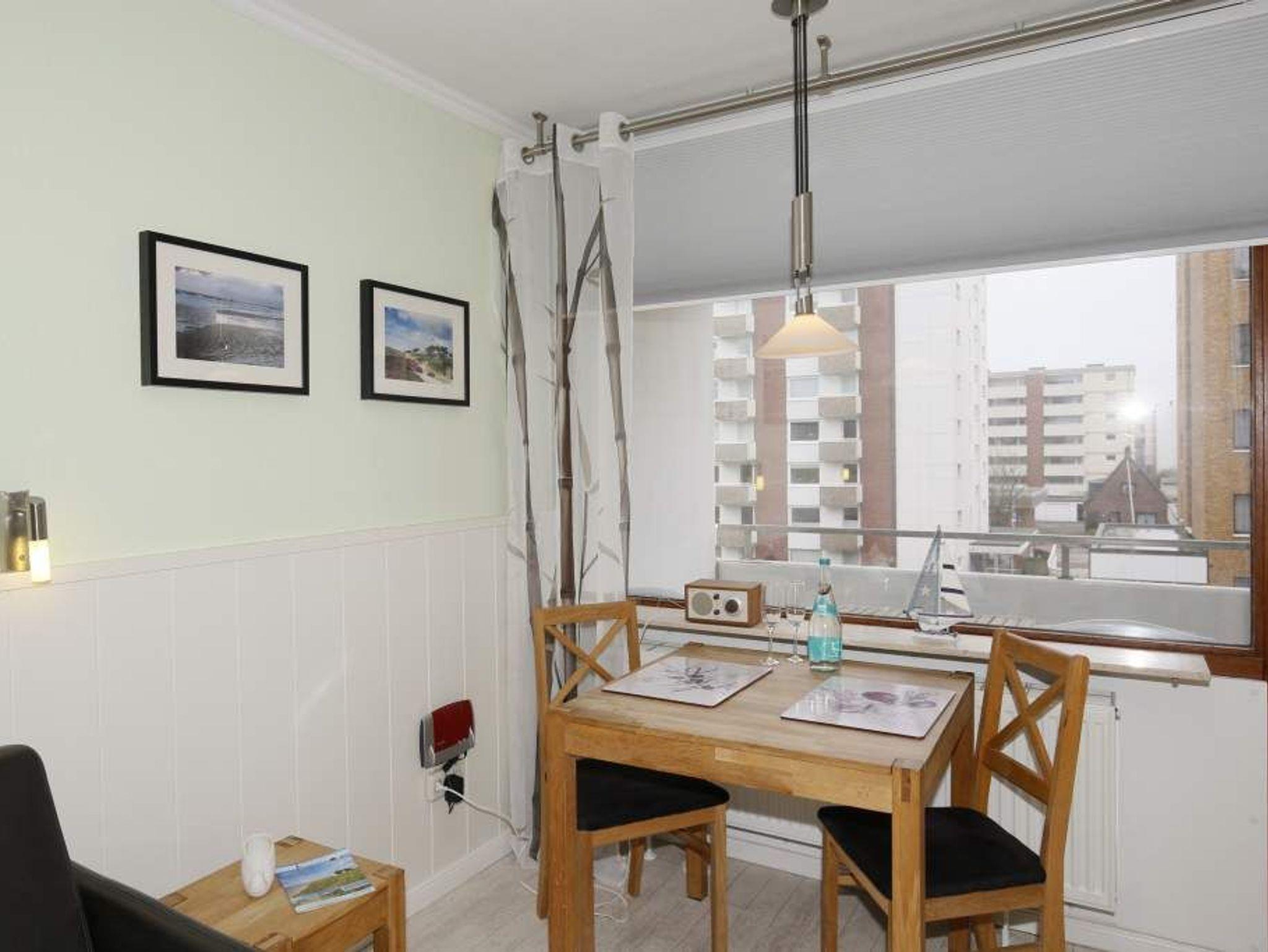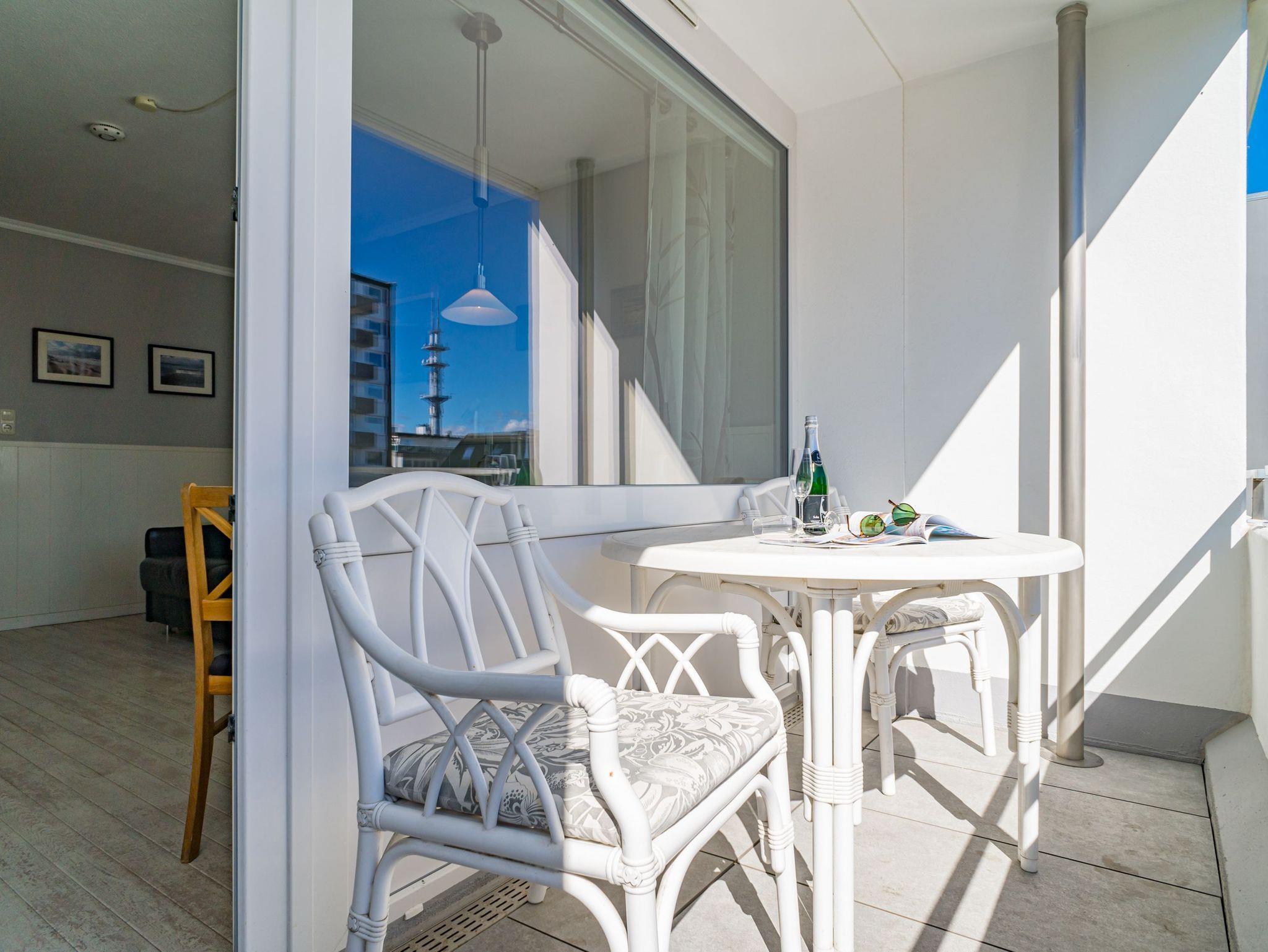 1-Zimmer-Nichtraucher-Ferienwohnung (ca. 23 qm) in der 2. Etage zur Landseite mit Ostloggia (Morgensonne, mit Balkonmöbeln und Auflagen) für max. 2 Personen.
