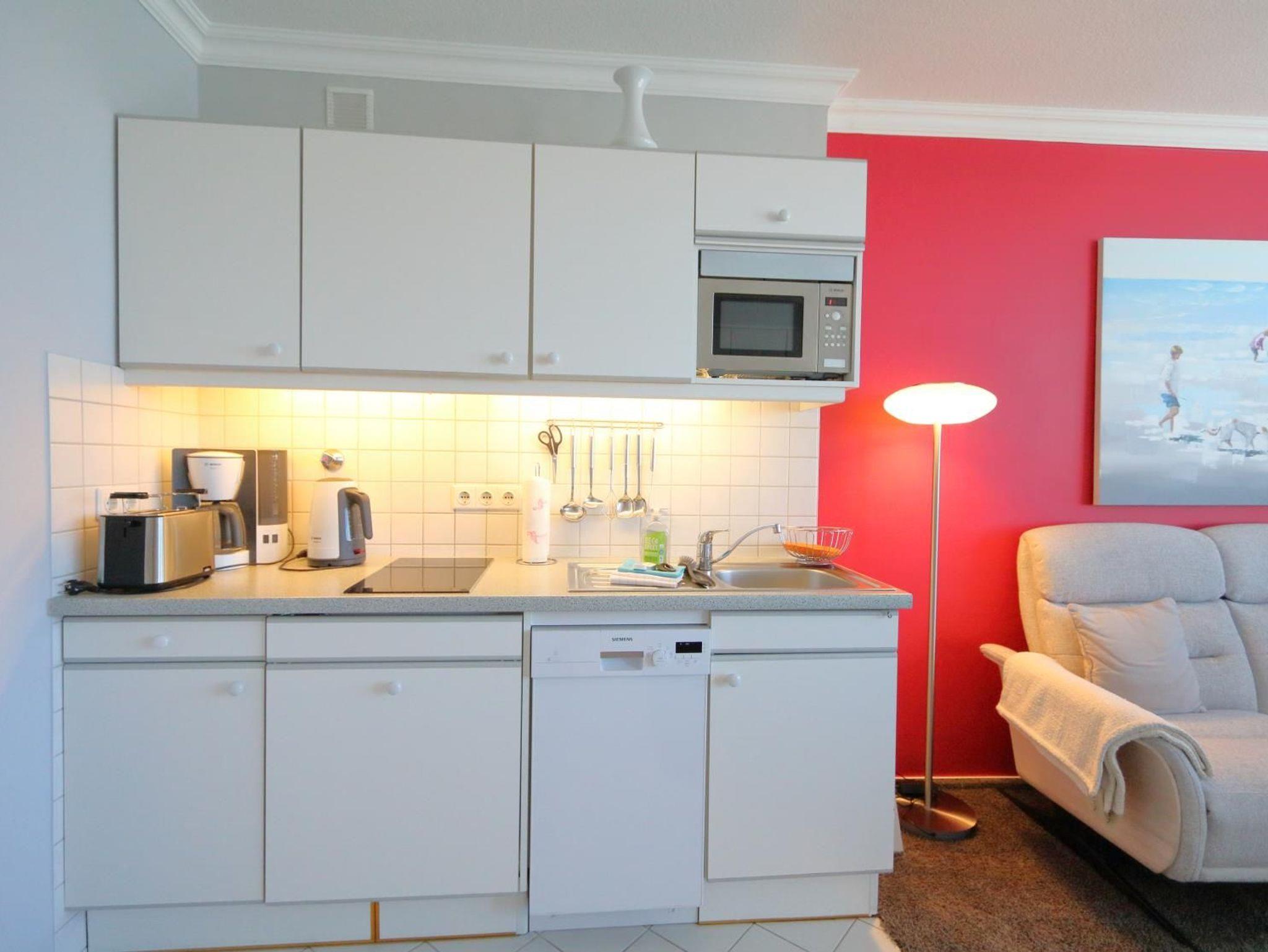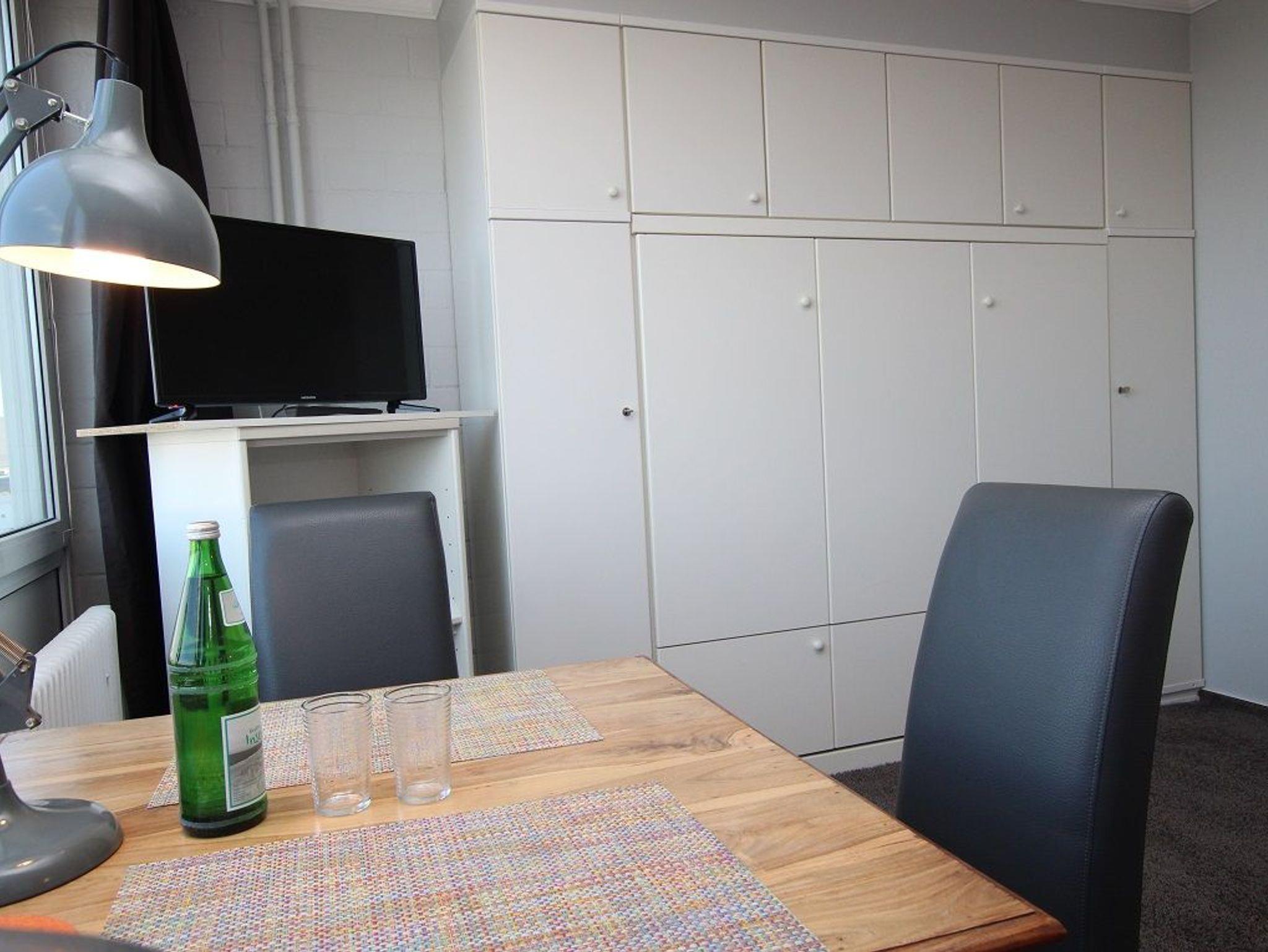 Ausstattung: Im Wohnzimmer des Appartements stehen eine Couch und, vor dem Fenster, der Essplatz. In einer Schrankwand ist das Doppelschrankbett untergebracht. Die Küchenzeile mit Mikrowelle und Geschirrspüler ist zum Wohnzimmer hin offen. Das Bad hat eine Dusche. In der Wohnung gibt es W-Lan.