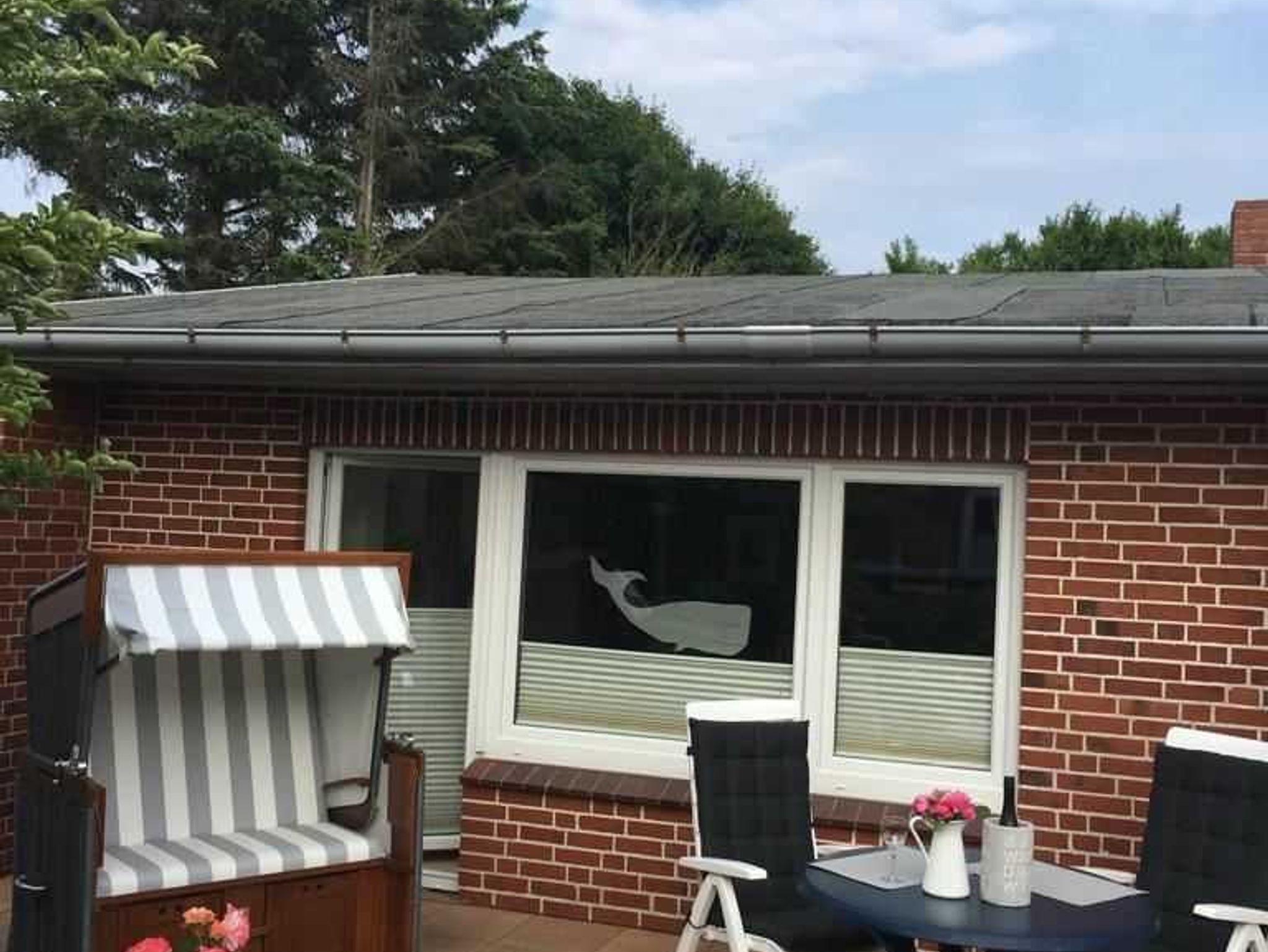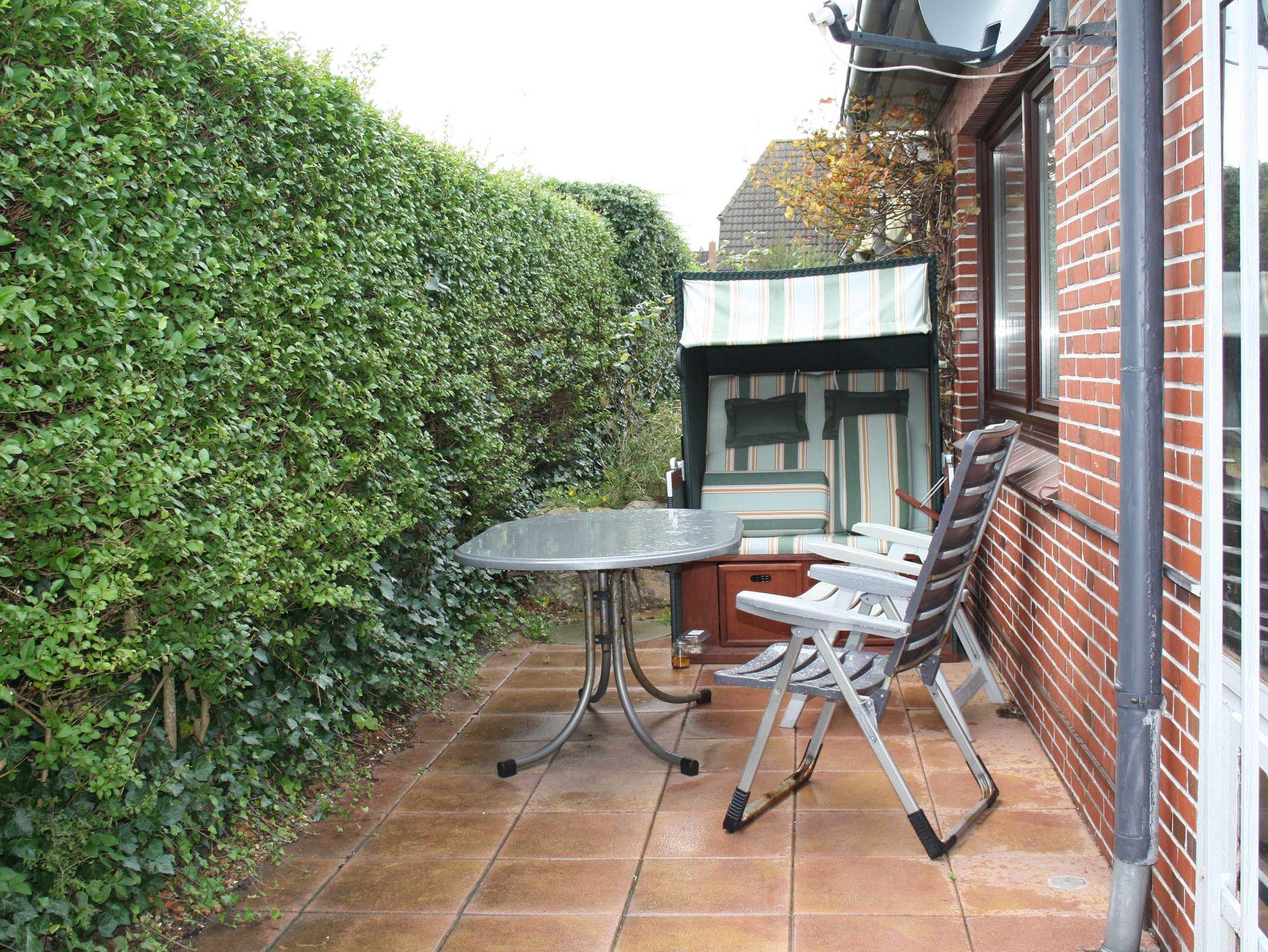 Großer Flachbildschirm im Wohnzimmer und auf der Terrasse finden Sie einen Strandkorb.